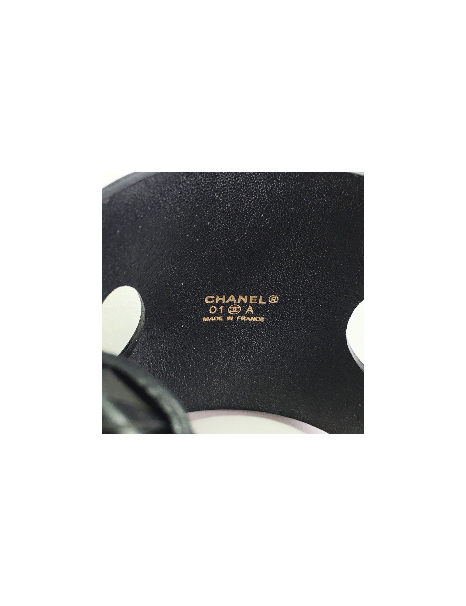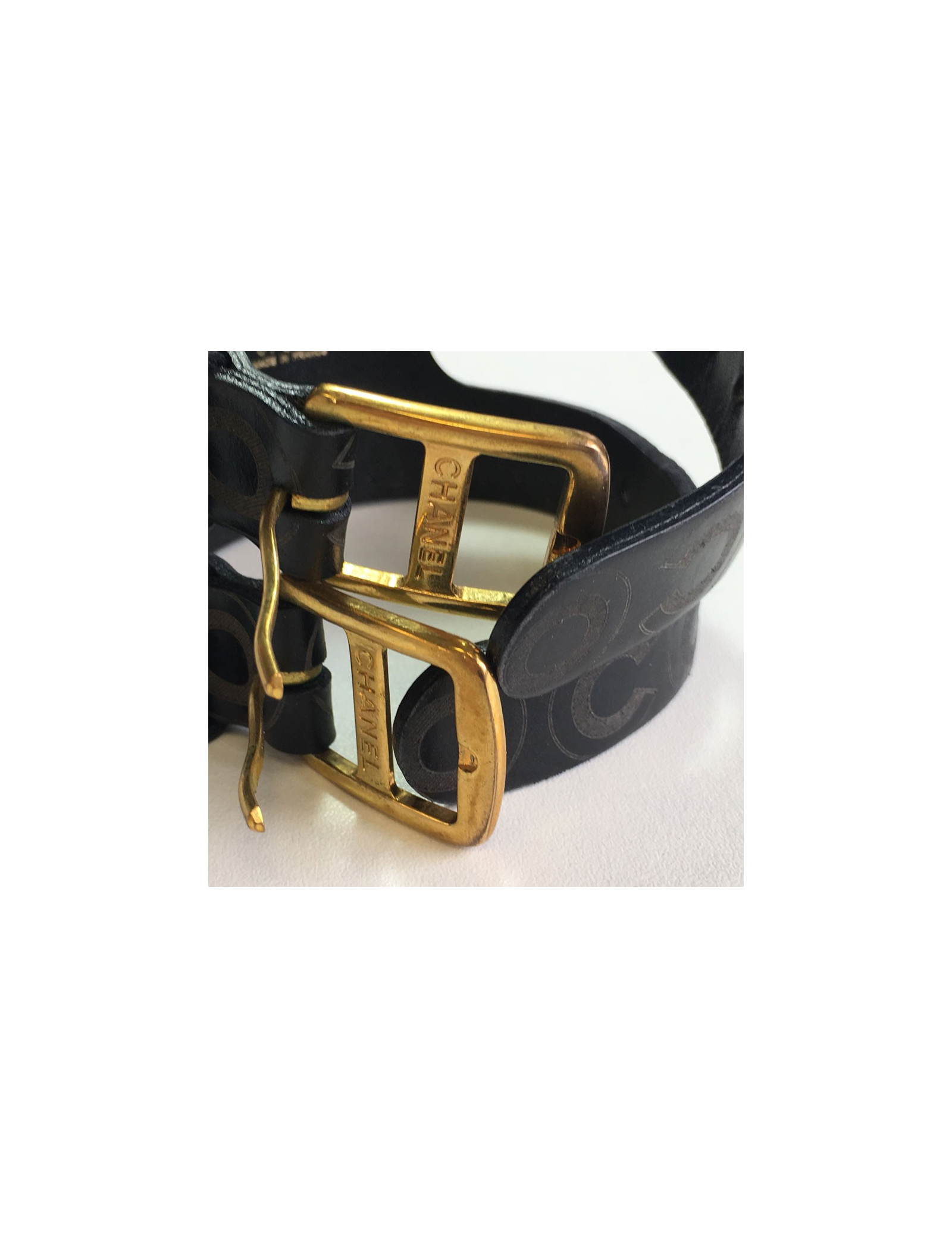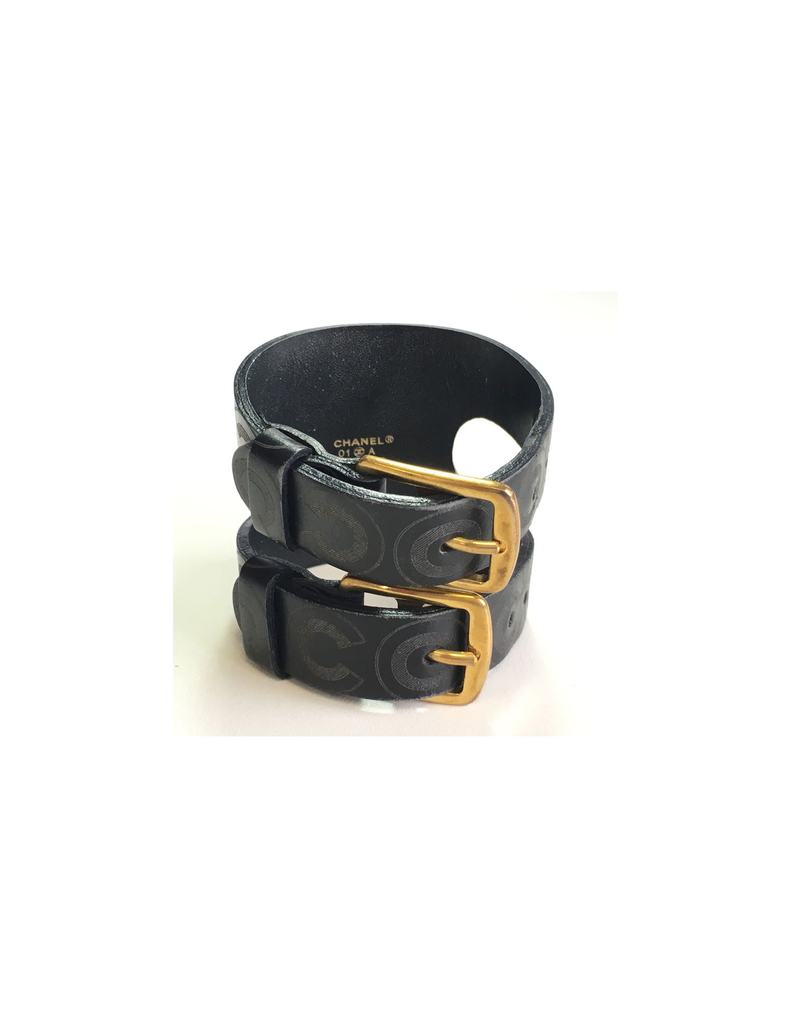 CHANEL 'Coco' cuff in black leather. Double clasp in golden brass. CHANEL registration on each loop. Adjustable size. Vintage.