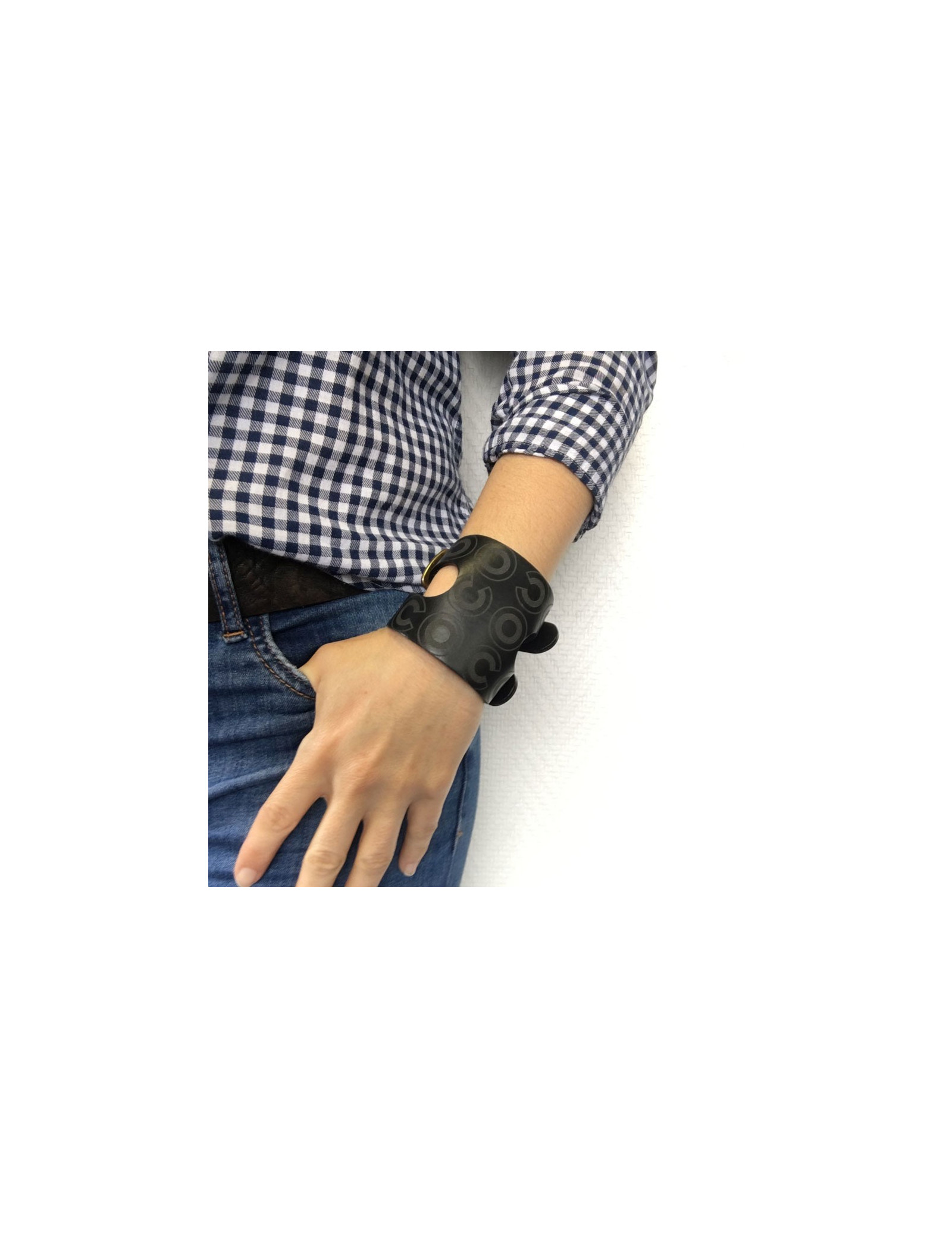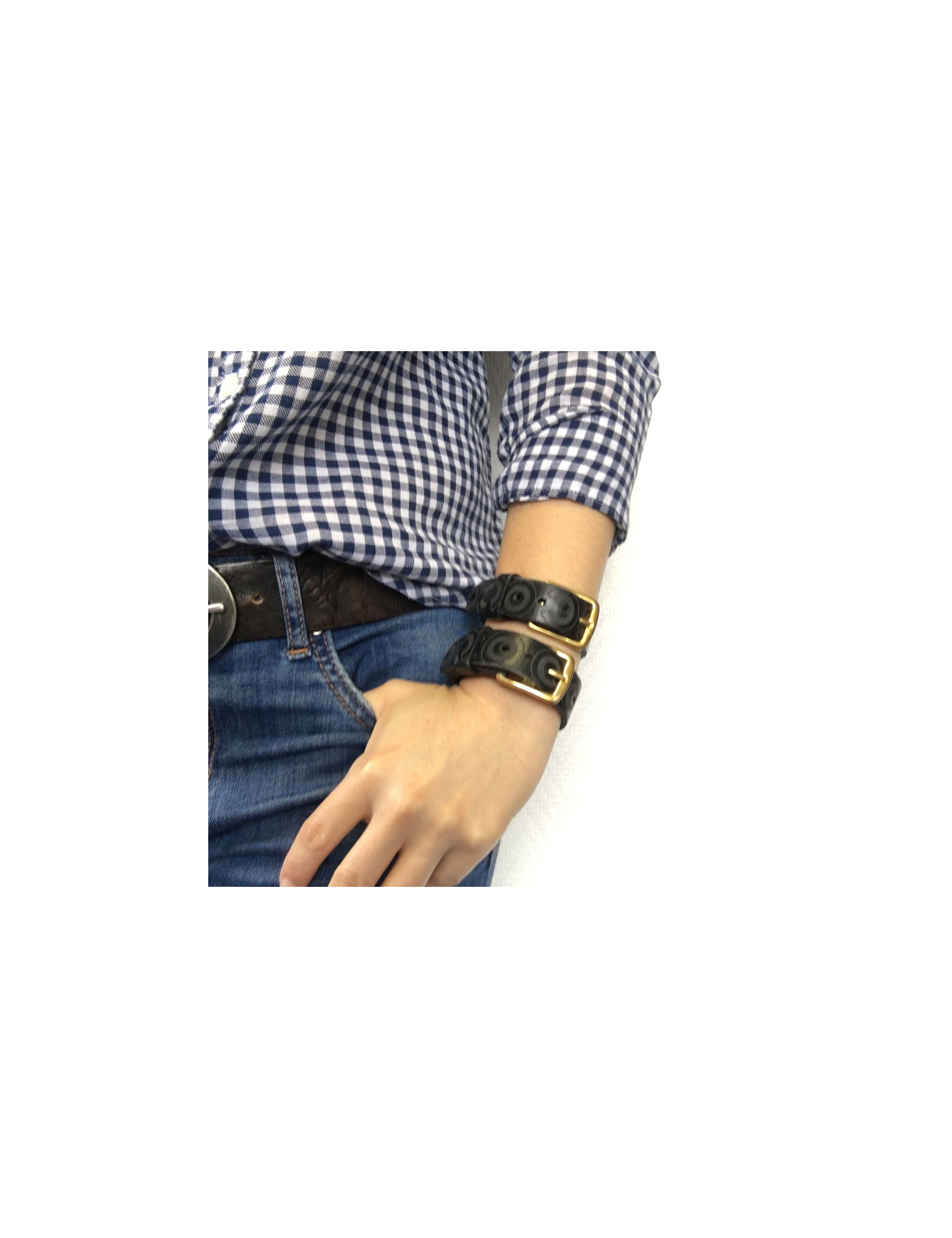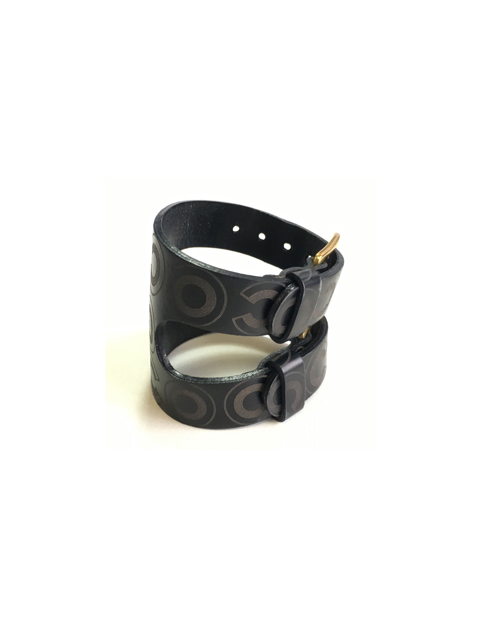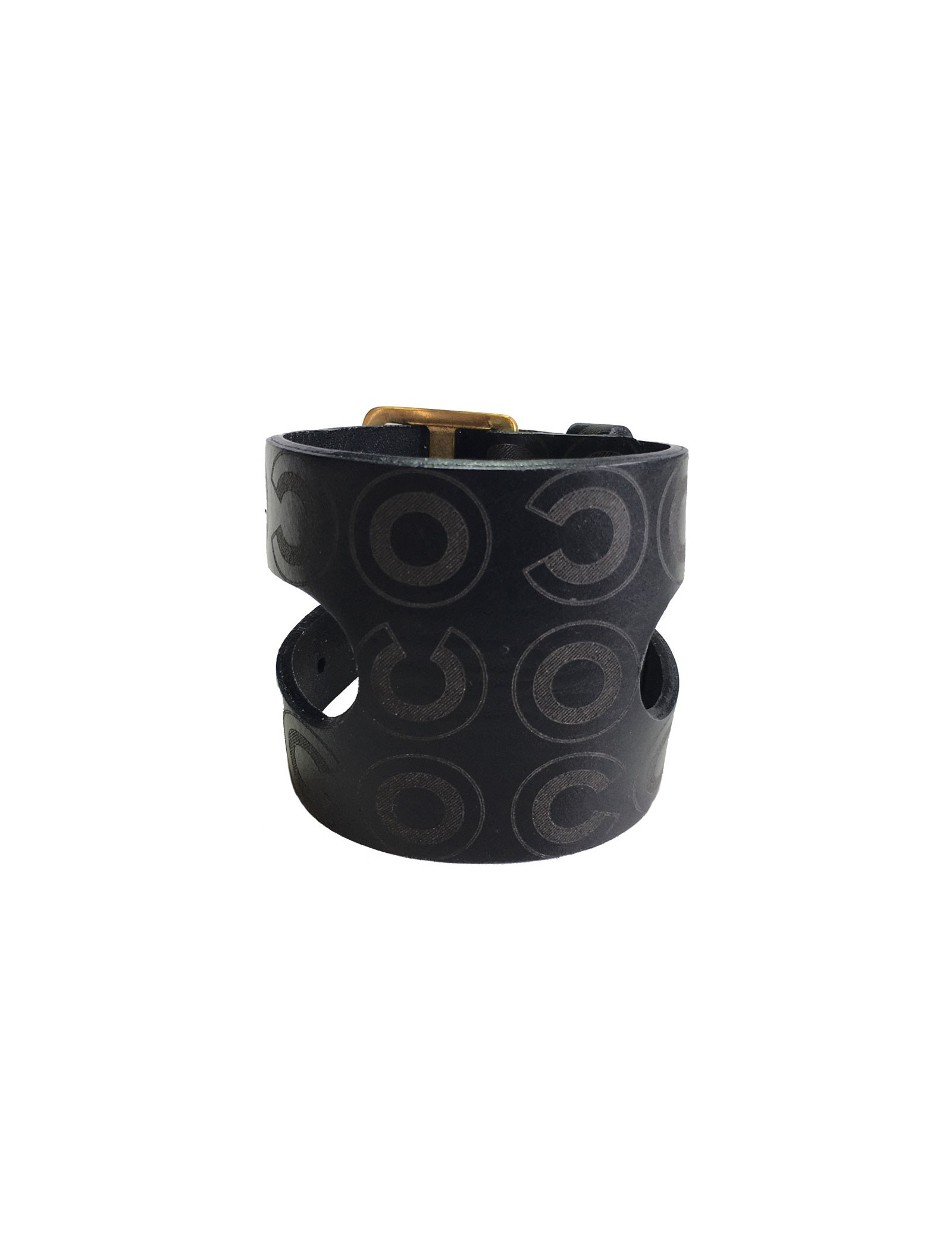 CHANEL 'Coco' cuff in black leather. Double clasp in golden brass. CHANEL registration on each loop. Adjustable size. Vintage.