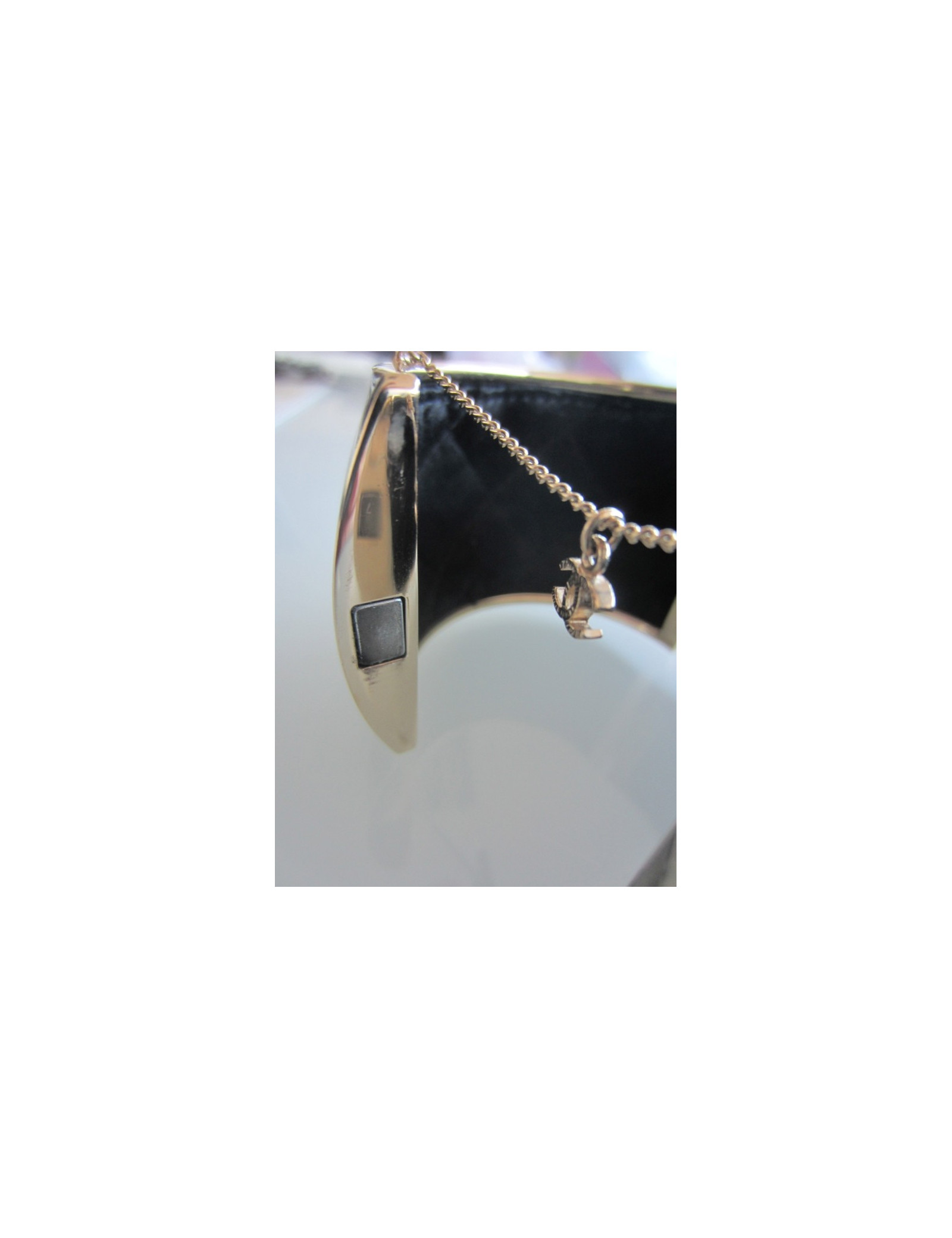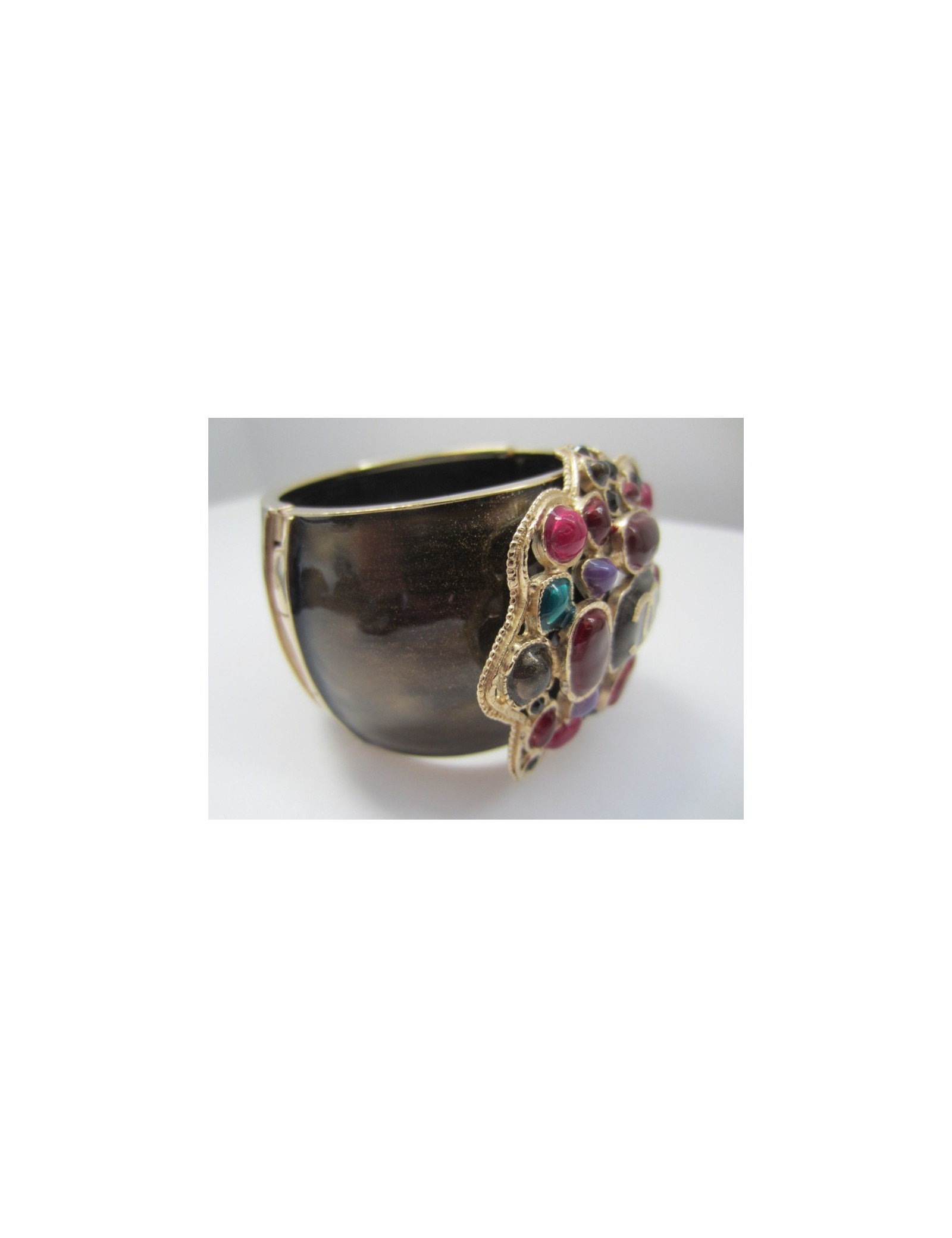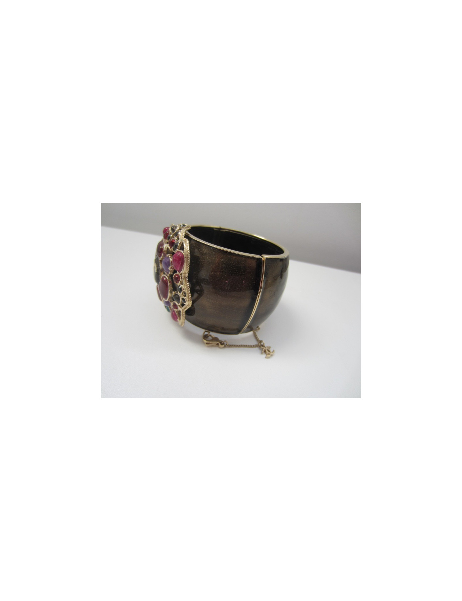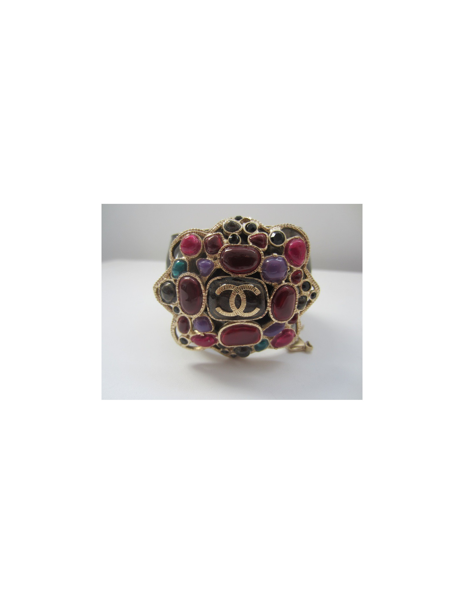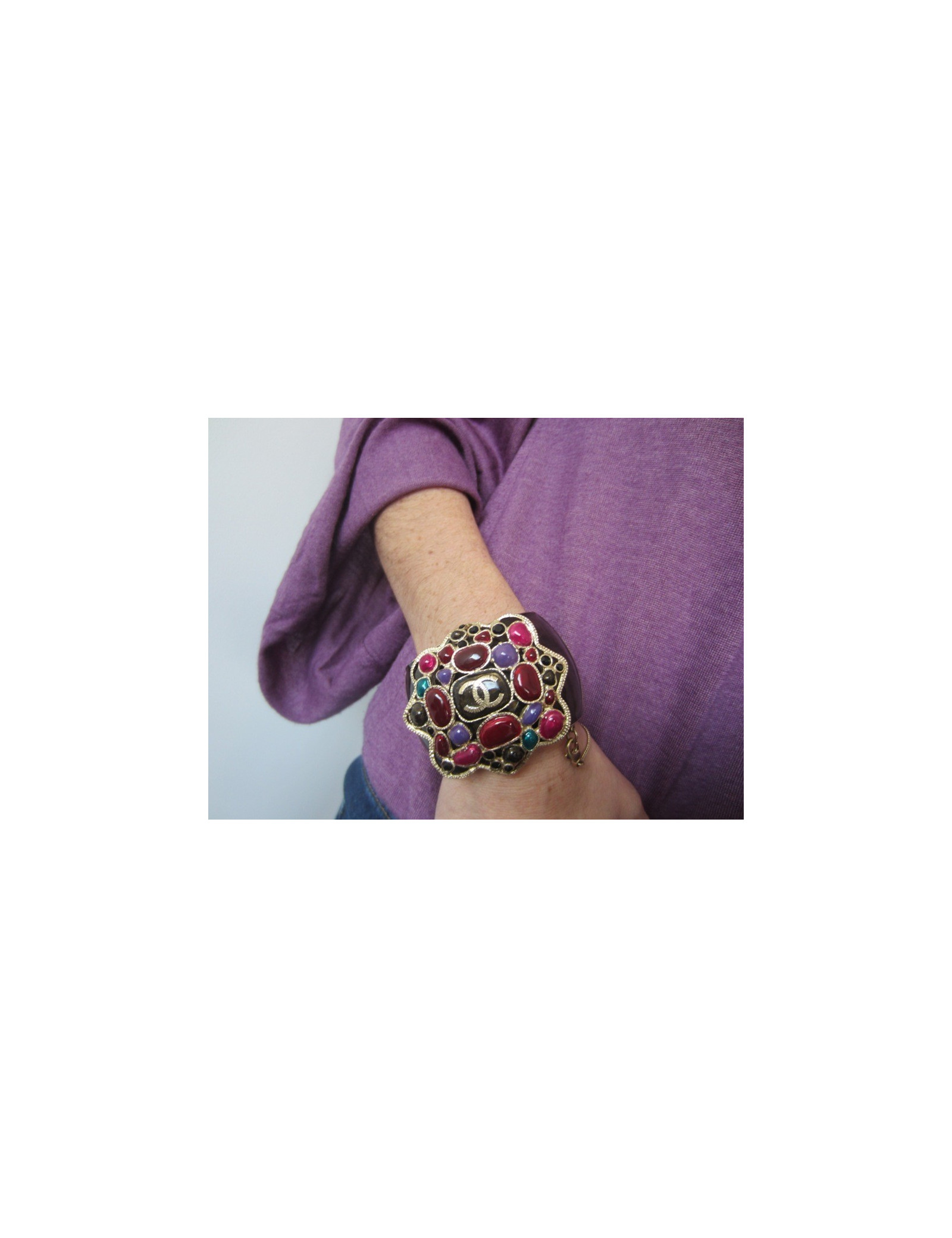 Chanel cuff caramel with a big gem glass fuschia, purple, Green & Black faceted Pearl. Sublime jewel, the Interior is quilted fabric, a small chain of security, it is closed by a magnet.