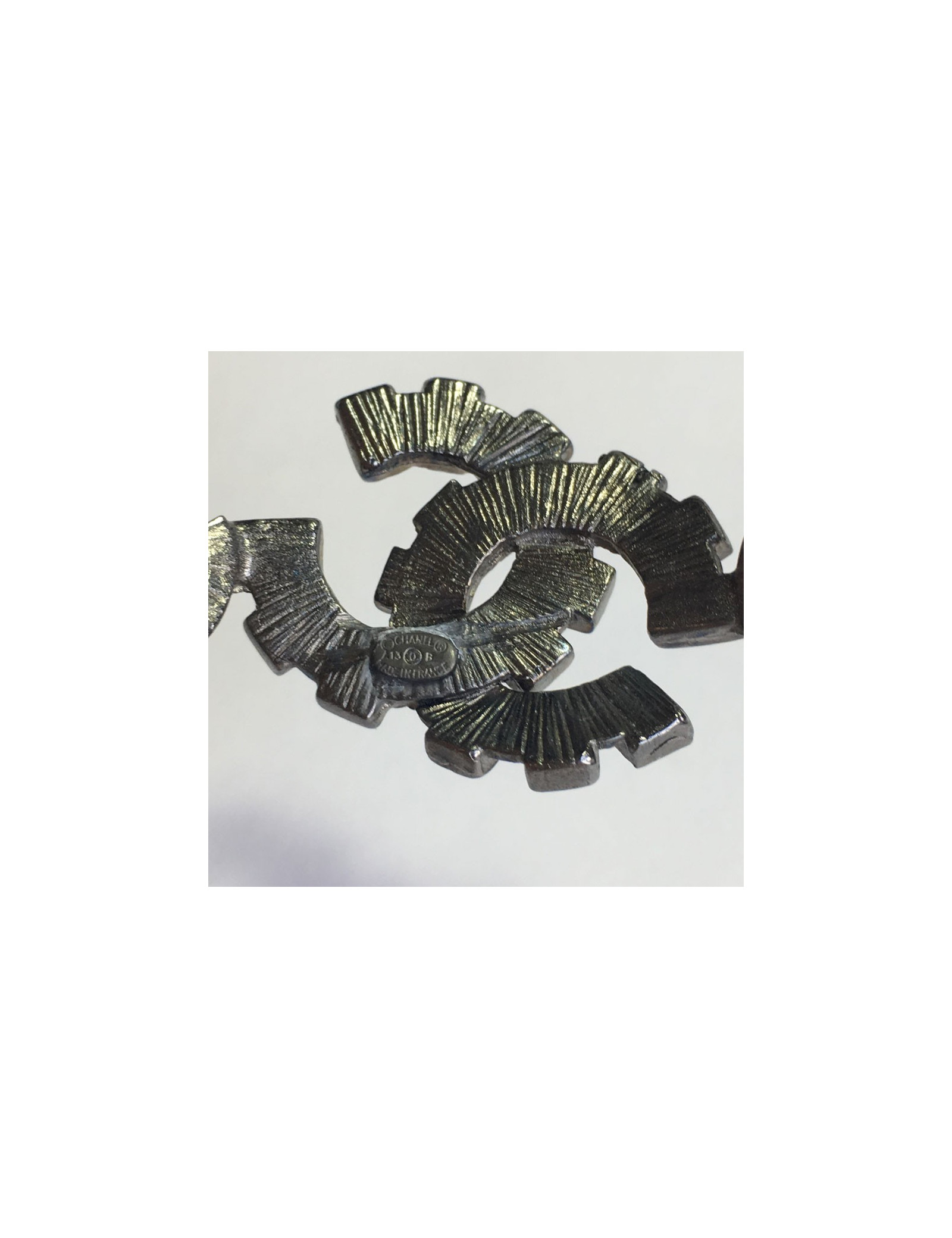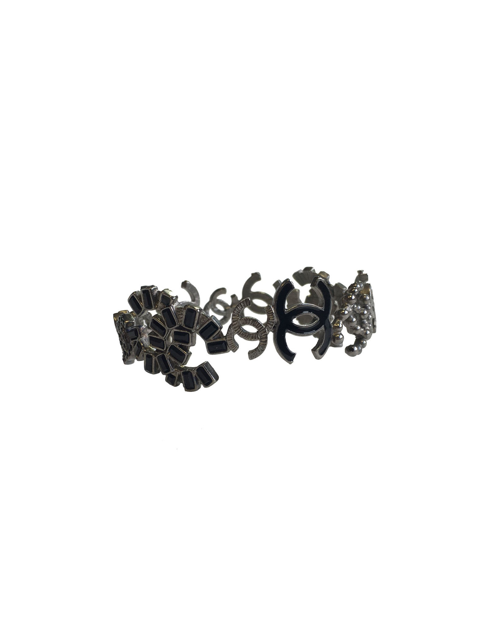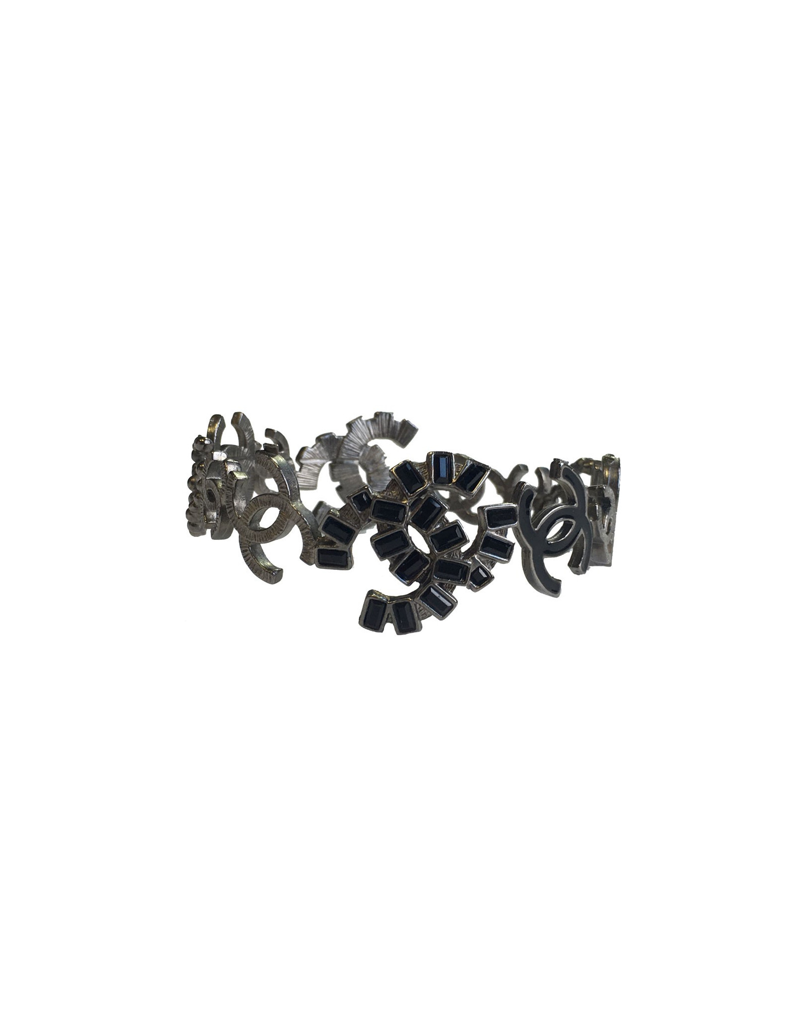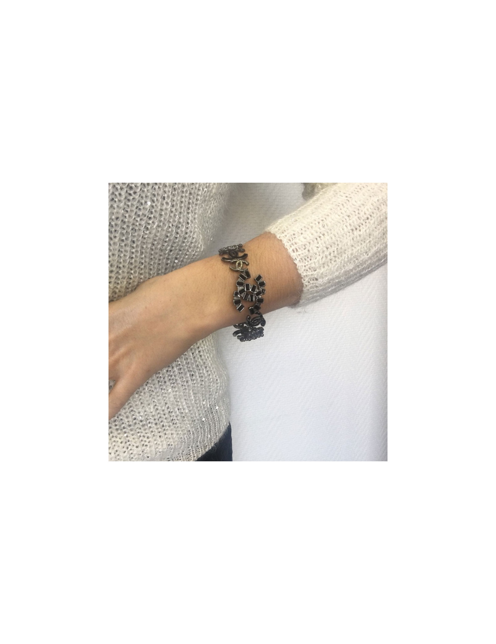 Superbe bracelet CHANEL CC de toutes tailles en métal ruthénium. Les CC sont sertis de strass noirs, strass baguette, résine noire. Certains CC sont en métal argenté.