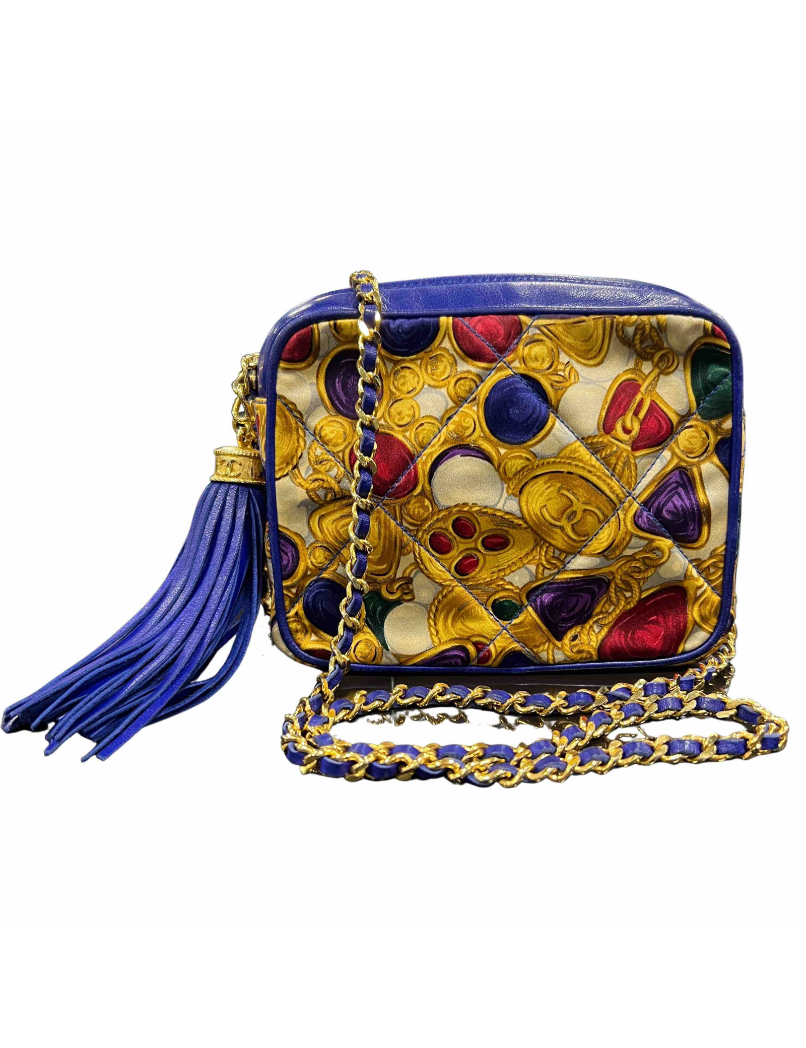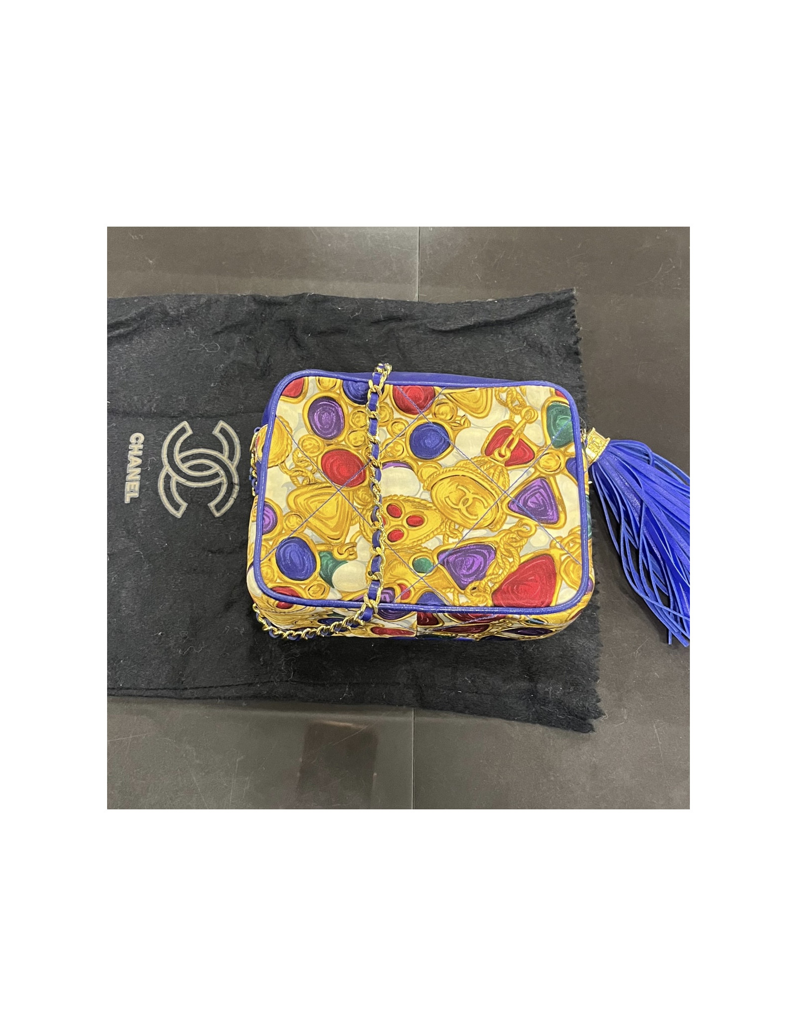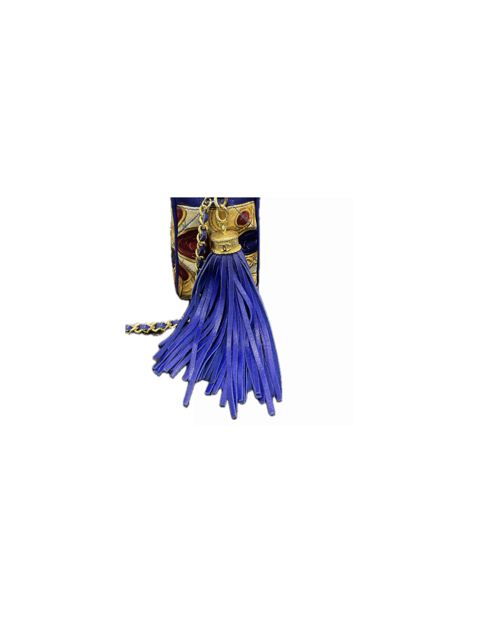 Details : the textile part is a design of vintage gripoix jewelry, a symbol of Chanel creations in the 80s and 90s. Tassel is in leather.