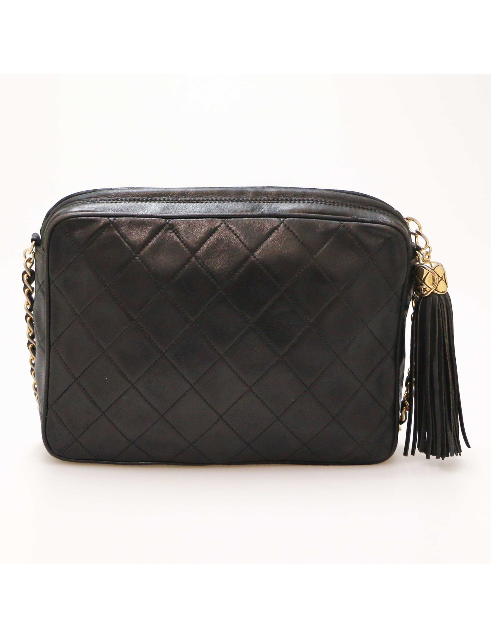 Last items in stock CAMERA CHANEL CHANEL vintage Camera GM bag CHANEL 34571 4,300.00 € Chanel black Caméra GM bag Condition : very goodMade in ItalyCollection : Caméra grand modèleGender : womanMaterial : leatherLining : black leatherColor : blackMeasurements : 27 x 20 x 8 cmShoulder strap : 104 cmHologram: noAuthenticity card : yesYear : 1989-1991Hardware :24K gold plated metalDetails : iconic pompn tassel Add to cart
