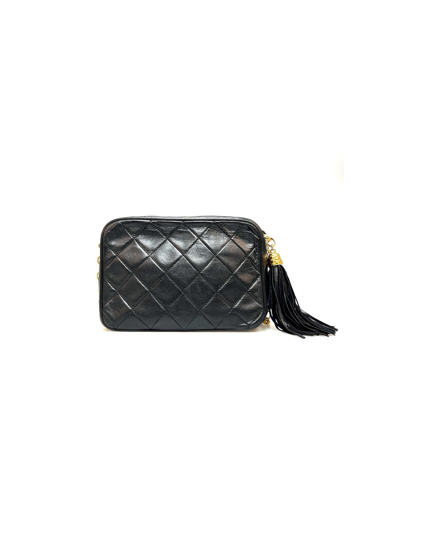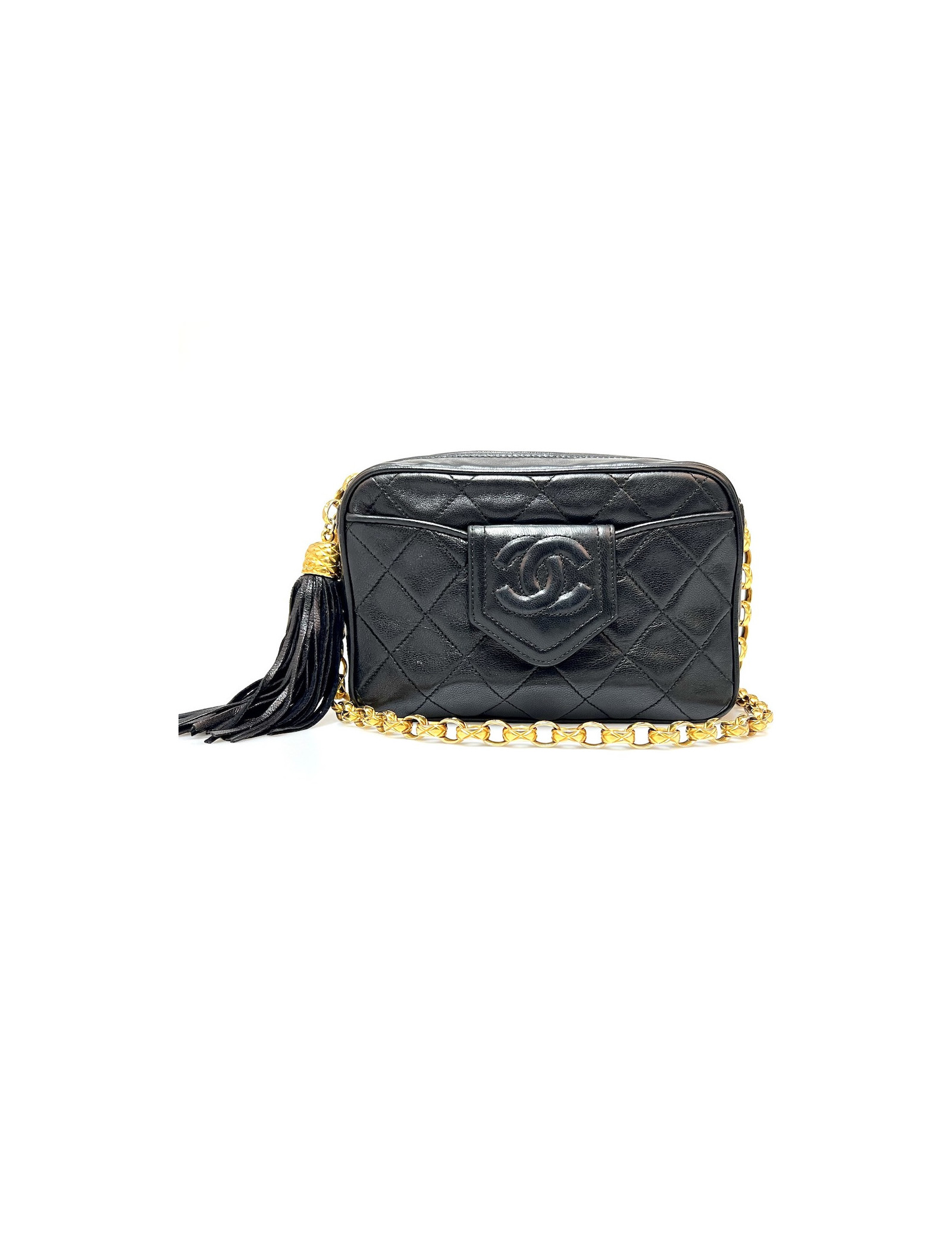 Last items in stock CAMERA CHANEL CHANEL vintage Camera GM bag CHANEL 34571 4,300.00 € Chanel black Caméra GM bag Condition : very goodMade in ItalyCollection : Caméra grand modèleGender : womanMaterial : leatherLining : black leatherColor : blackMeasurements : 27 x 20 x 8 cmShoulder strap : 104 cmHologram: noAuthenticity card : yesYear : 1989-1991Hardware :24K gold plated metalDetails : iconic pompn tassel Add to cart