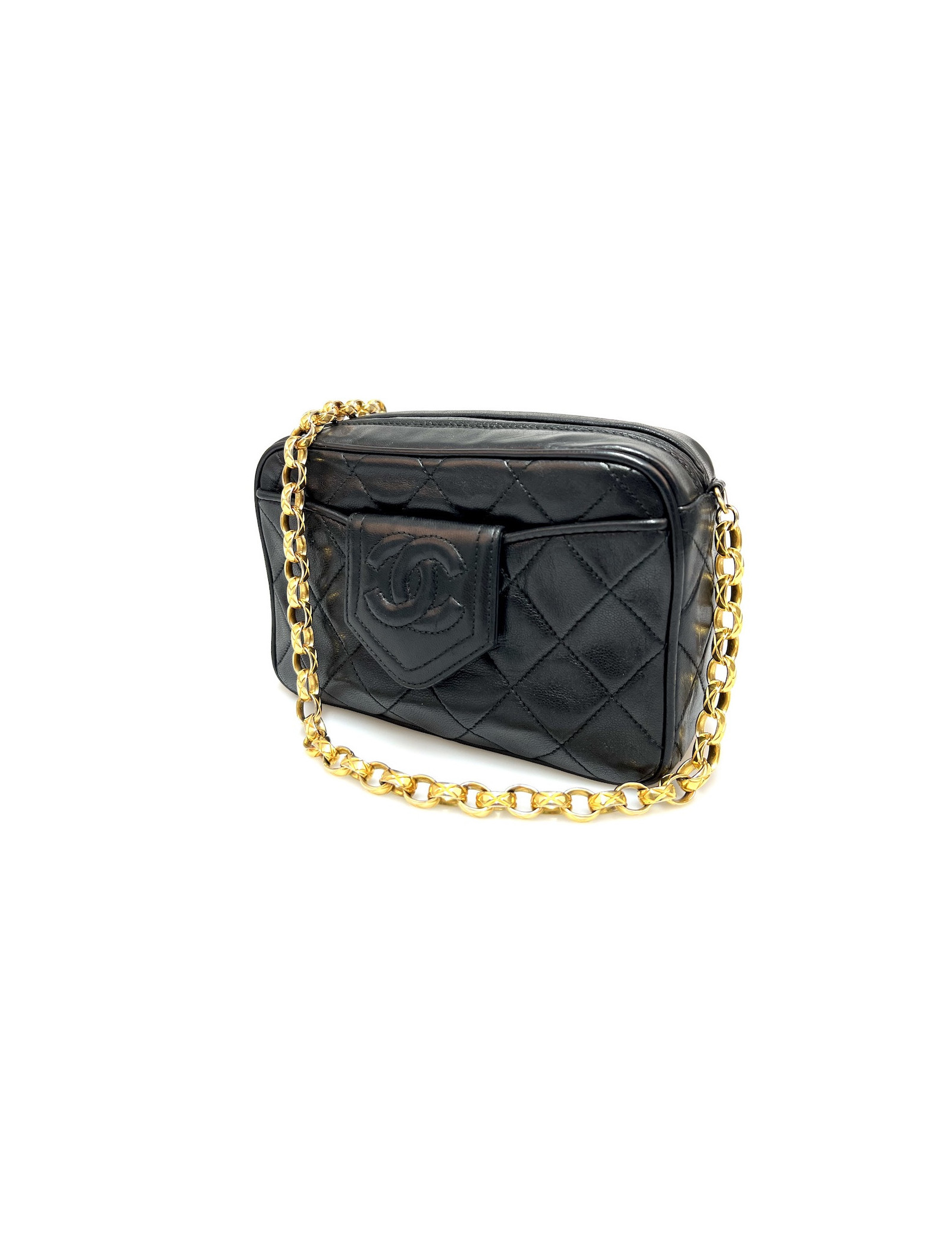 Last items in stock CAMERA CHANEL CHANEL vintage black camera bag CHANEL 34544 4,700.00 € CHANEL vintage black Camera bag ('90s) Condition : very goodMade in FranceGender : womanCollection : CameraMaterial : lambskin leatherLining : leatherColor : blackMeasurements:Bag: 21 x 13.5 x 6.5 cmShoulder strap : 60 cmHologram : yesAuthenticity card : noYear: 1994-1996Hardware : 24K gold plated metalDetails : Vintage, it is worn on the shoulder. Zipper... Add to cart
