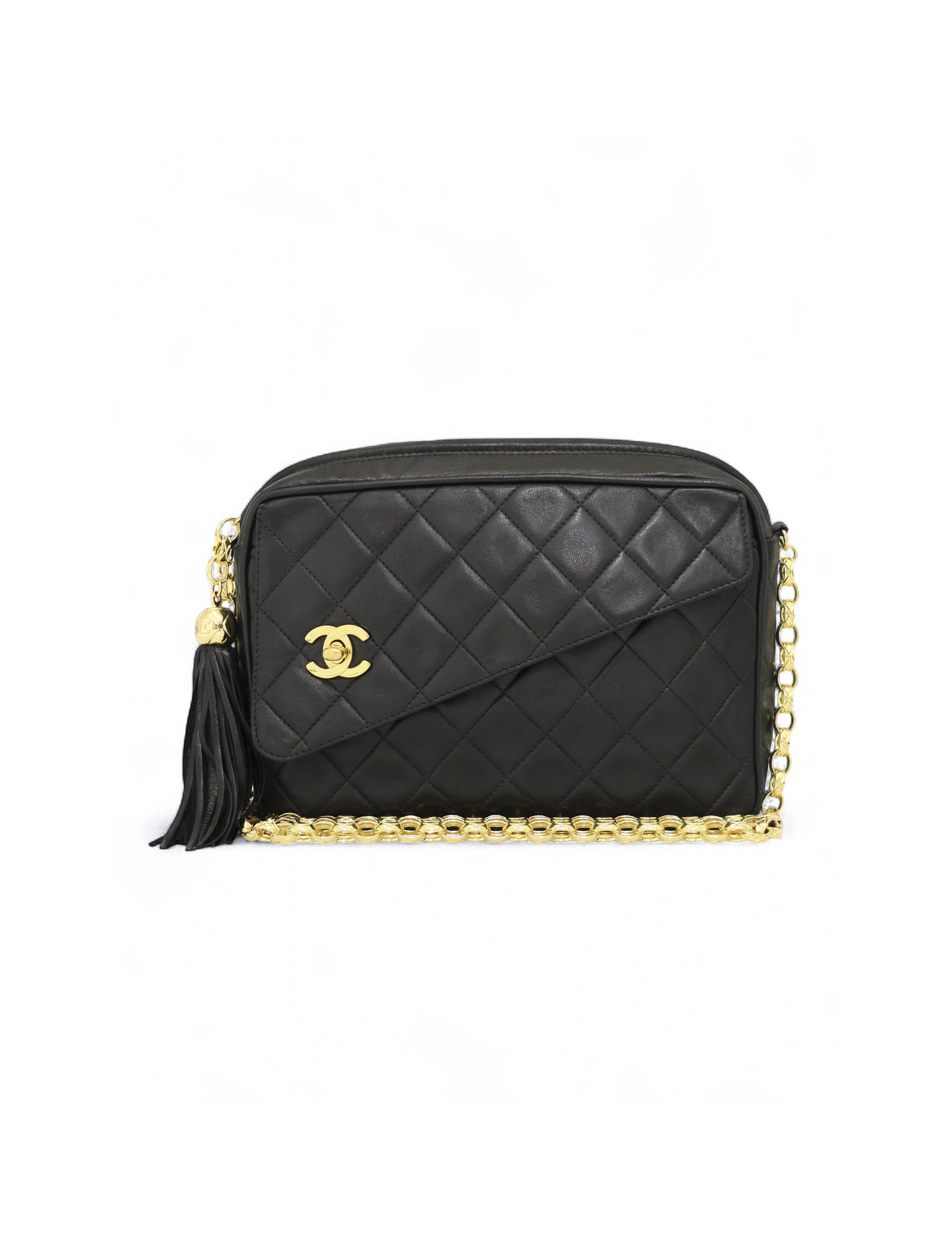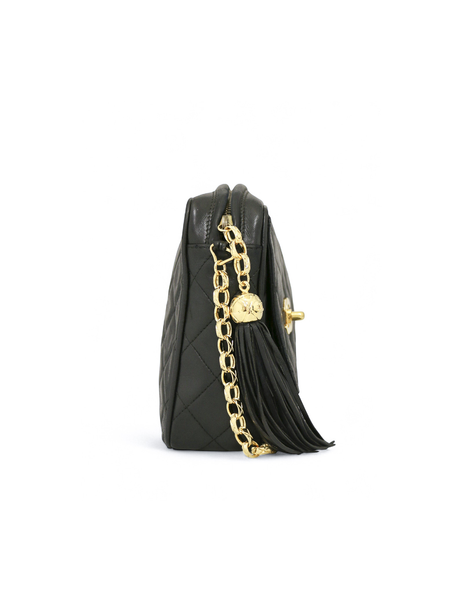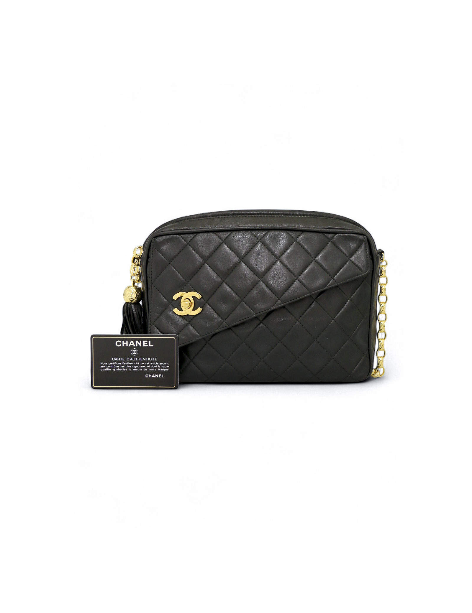 CAMERA CHANEL CHANEL vintage Camera GM bag CHANEL 34571 4,300.00 € Chanel black Caméra GM bag Condition : very goodMade in ItalyCollection : Caméra grand modèleGender : womanMaterial : leatherLining : black leatherColor : blackMeasurements : 27 x 20 x 8 cmShoulder strap : 104 cmHologram: noAuthenticity card : yesYear : 1989-1991Hardware :24K gold plated metalDetails : iconic pompn tassel Add to cart