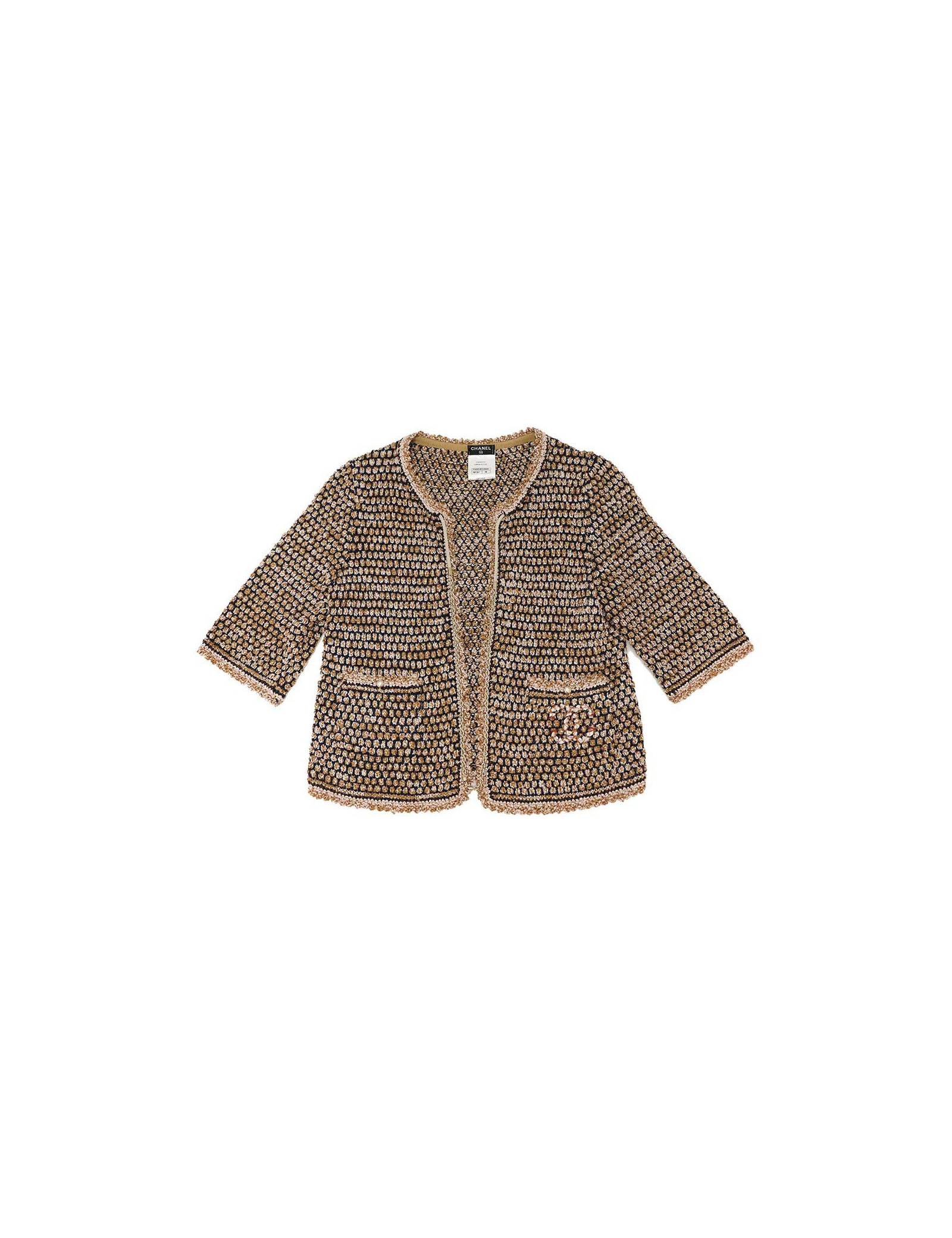 Last items in stock CARDIGANS-VEST-KNITWEAR CHANEL black cashmere cardigan CHANEL 22029 1,350.00 € CHANEL long black cashmere cardigan 36FR Condition: very goodSize: 36FRMaterials: cashmereColors: blackMeasurements : shoulders 36 cm, sleeves length 63 cm, total height 70 cm.Details: It is trimmed all around with a crochet band on the front, pockets and cuffs. There are no buttons. In very good condition. No size or material label. It has two pockets,... Add to cart