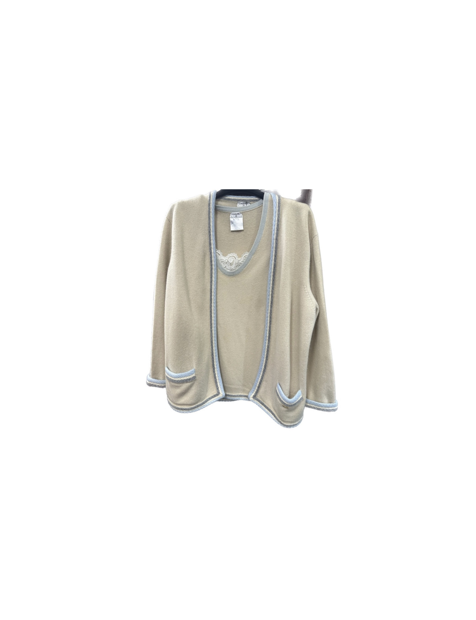 Last items in stock CARDIGANS-VEST-KNITWEAR CHANEL cardigan in black and white cashmere size 36FR CHANEL 22965 1,400.00 € Chanel cardigan in cashmere with geometric patterns black and white and silver thread. It is lined with plastic material. The cardigan is tightened at the waist with two small black sequined ribbons. Made in France. Fall 2005 collection. Dimensions flat: Shoulder width 36 cm, underarm width 39.5 cm, total height 55.5 cm, sleeve length 71 cm. Add to cart