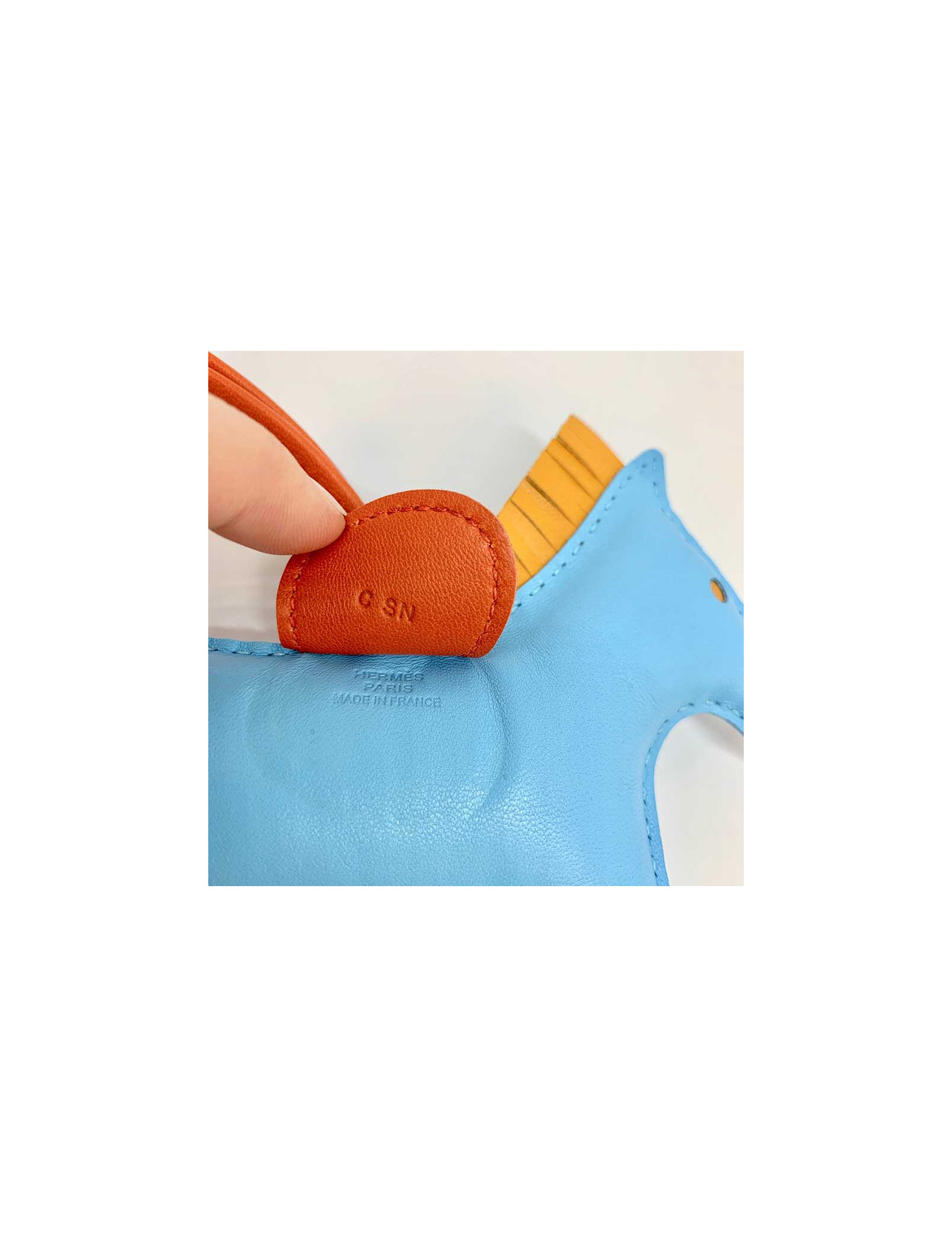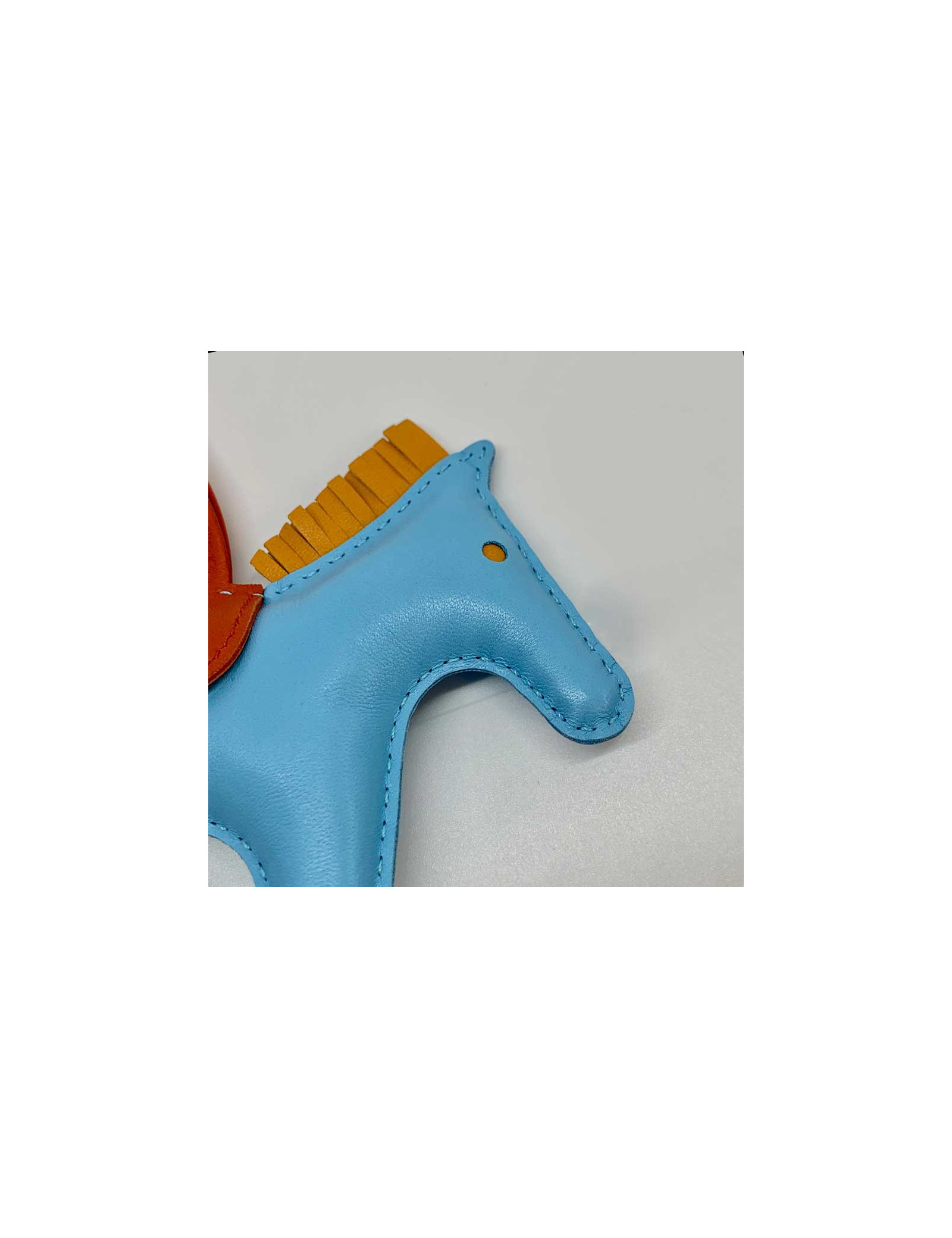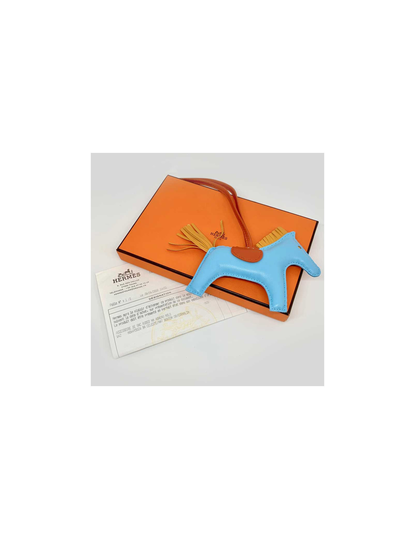 Details : HERMES horse charm, rodeo model, in celestial blue lamb leather, gold button and cornalin. HERMES brand engraved on the leather under the saddle, see photo. The charm will be delivered in its HERMES box with its original invoice.