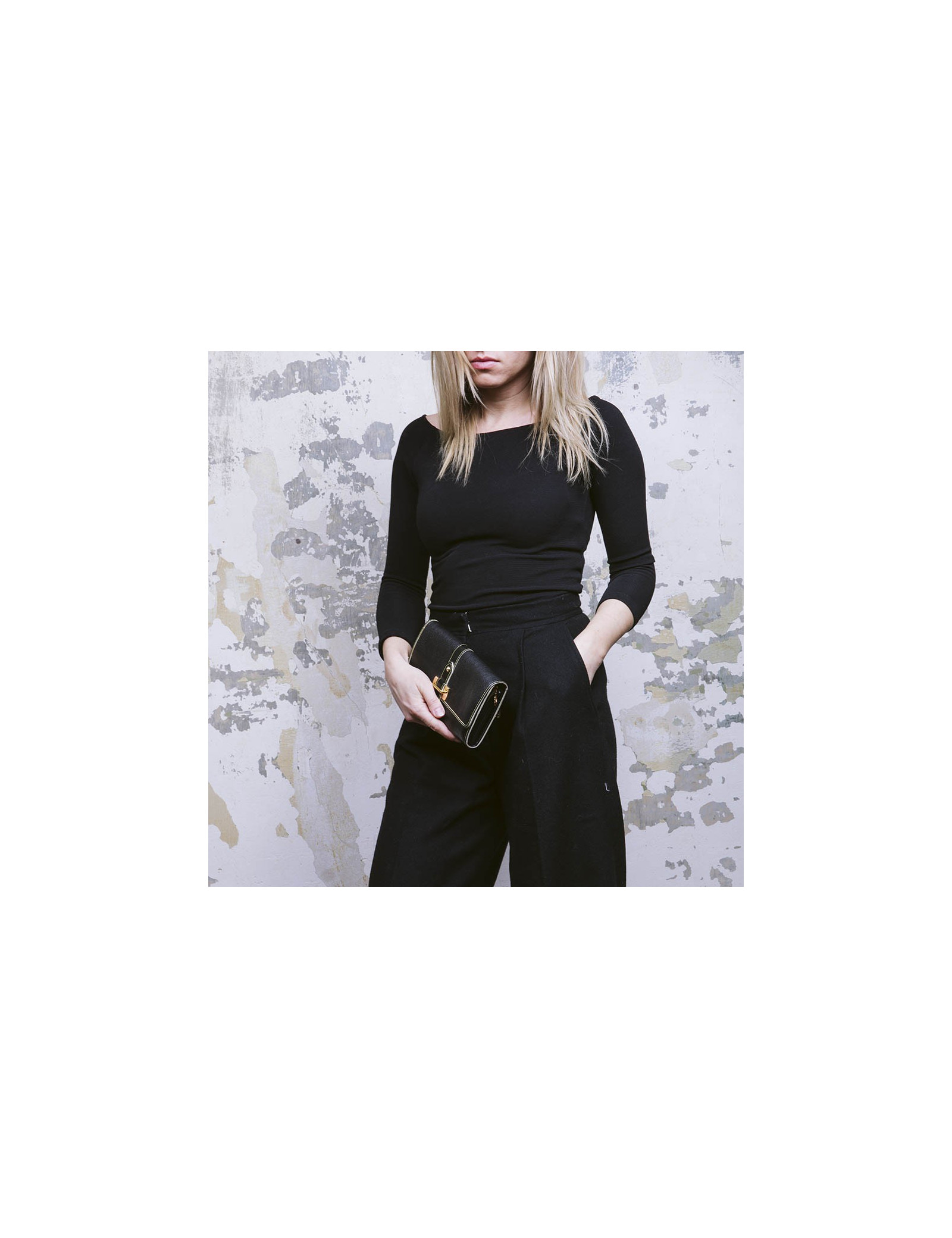 The interior is lined with black smooth leather with 2 times 8 card slots, 1 zipped pocket, two billows gussets or other documents.