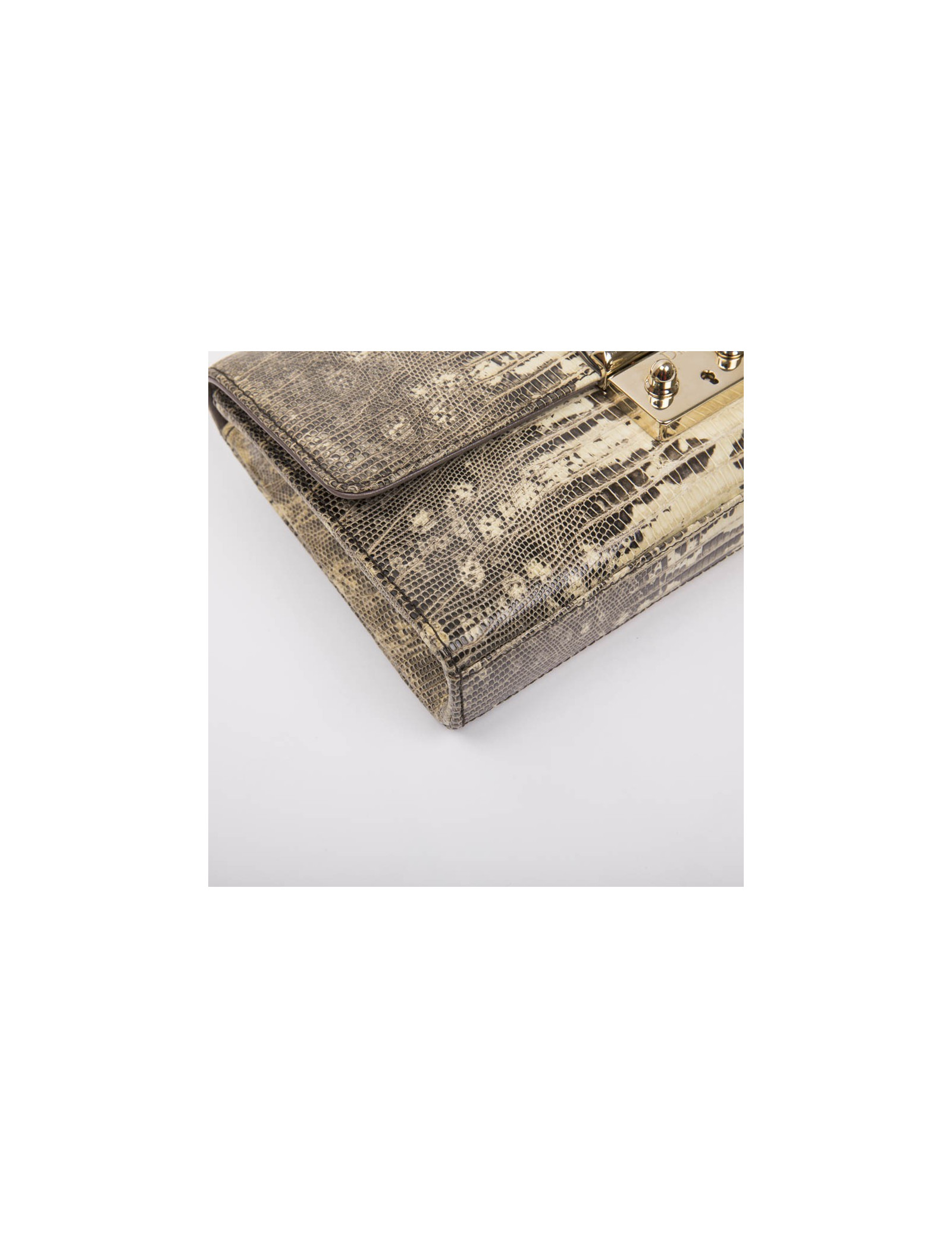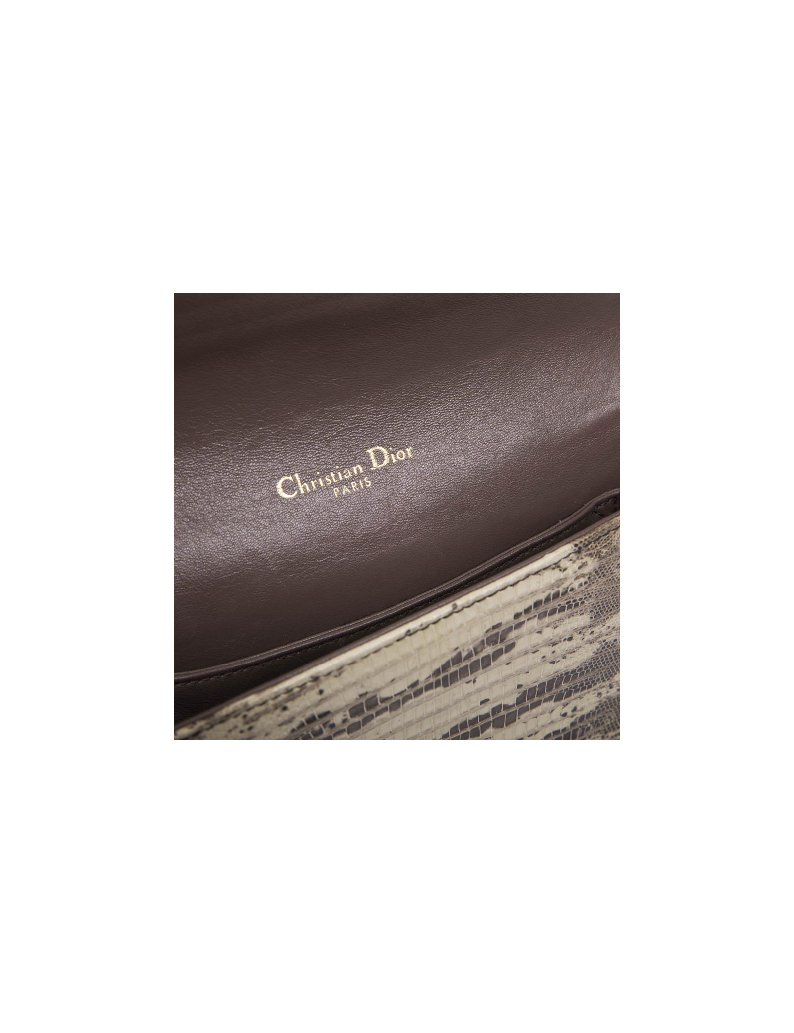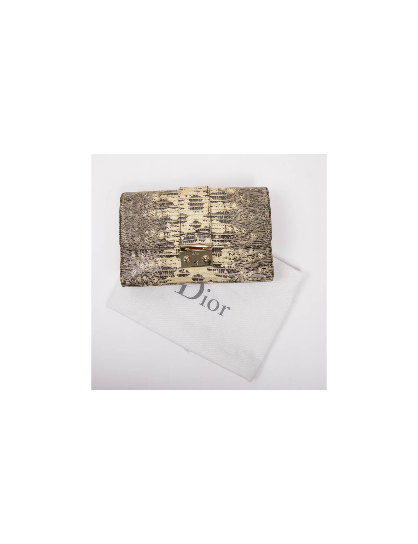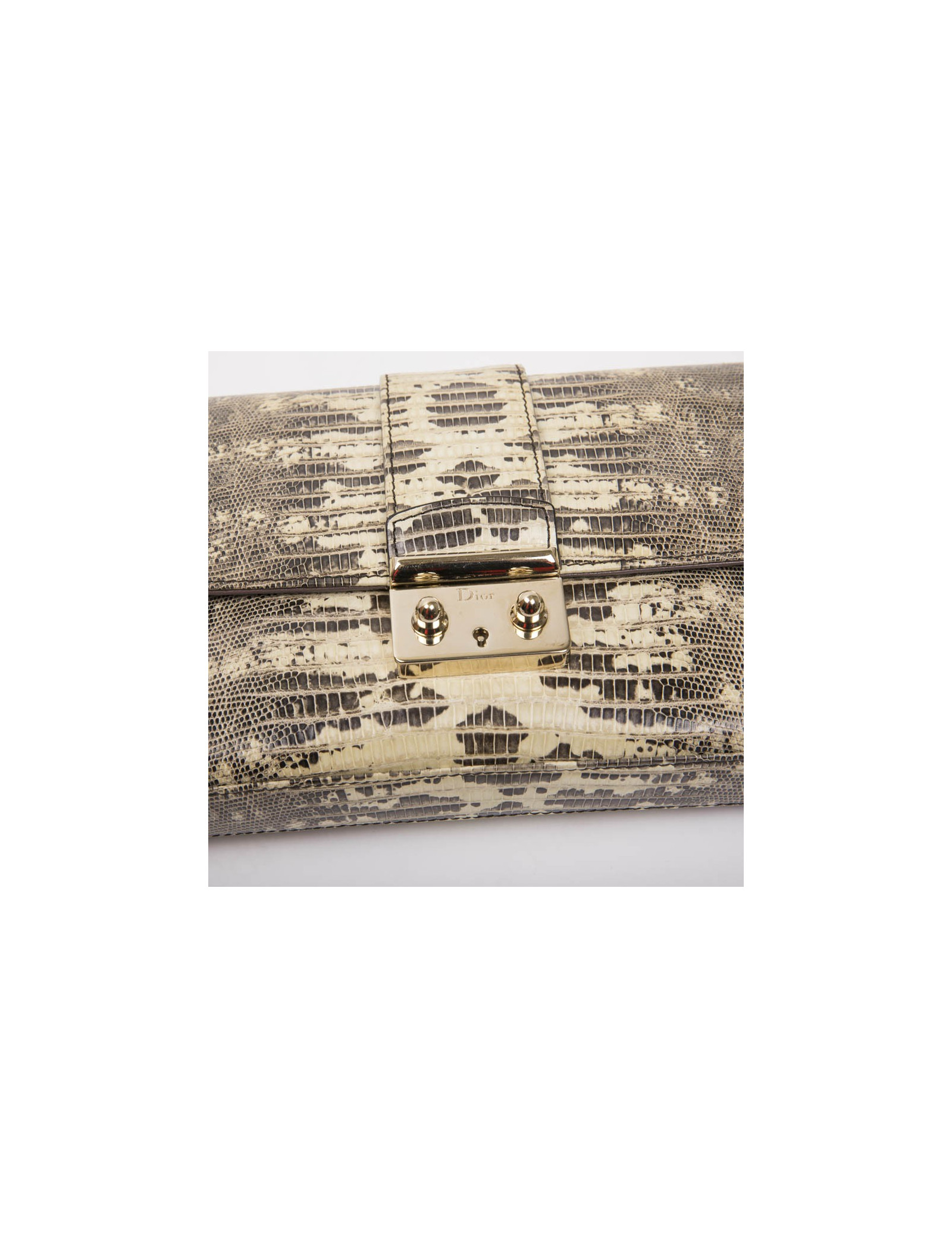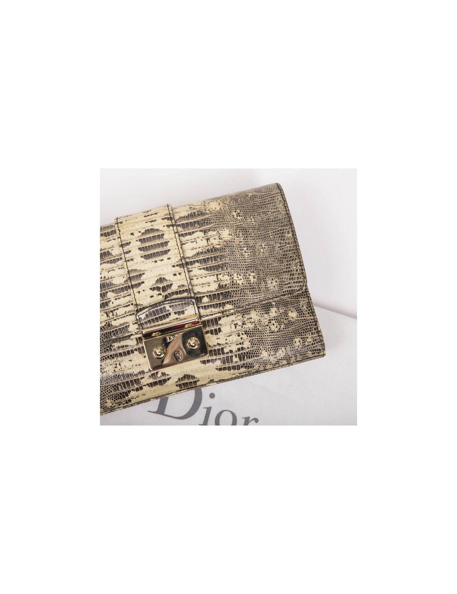 Dior clutch in water snake skin. Signature clasp in shiny gold metal hardware. The interior is in light brown leather (pen mark) with a patch pocket.