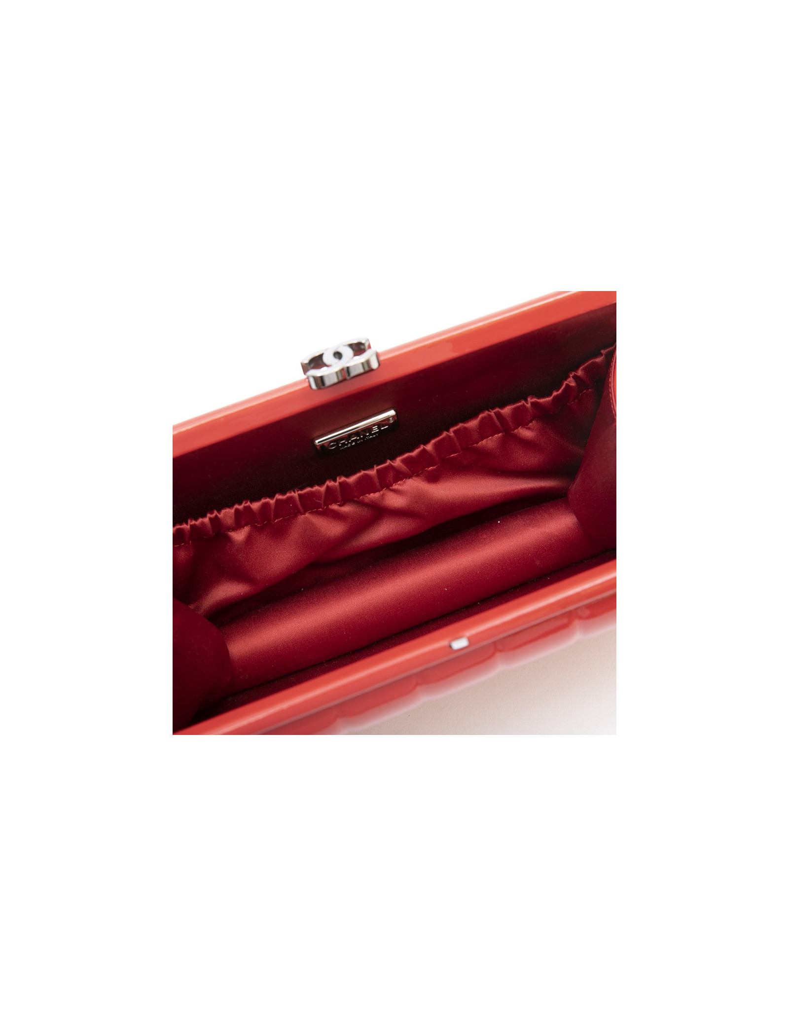 Chanel clutch in red patent leather. Ruthenium metal hardware. Clasp 'CC'. The interior is in burgundy satin.