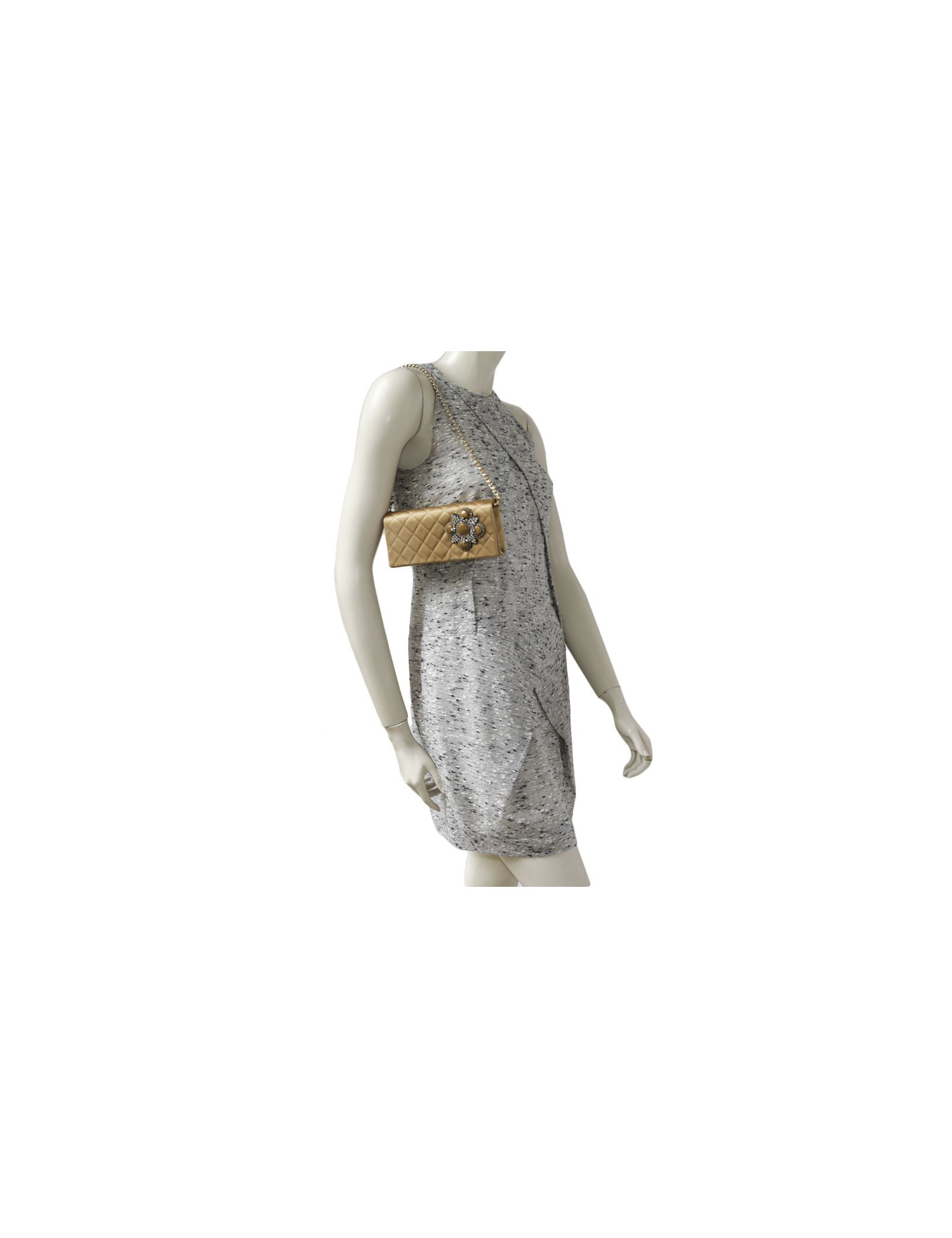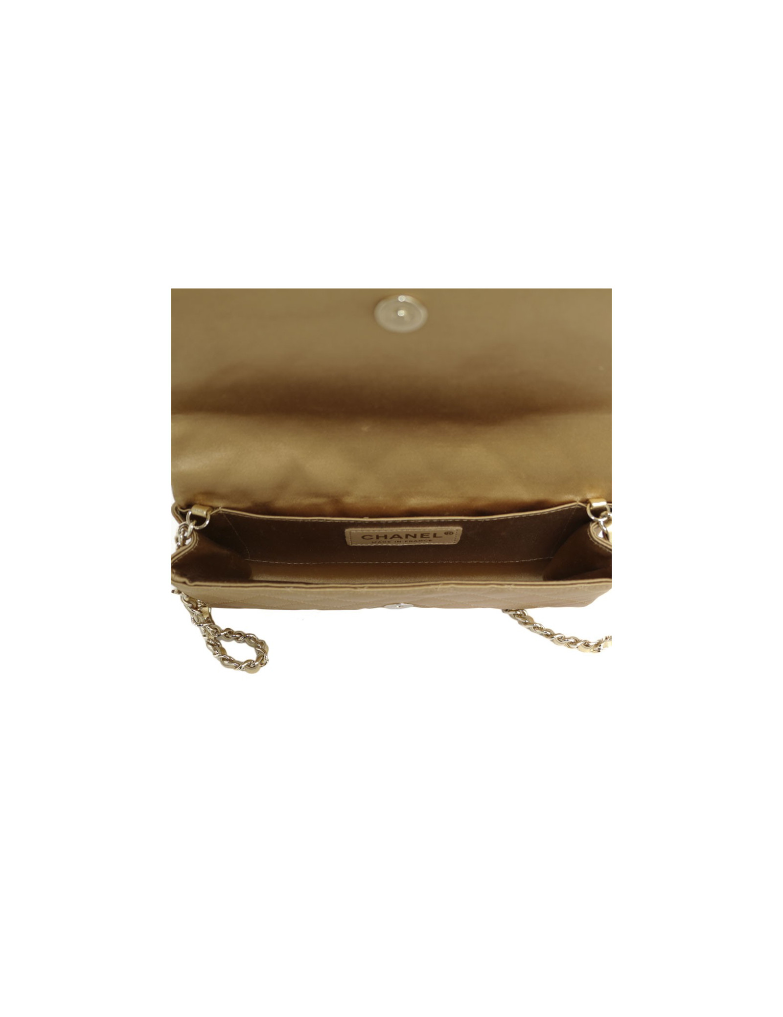 Worn by hand as a clutch or on the shoulder with a shoulder strap in gold chain and gilt leather. The inside is in silk satin with a small patch pocket.