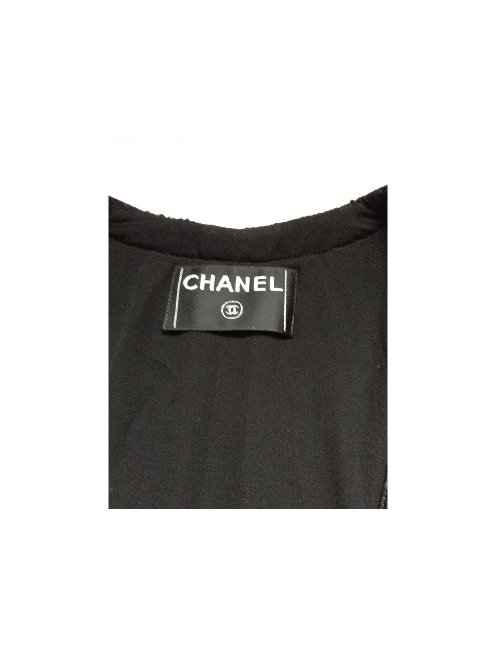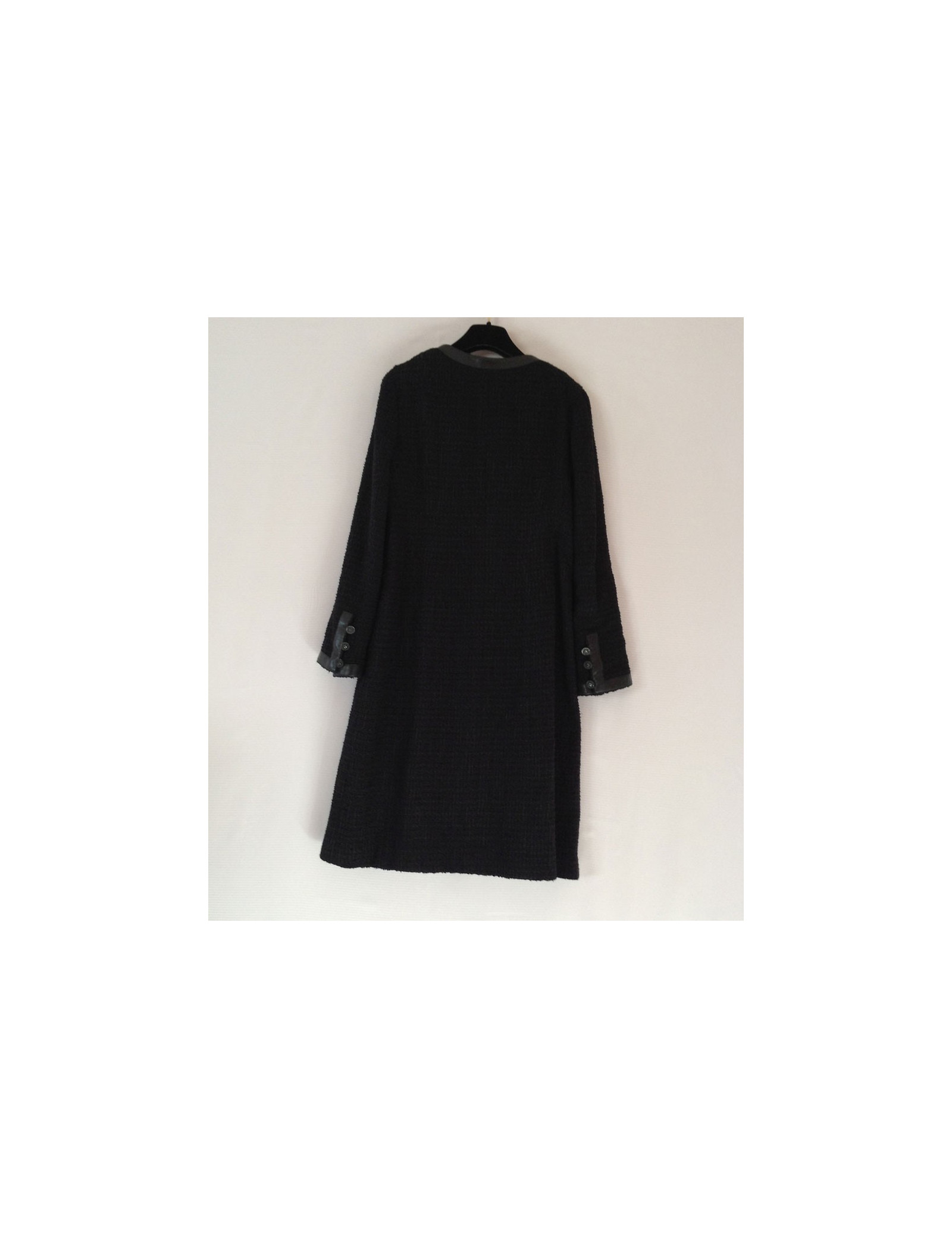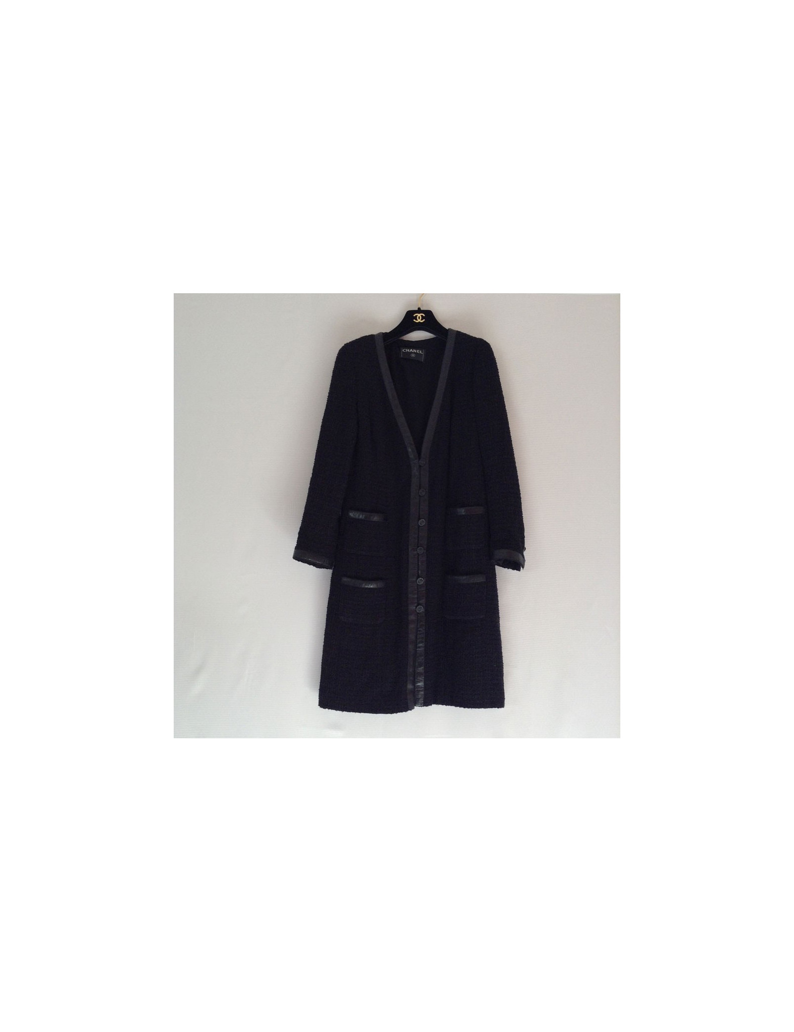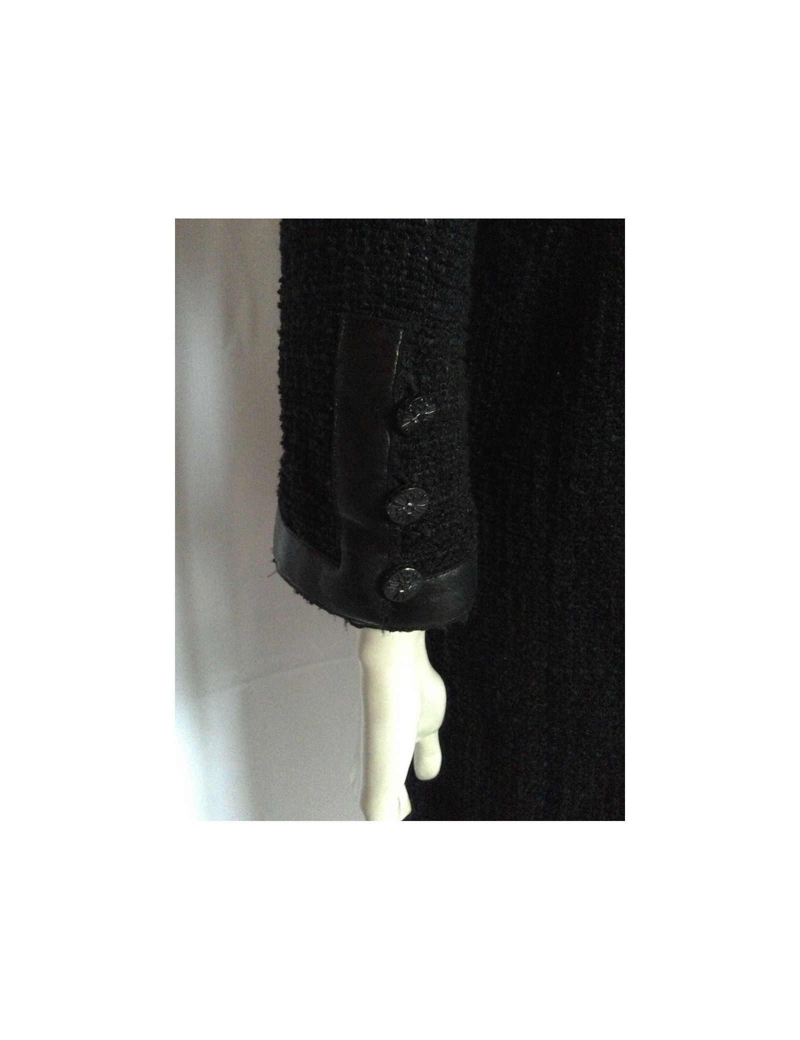 Beautiful coat in black tweed, black Chanel. The black knobs are inlaid with Swarovski black stones on the sides. There are 4 pockets in front, V neck beautifully highlighted by a black leather band as well as on the pockets and cuffs. The lining is black silk; the finishes are smooth lambskin leather. It is a classic of the House of CHANEL. Not size but label is equivalent to a 38. It is in very good condition.