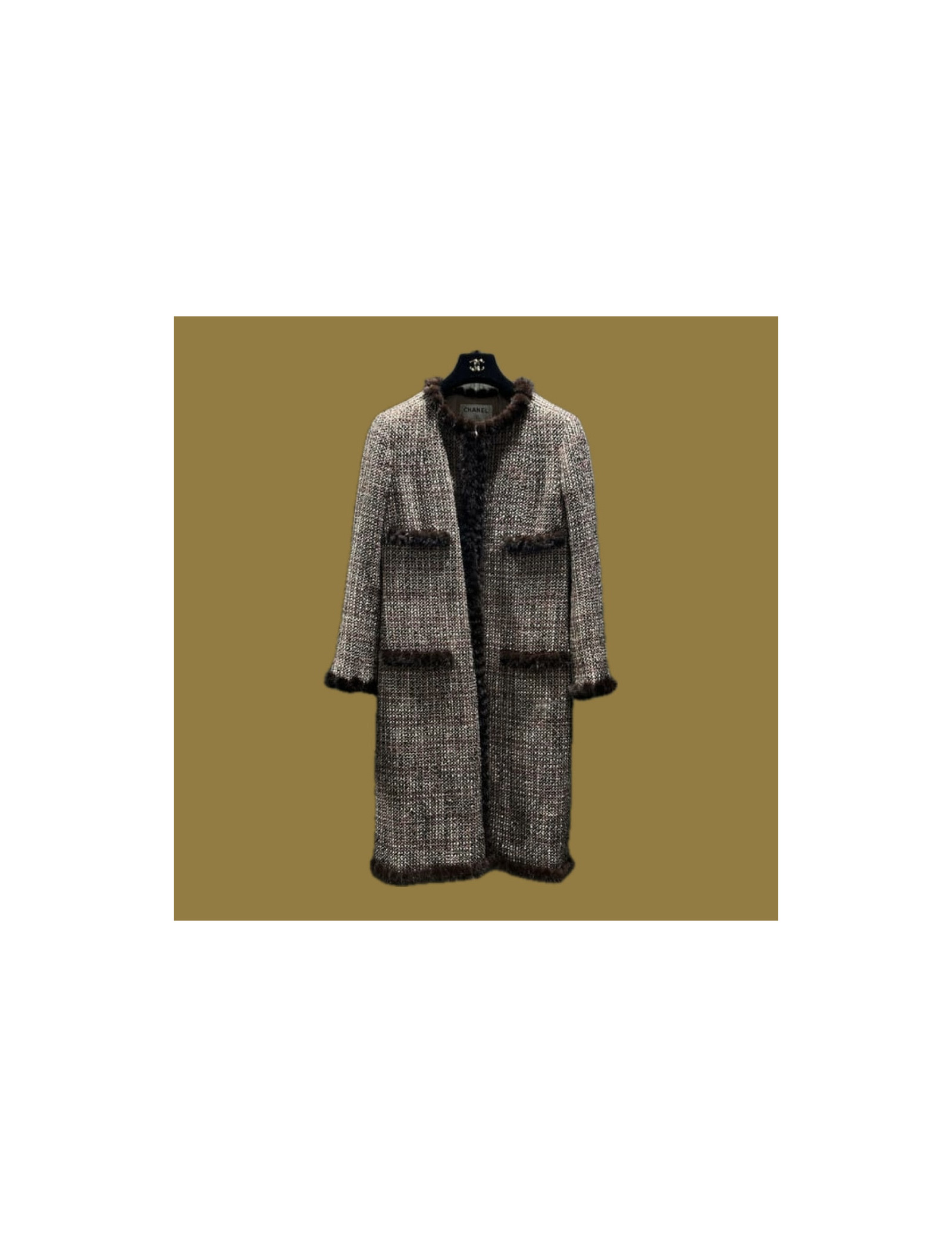 Online only -3,000.00 € Last items in stock COATS-TRENCHS CHANEL faux fur and tweed brown coat CHANEL 31331 5,900.00 € 8,900.00 € CHANEL faux fur and tweed brown coat size 46FR Condition : very goodMade in FranceSize: 46FRMaterials: tweed, goatskin, faux furSize: 46FRLining : 100% silkColors : beige, brownMeasurements: shoulders 46 cm, underbust 52 cm, height 95 cm, sleeves length 50 cm, wrist circumference 40 cm, scarf's length : 180 x 18 cmYear :Fall/winter 2010Details :... Add to cart