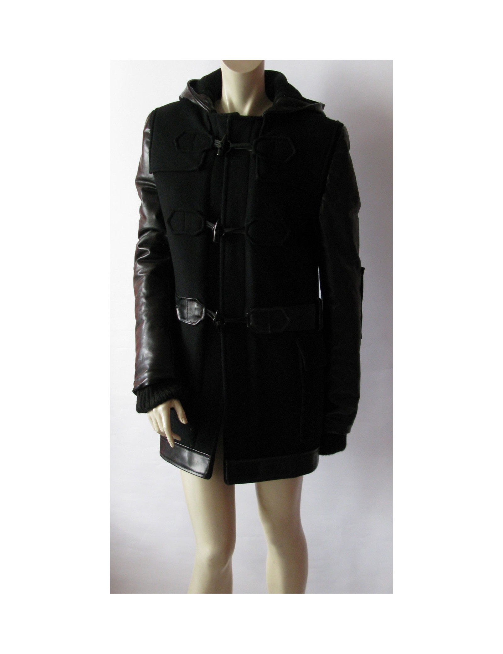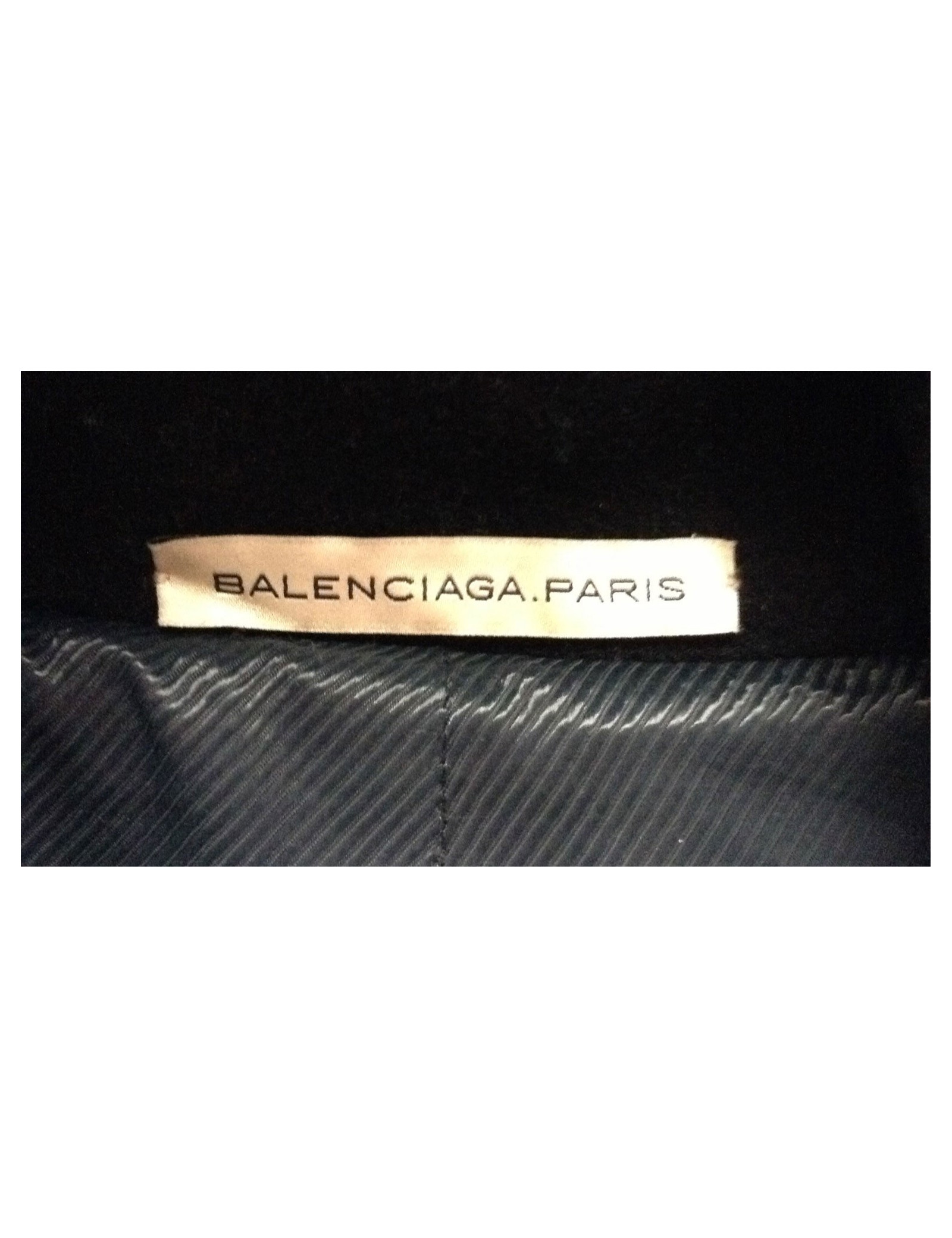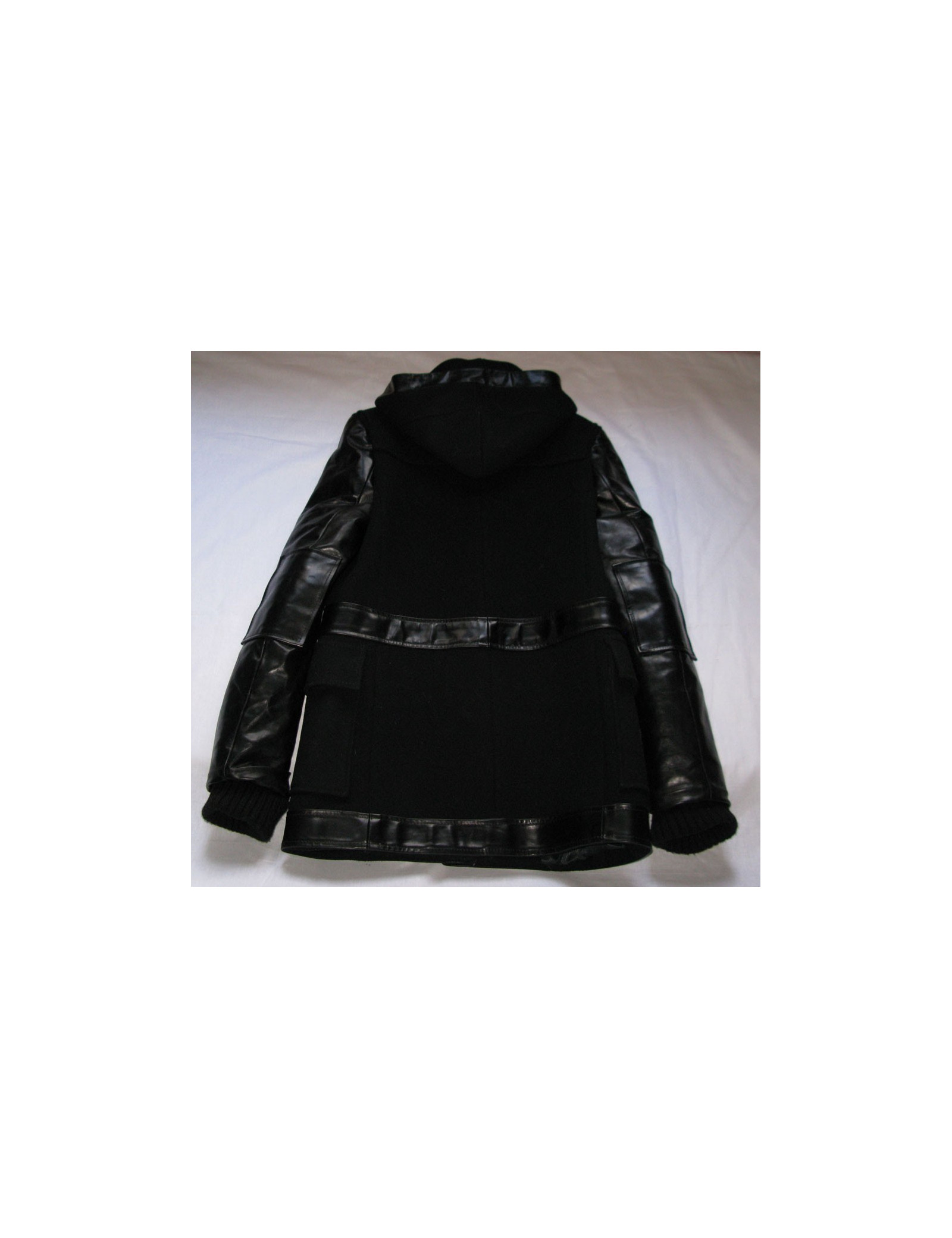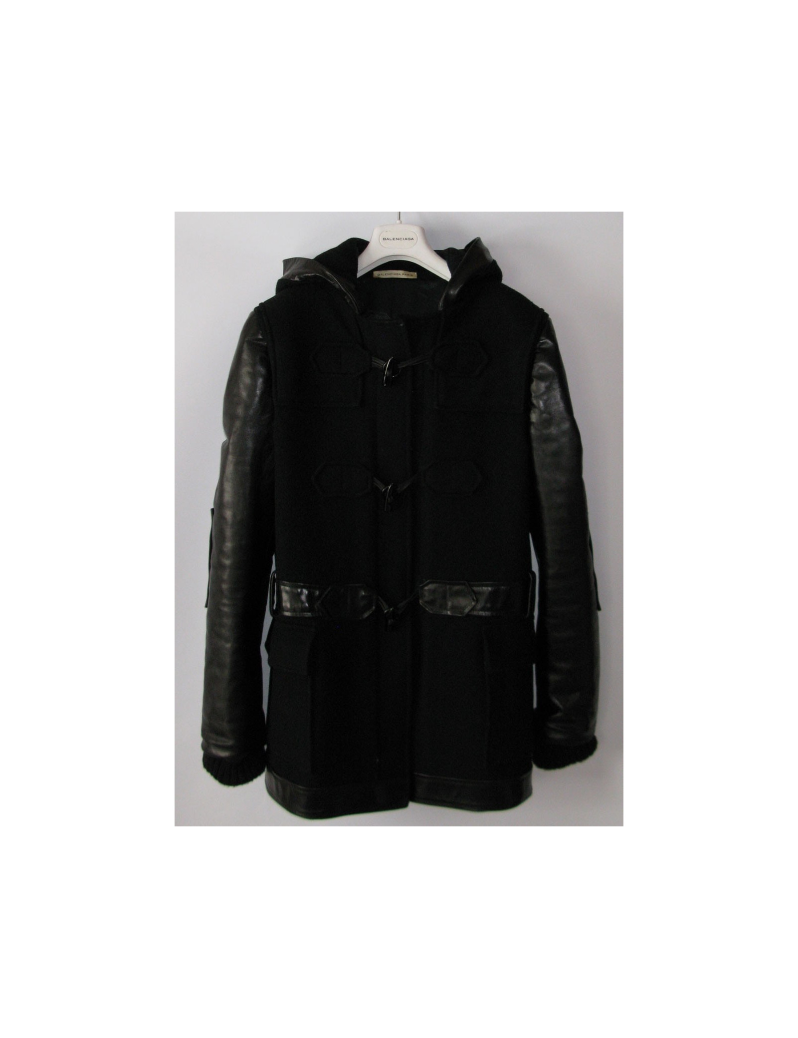 pea coat black Balenciaga unisex, length three quarters in thick wool, straight cut, long sleeves, large pockets, 3 fasteners in "frog" made closing system of small black horns that slip in a black ring attached by a link in black leather. Application in leather on the contour of the hood around the waist (adorned with 2 passers-by leather) and on the hem of the coat. The pea coat is wool, the sleeves are leather and on each sleeve there is a yoke leather.  Length: 77 cm, Chest width: 49 cm Sleeve length: 74 cm, Build: 44 cm Very good condition!  no label size and composition.