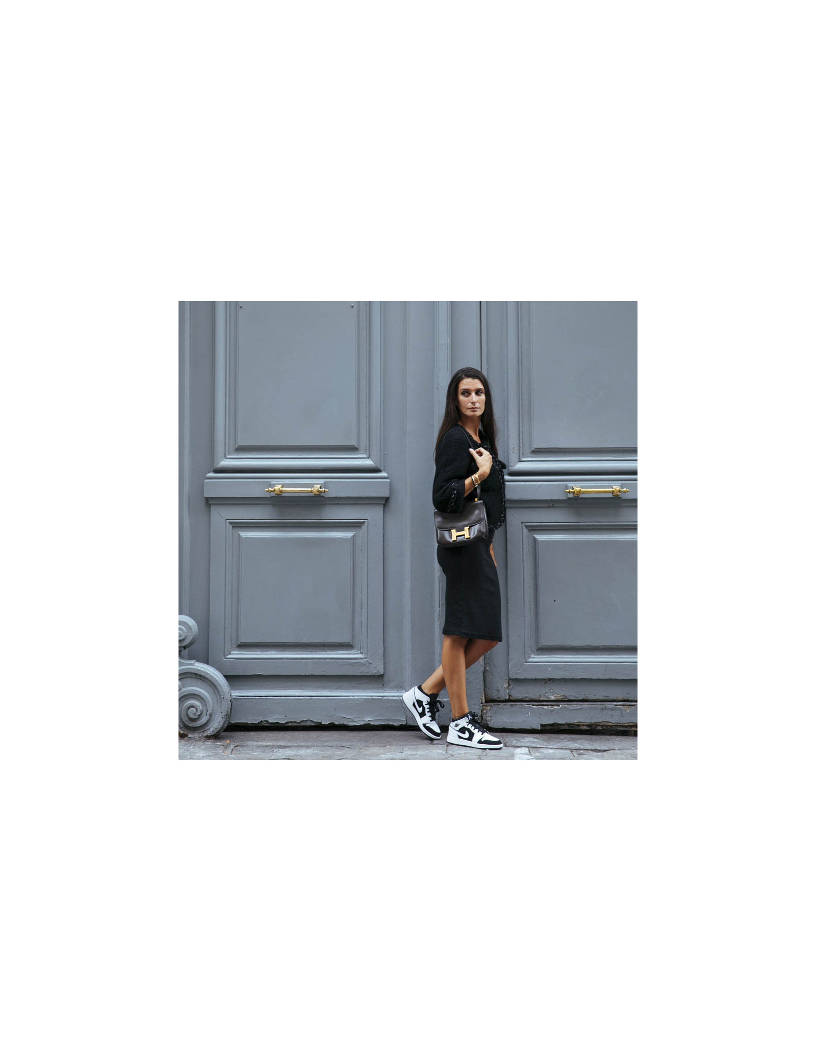 We don't describe anymore the Constance bag, here in brown box leather. One of the great classics of the House of Hermes. The inside is made of brown leather with two pockets, one is zipped. It is in good condition, with a slight tear on the sides (see pictures). It is worn on the shoulder.