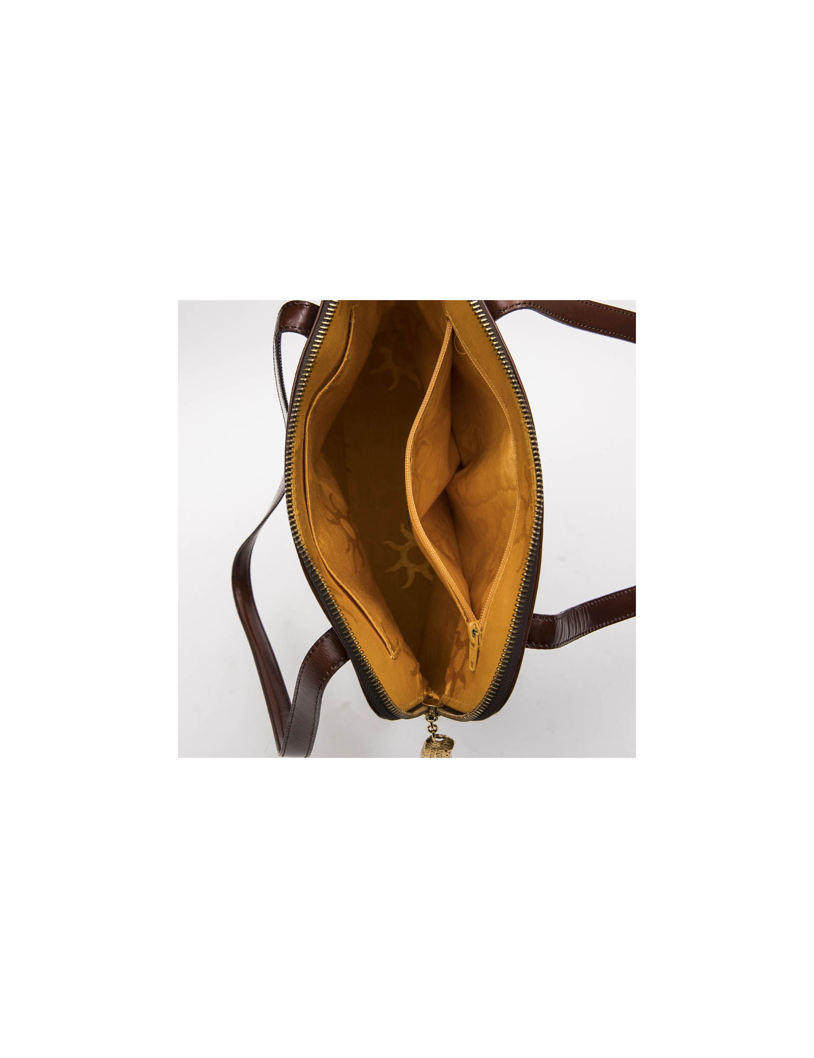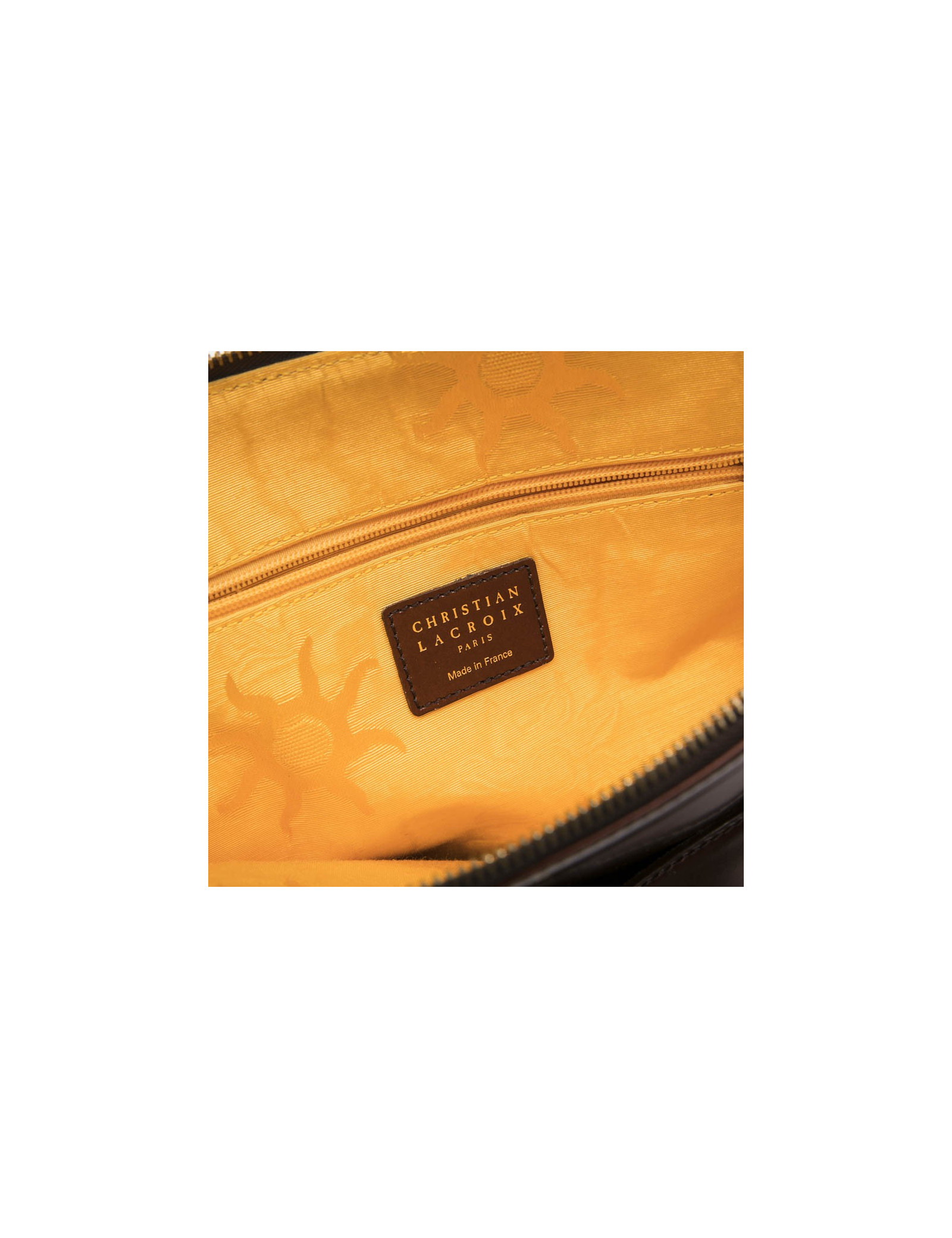 Vintage Christian Lacroix bag in smooth tawny leather. The interior is in yellow satin monogram with 2 pockets one flat and the other with a zipper.