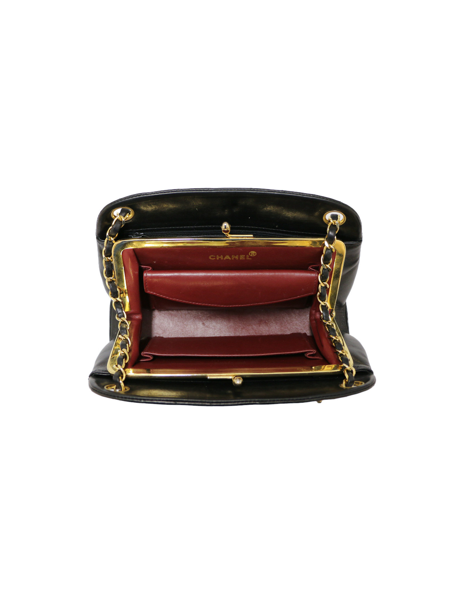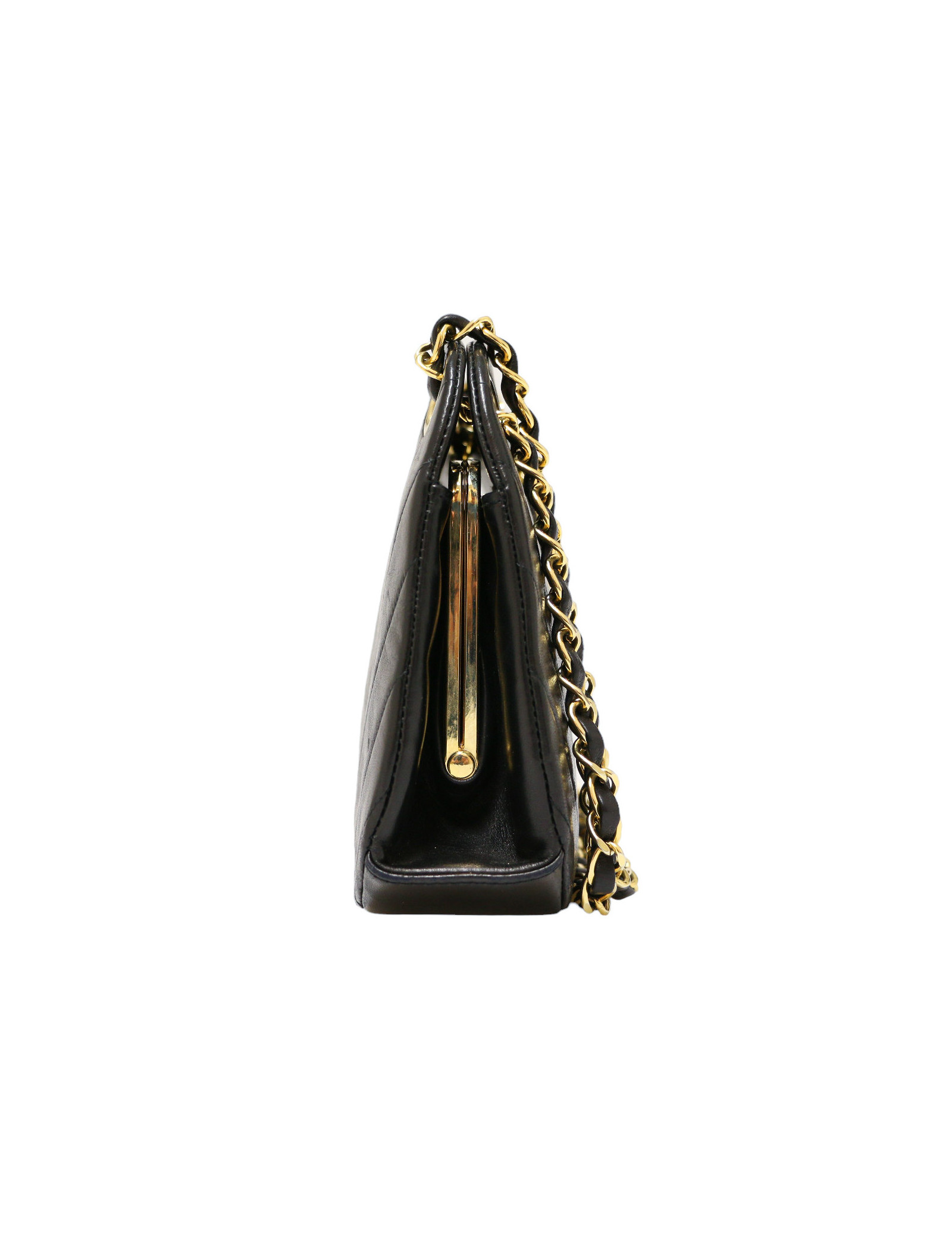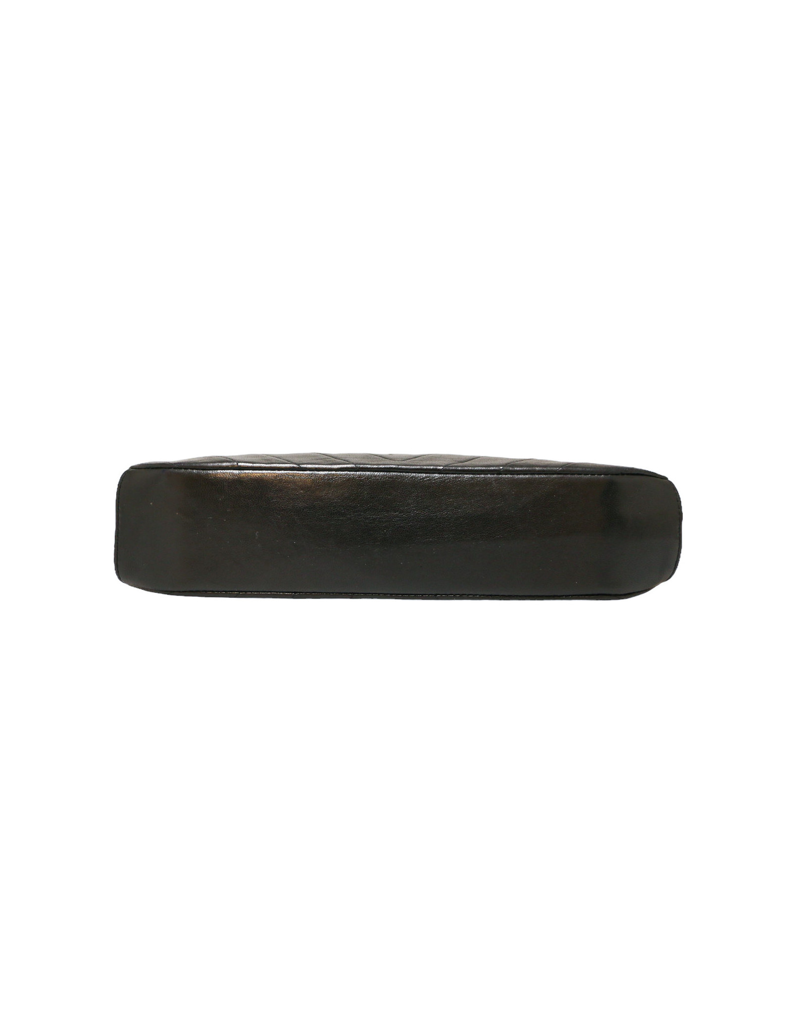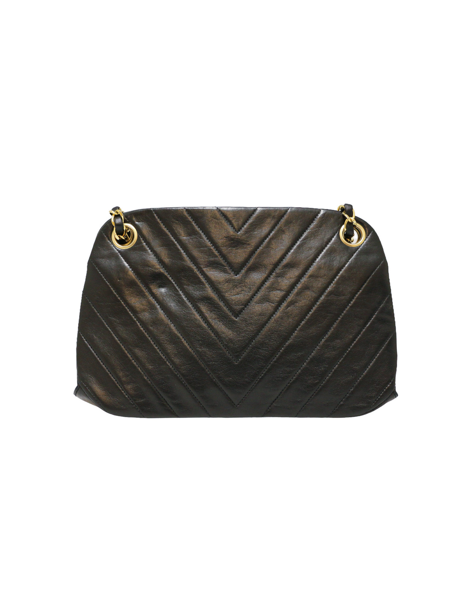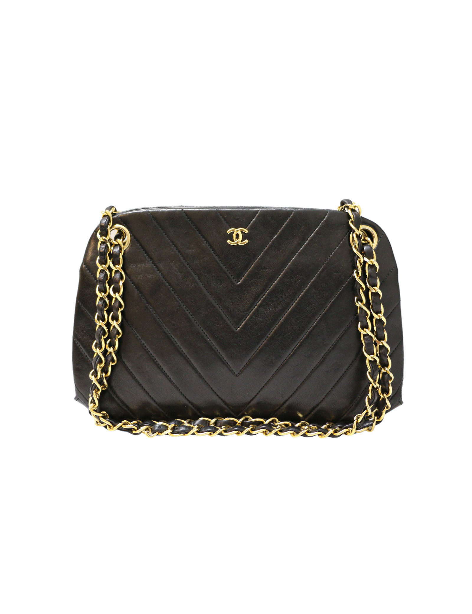 Details : small vintage shoulder bag, two gold chain handles interlaced with metal. Herringbone leather, small gold CC on front of bag