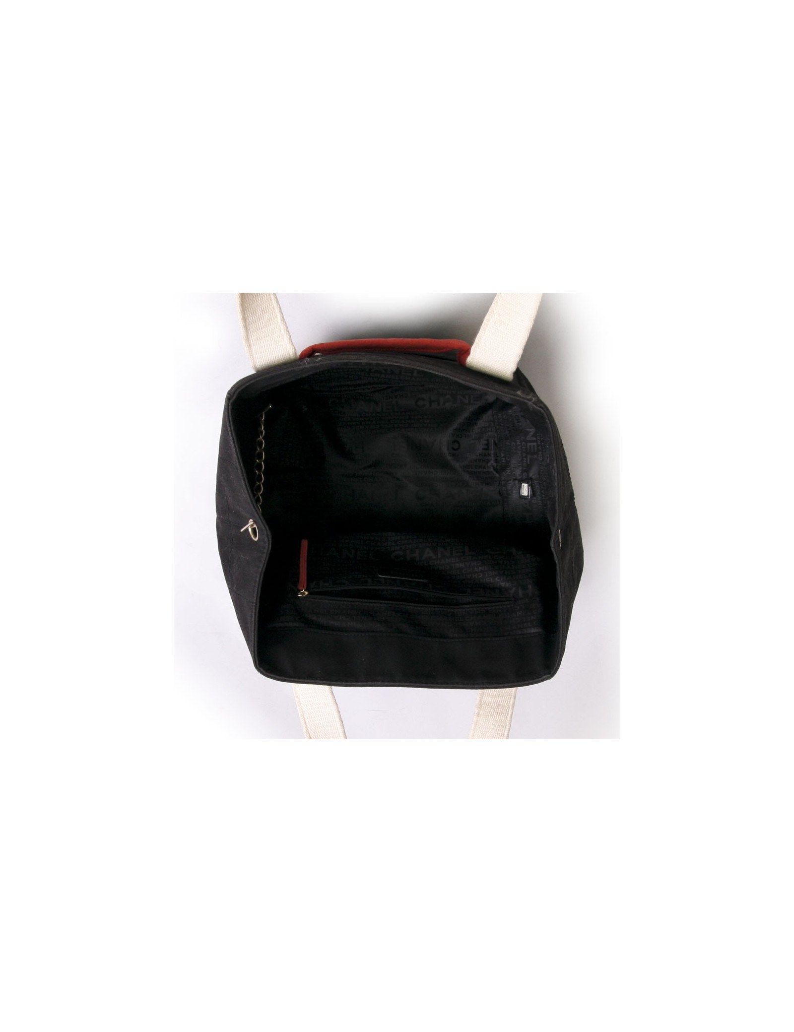 Canvas Chanel Black, white and Red bag. Very practical, it has a large storage space to slide all your accessories. Double handle. The lining is black monogram canvas with a large zippered pocket. Hologram: 8889... In very good condition. Very slight wear to corners under the bag but very little visible.