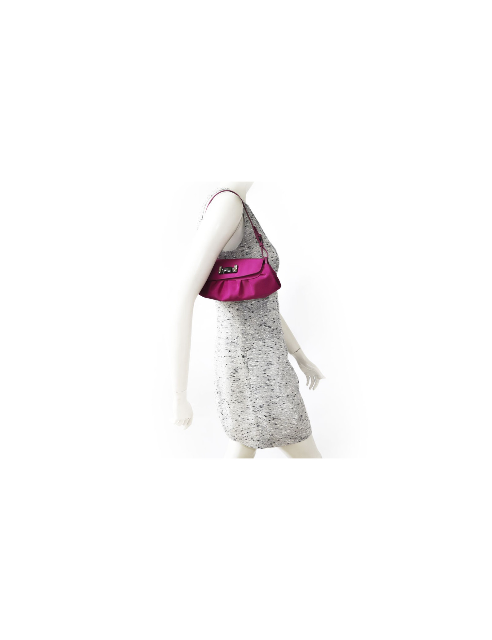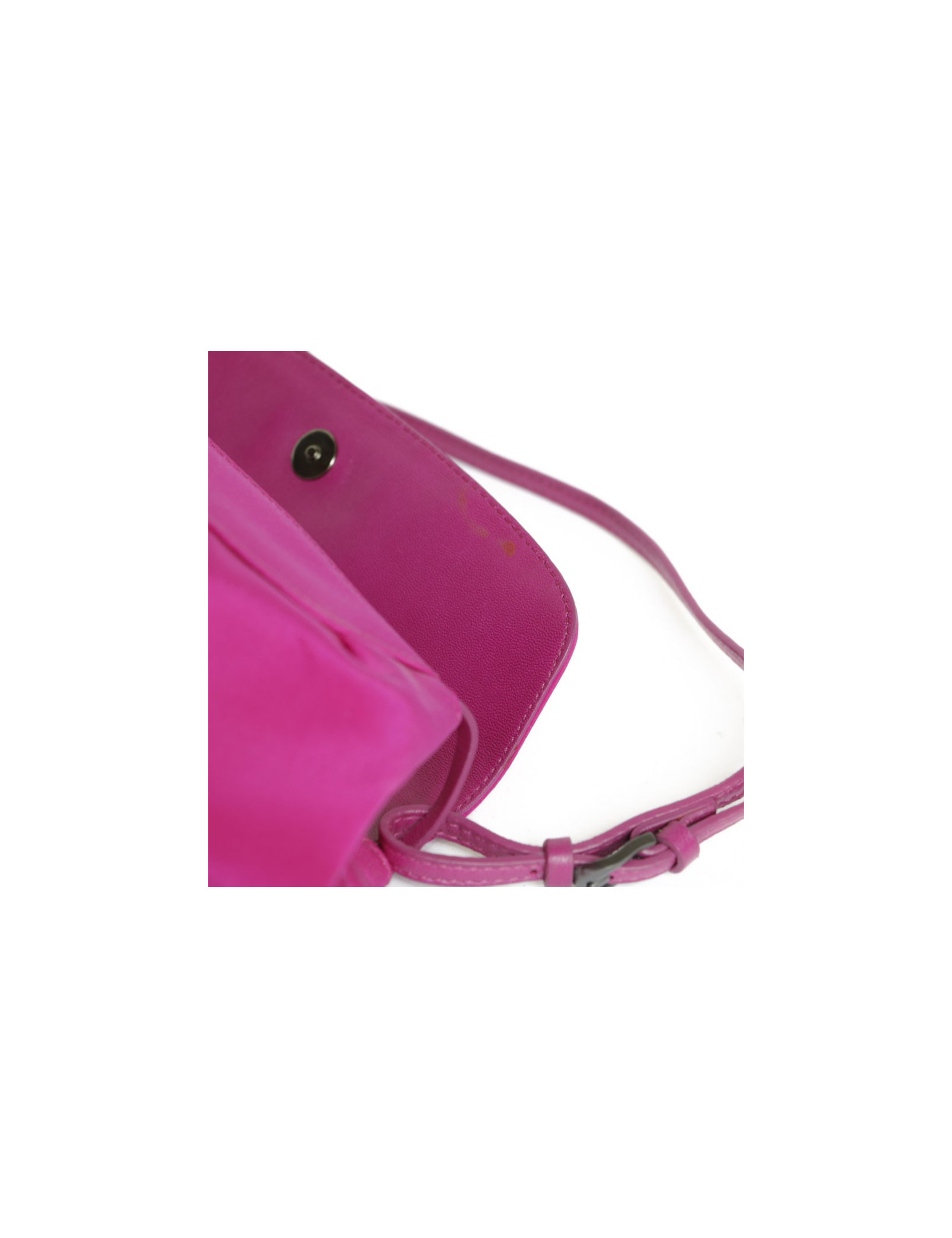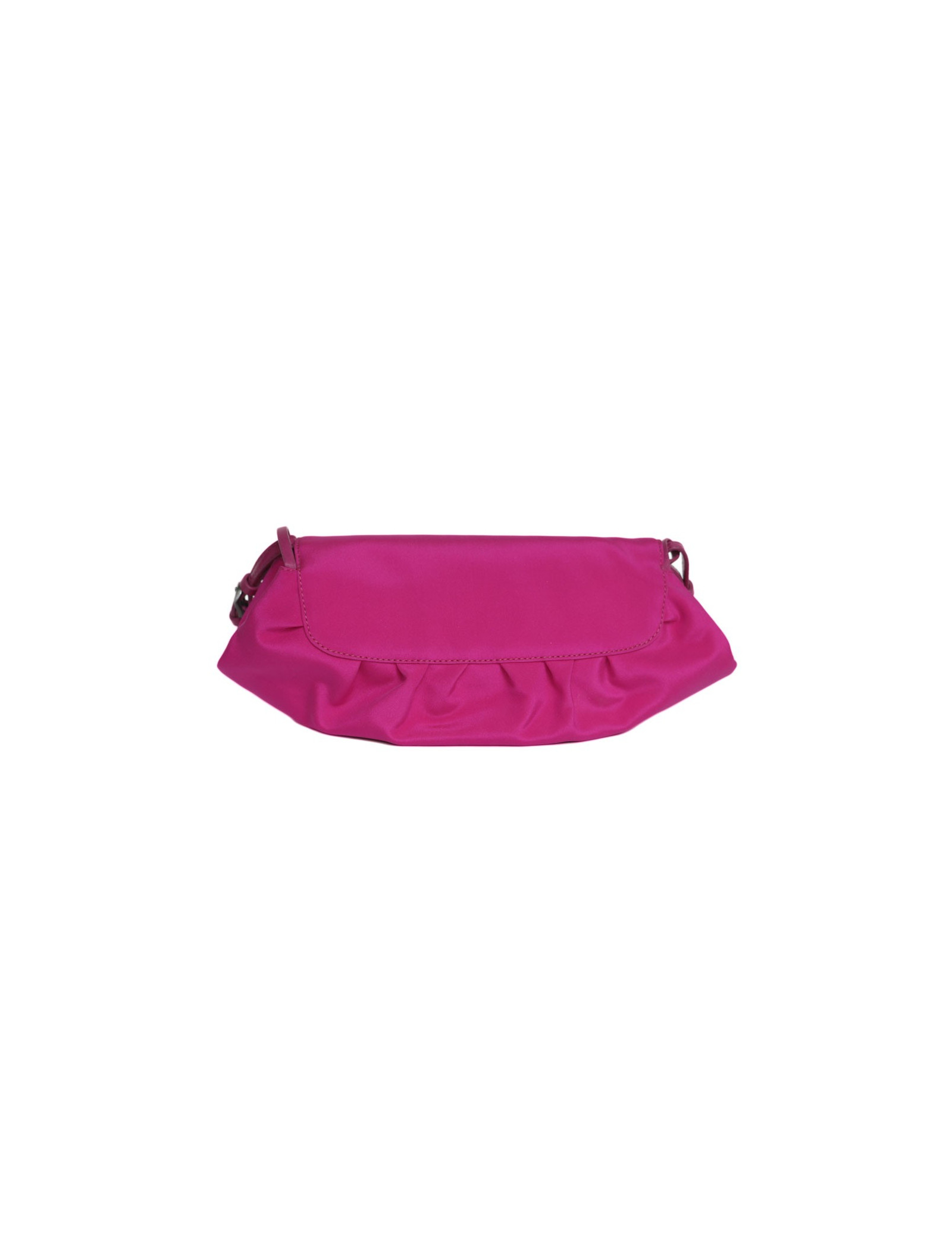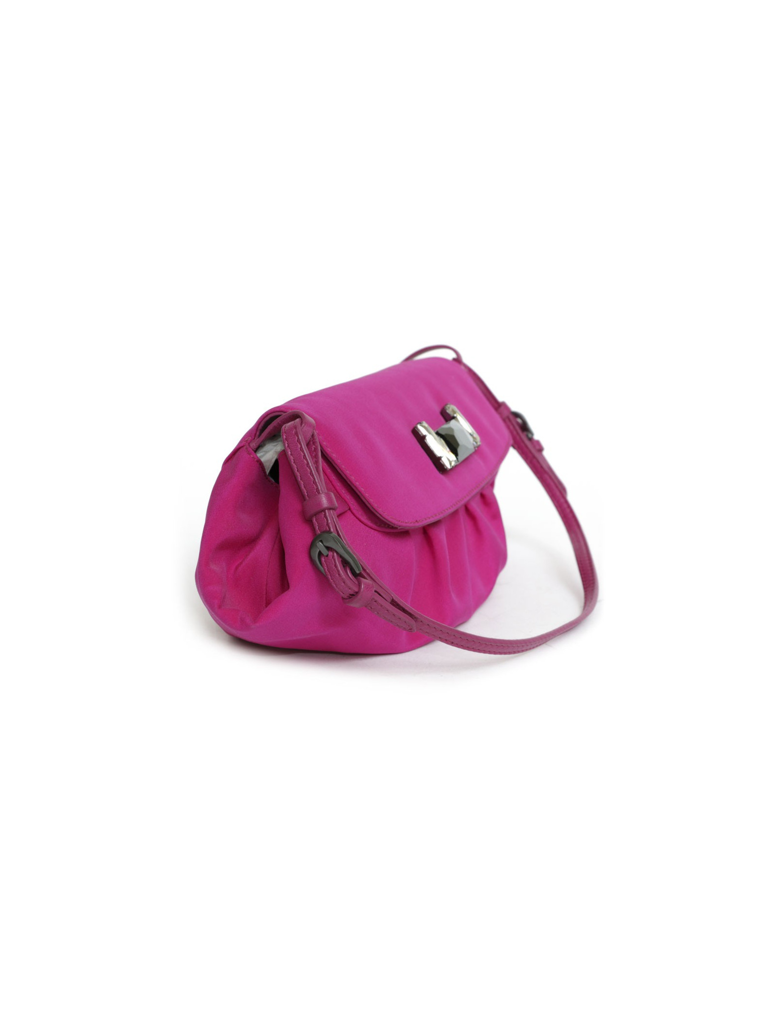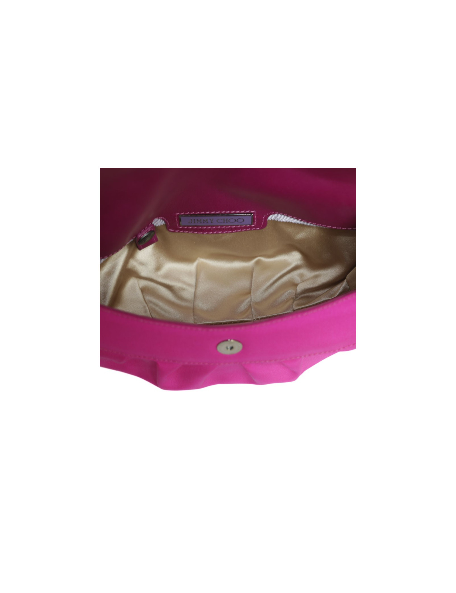 Jimmy Choo mini bag in magenta pink satin. Snap closure. The interior is in beige satin with a small patch pocket. The handle is pink leather. In very good condition.