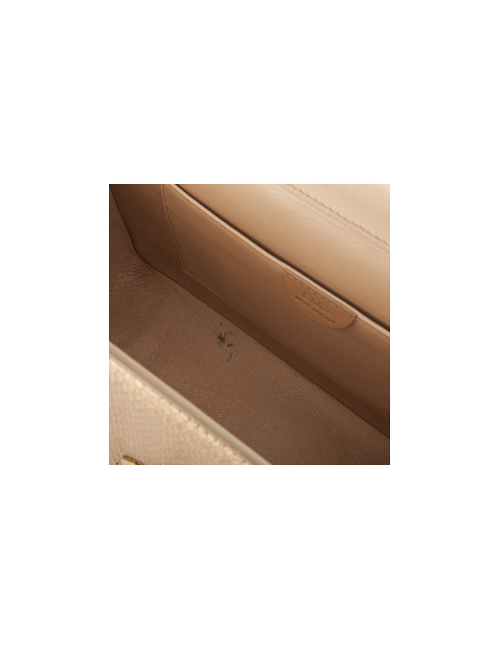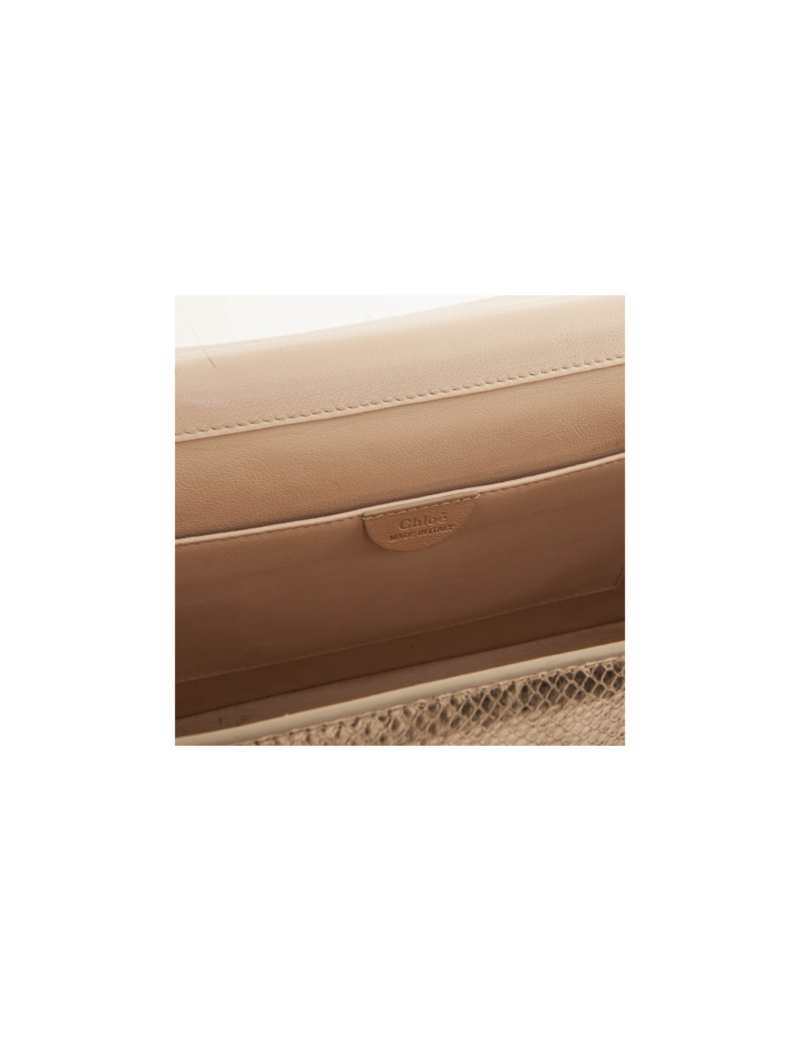 Sac Chloé en python doré. Le fermoir est trèfle doré. L'intérieur est en cuir beige avec une petite poche plaquée. Porté épaule et ou croisé. En très bon état, malgré une petite tâche à l'intérieur.