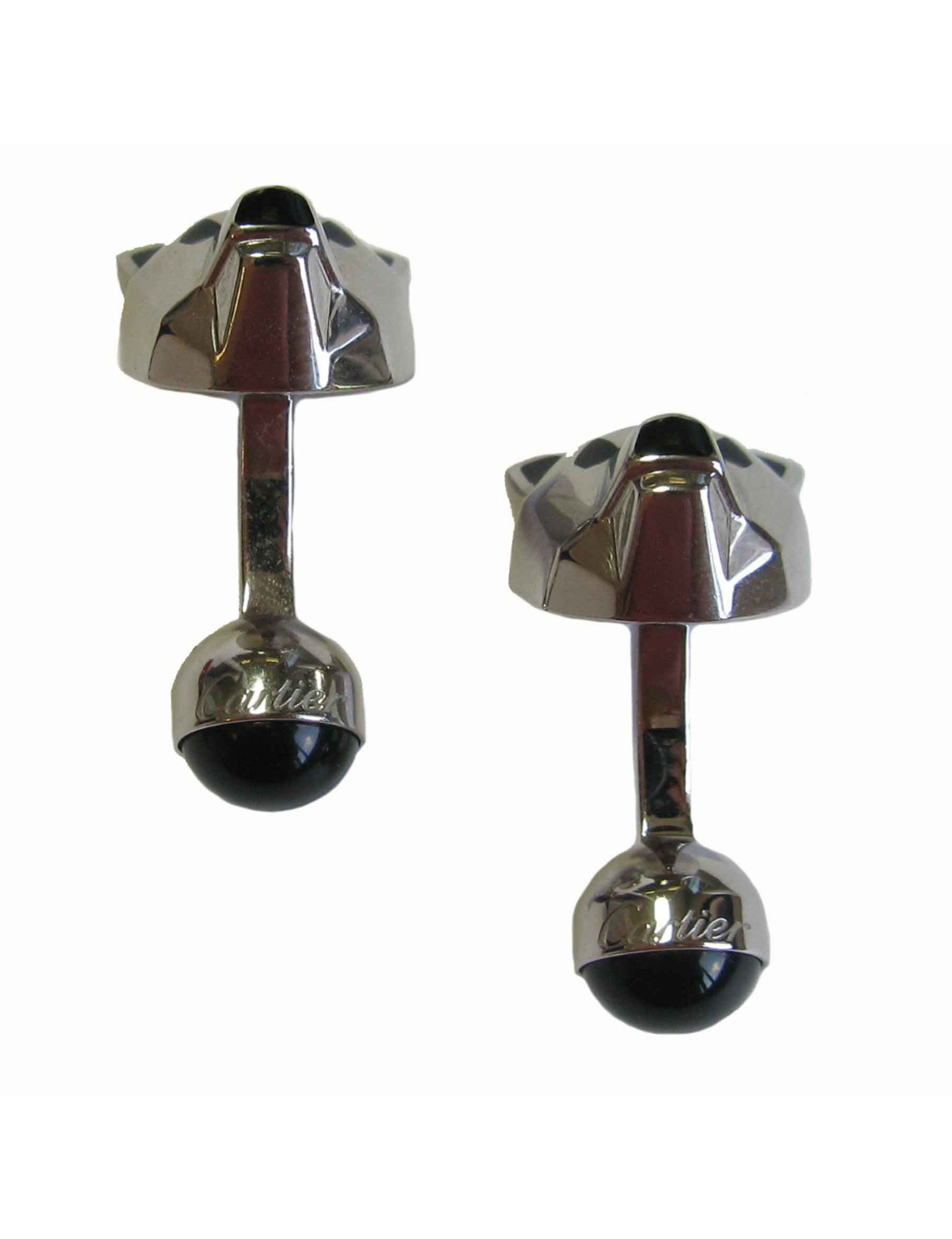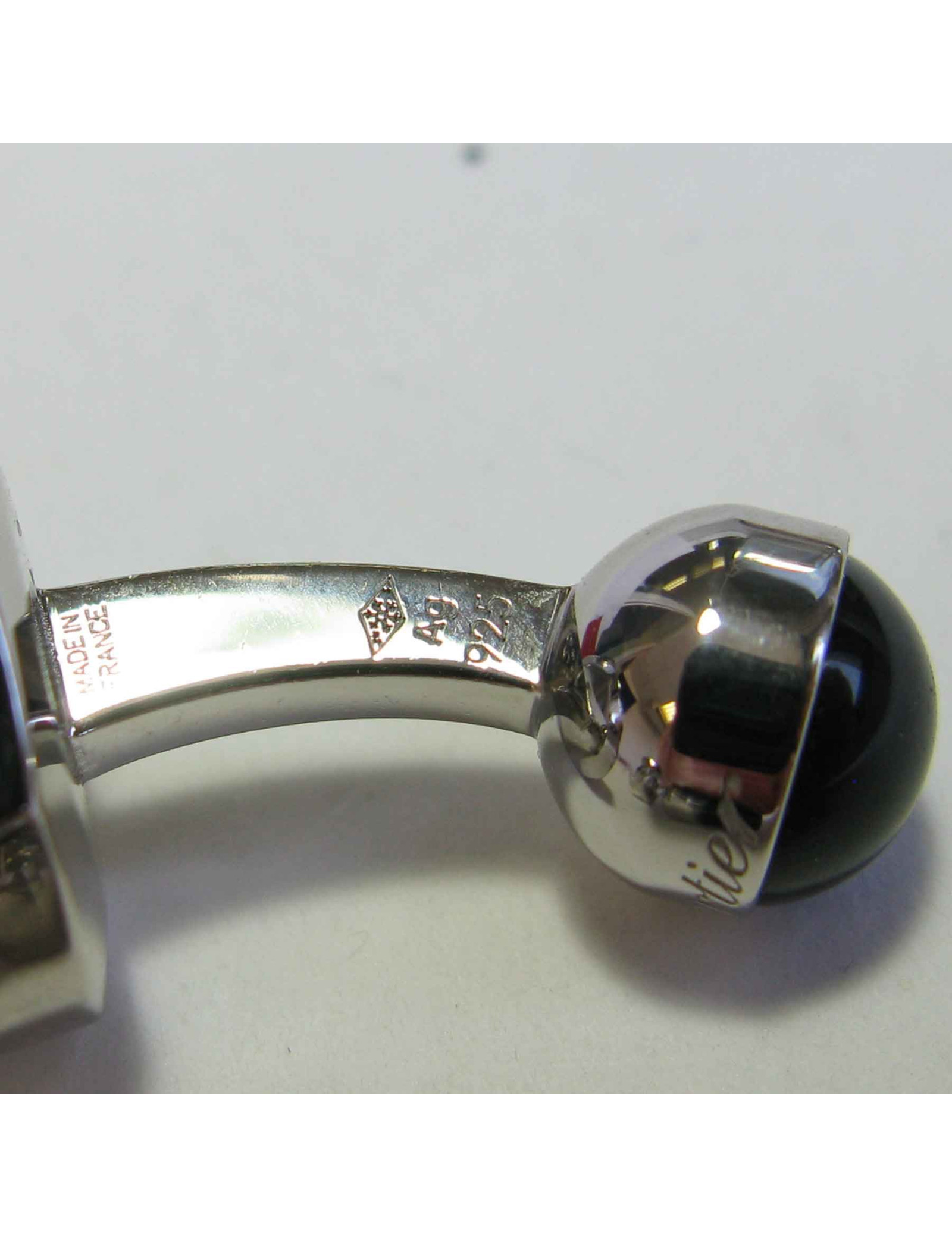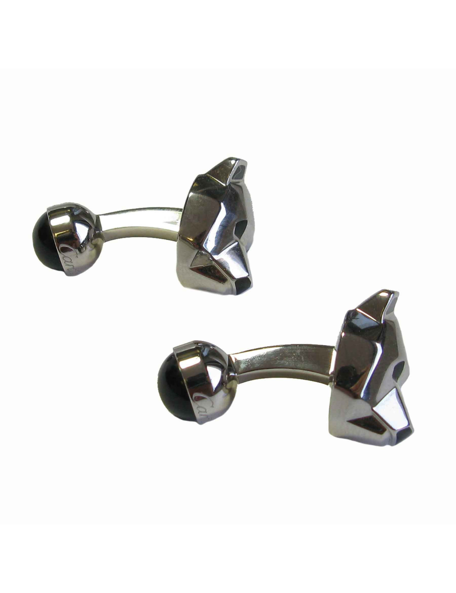 Superbe paire de boutons de manchette Cartier 'tête d'ours' en argent massif finition palladiée et laque noire.