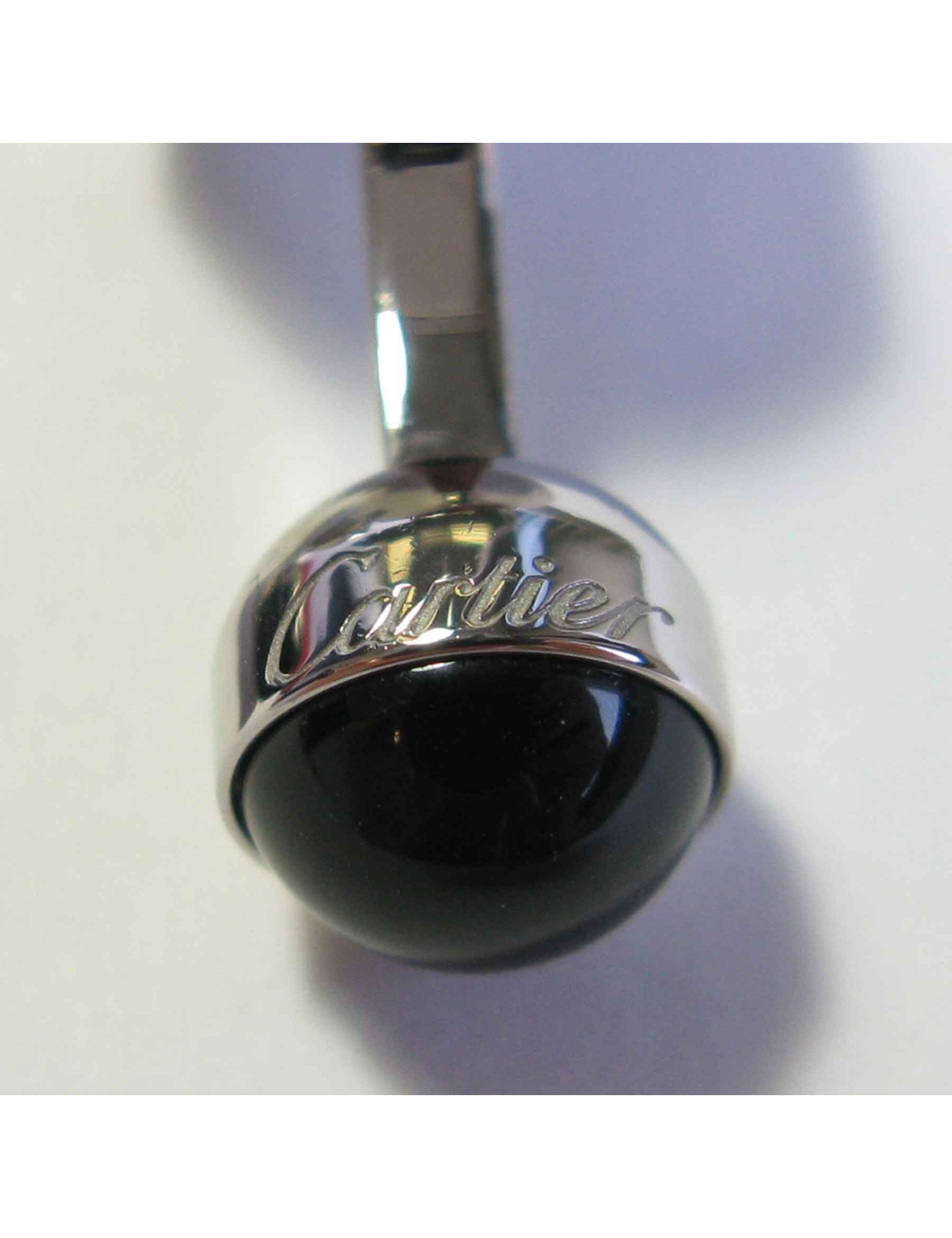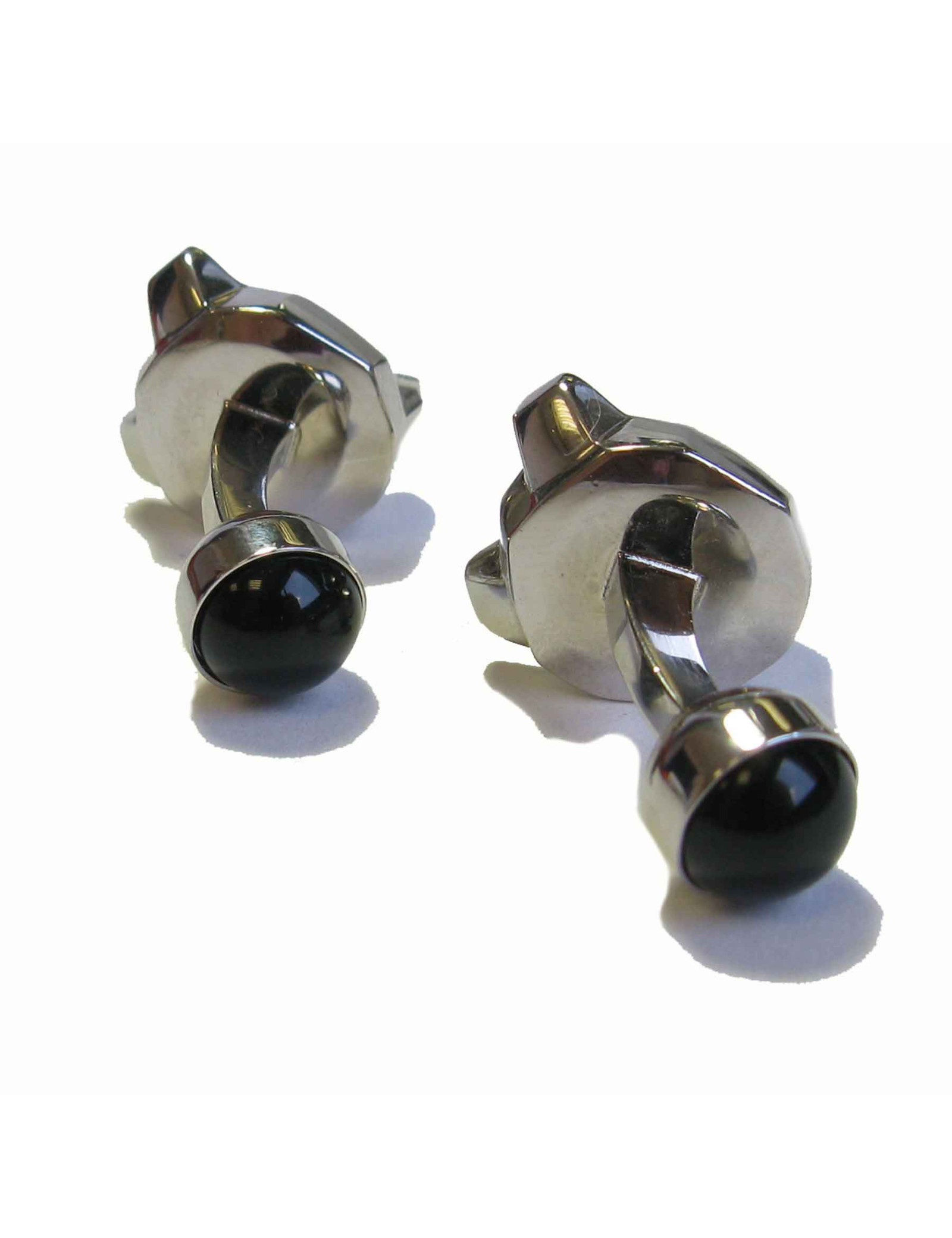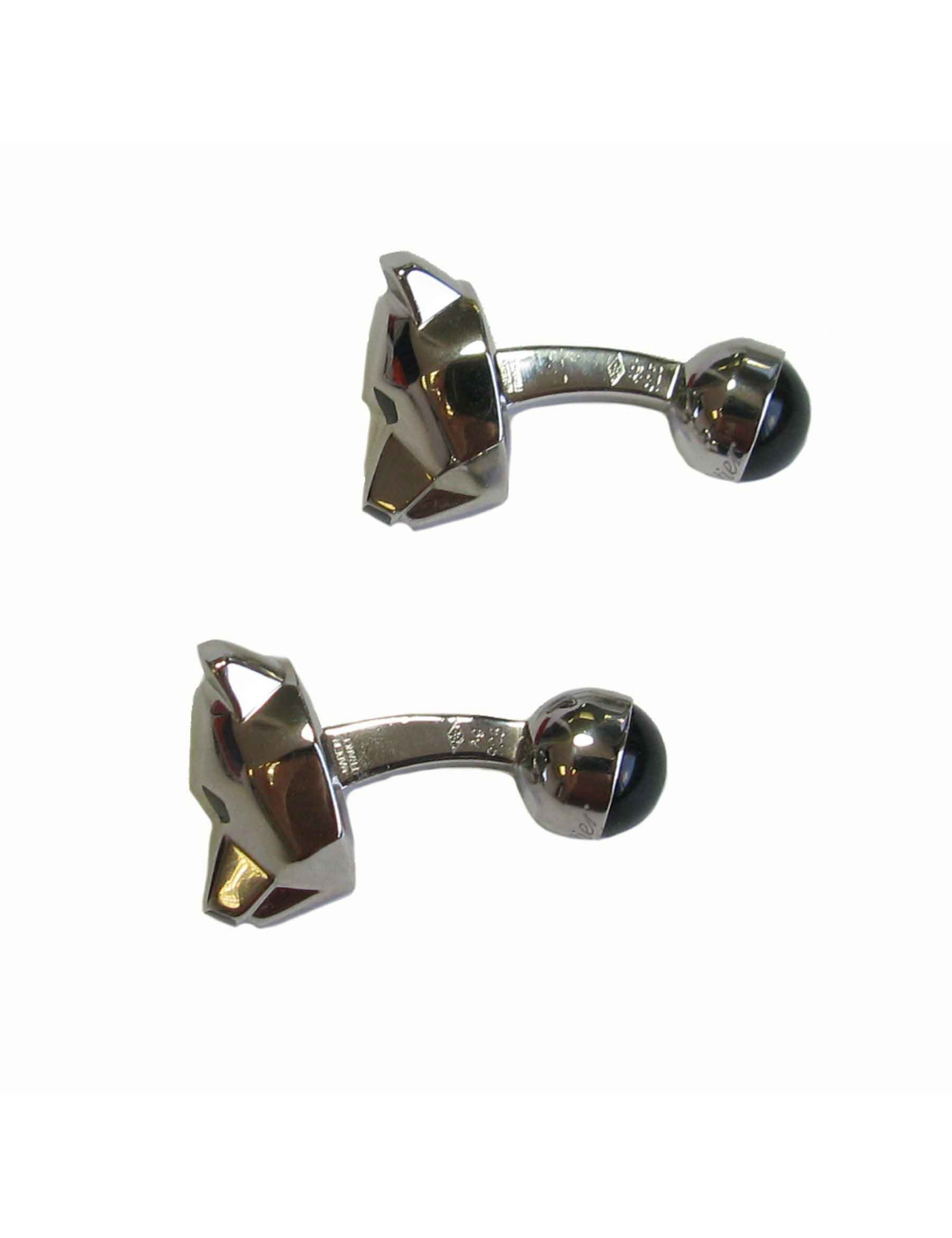 Superbe paire de boutons de manchette Cartier 'tête d'ours' en argent massif finition palladiée et laque noire.