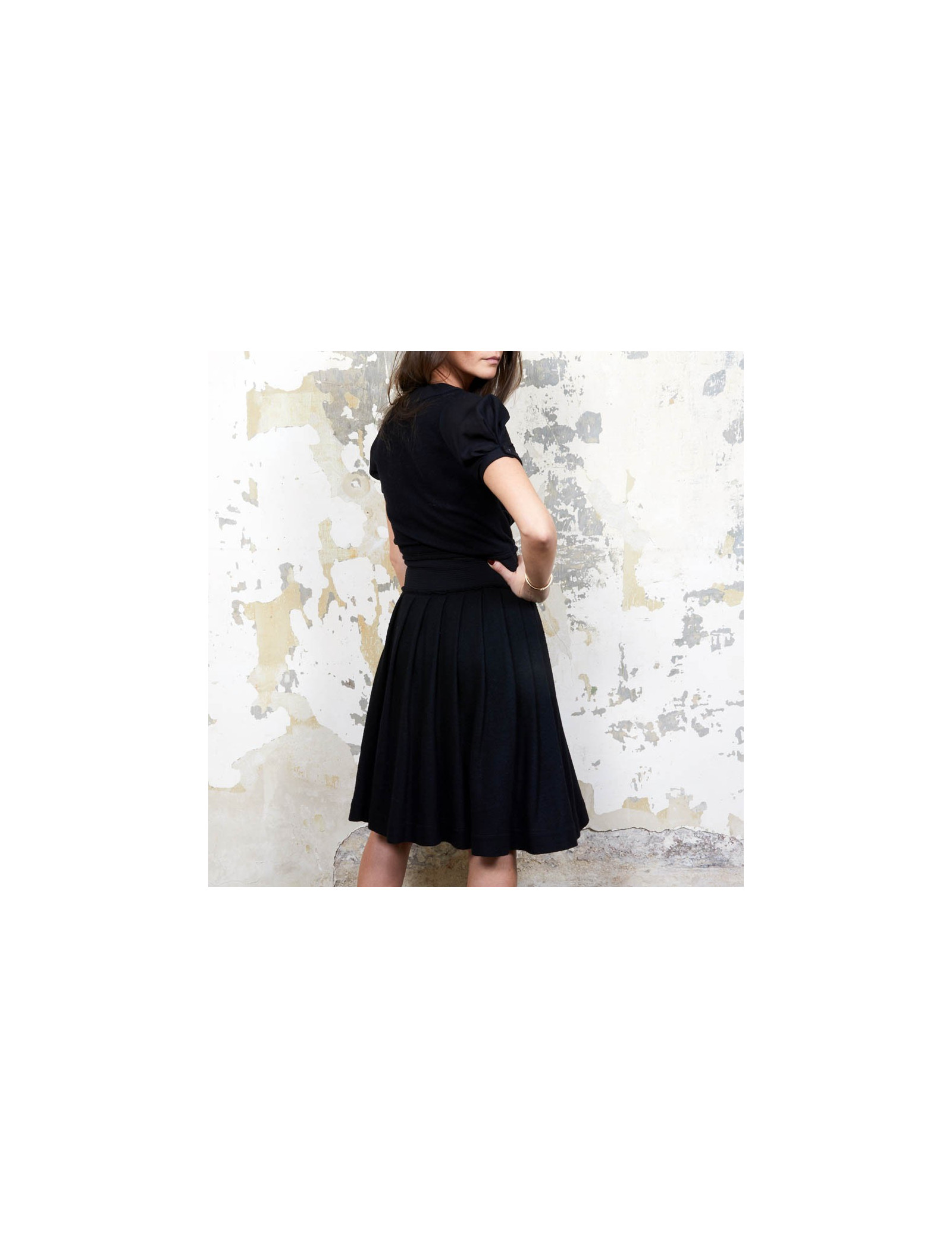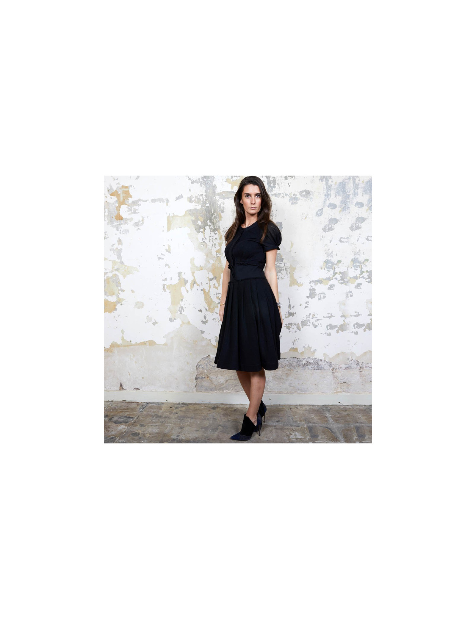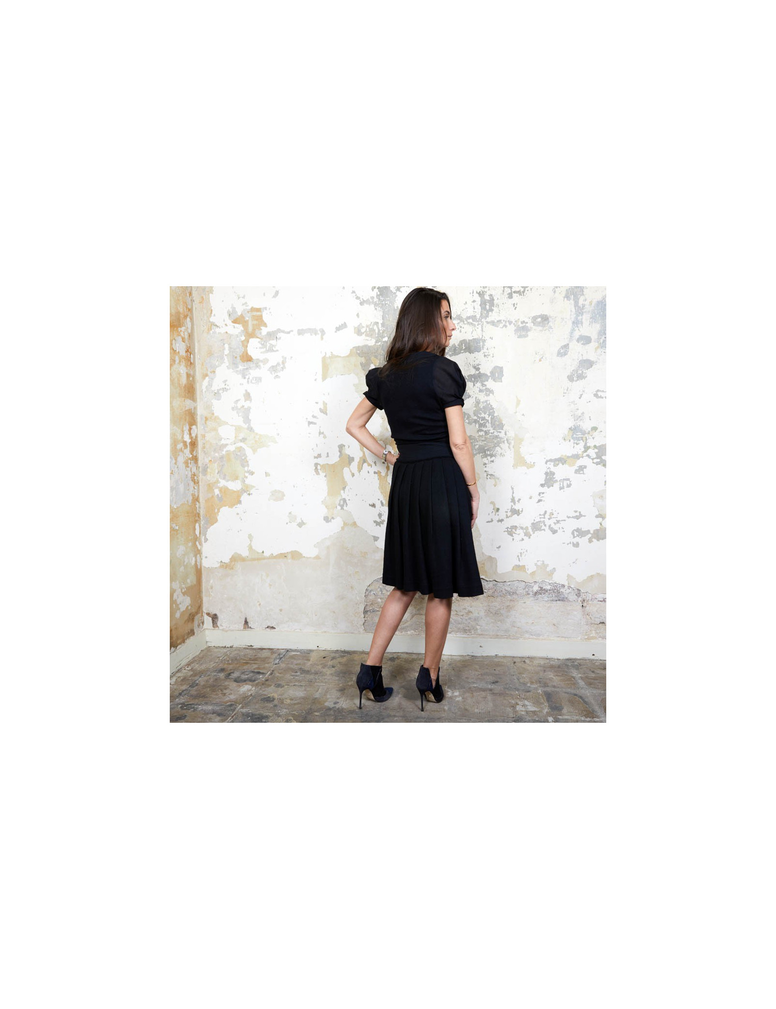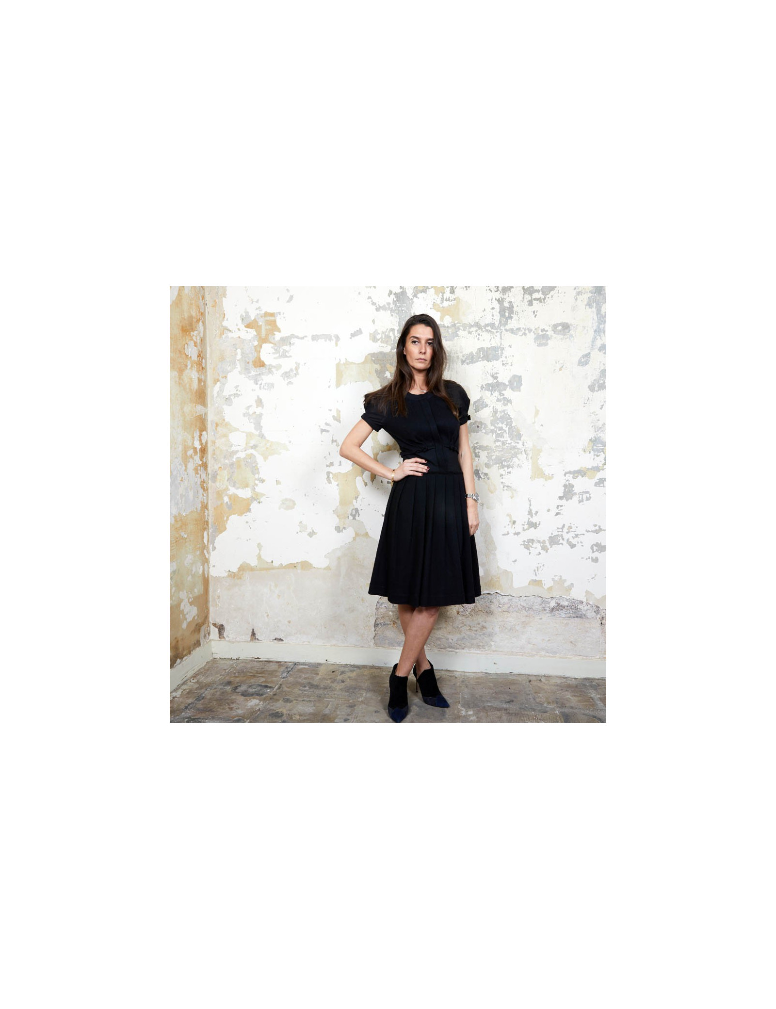 Viktor & Rolf short-sleeved dress with a button closure. It is bent at the waist and pleated and flared. 100% wool. It is lined. It has on the side a long zip of 38 cm.