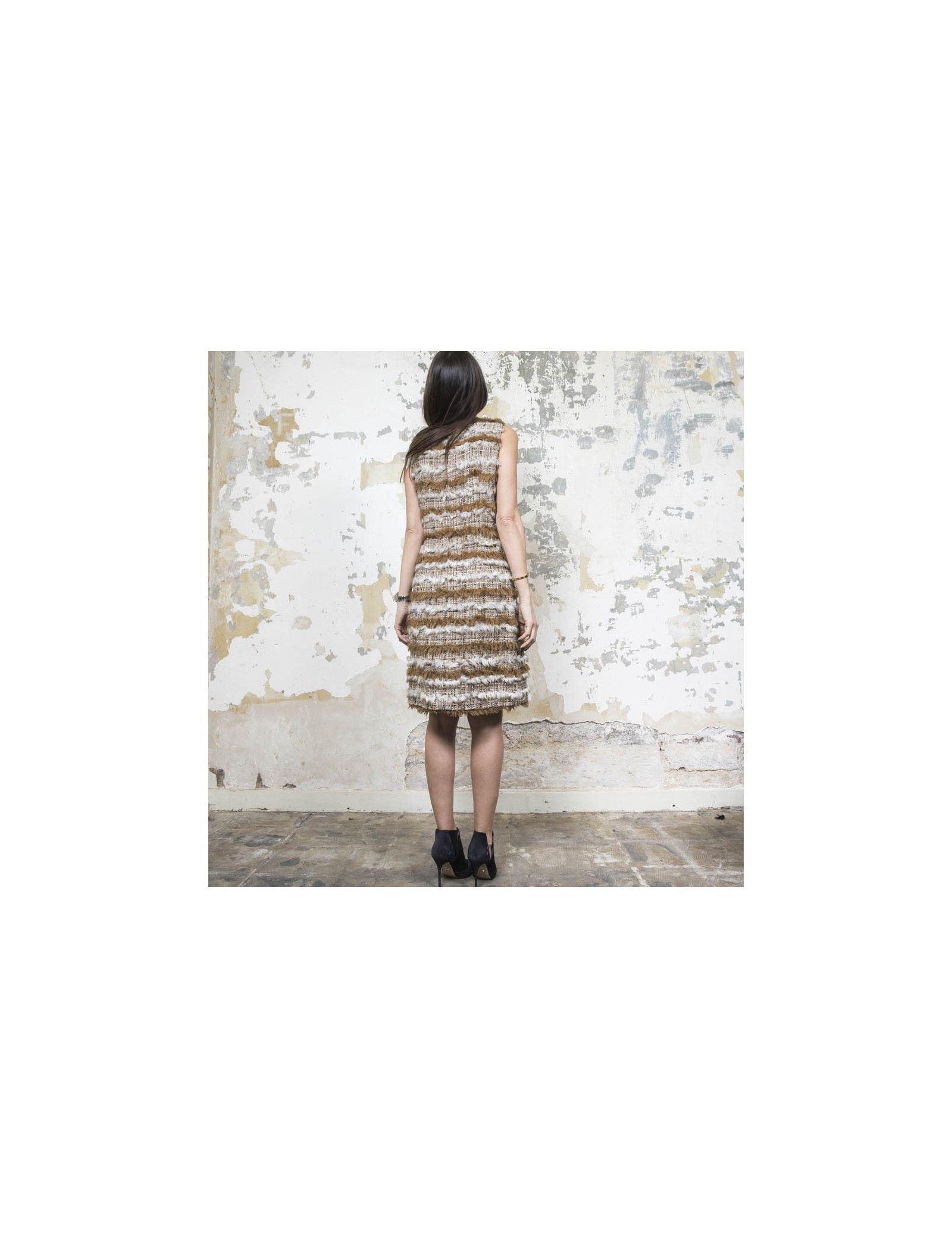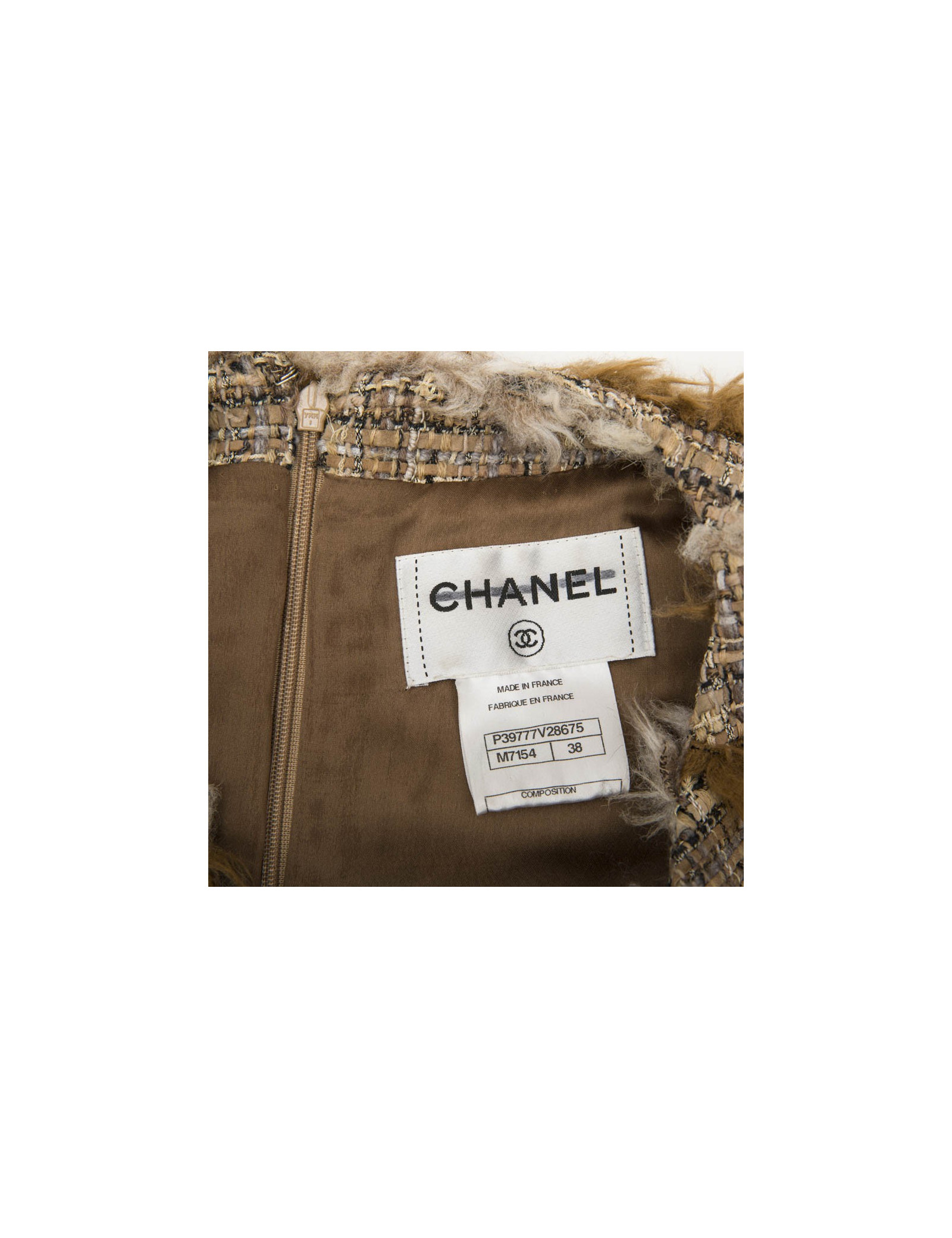 Chanel dress in tweed intertwined leather and wool threads with rows of imitation fur fringes in shades of beige and ecru. 100% copper silk lining. The collar is round and closes at the back with a 60 cm zipper. Size 38FR