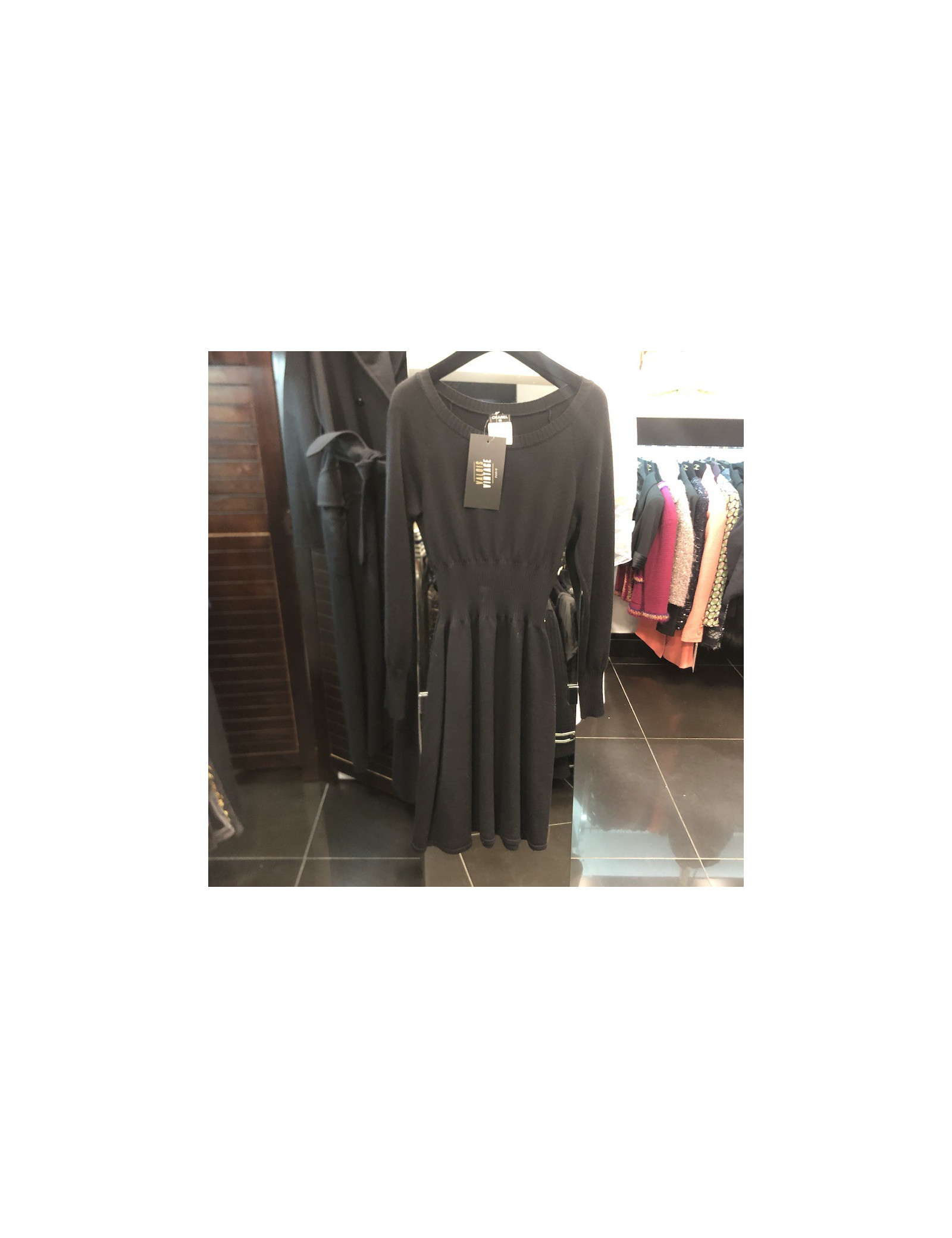 Last items in stock DRESSES CHANEL T36 black cotton dress CHANEL 20027 1,700.00 € Chanel lovely black cotton dress. Size 36 FR. Excellent condition. It is in stretch fabric and has a particularity, its sleeves! There are 3 overlays in white, and black veil. V-shaped. flat dimensions: shoulders 36 cm, chest 40 cm, height 87 cm, width 39 cm. Add to cart