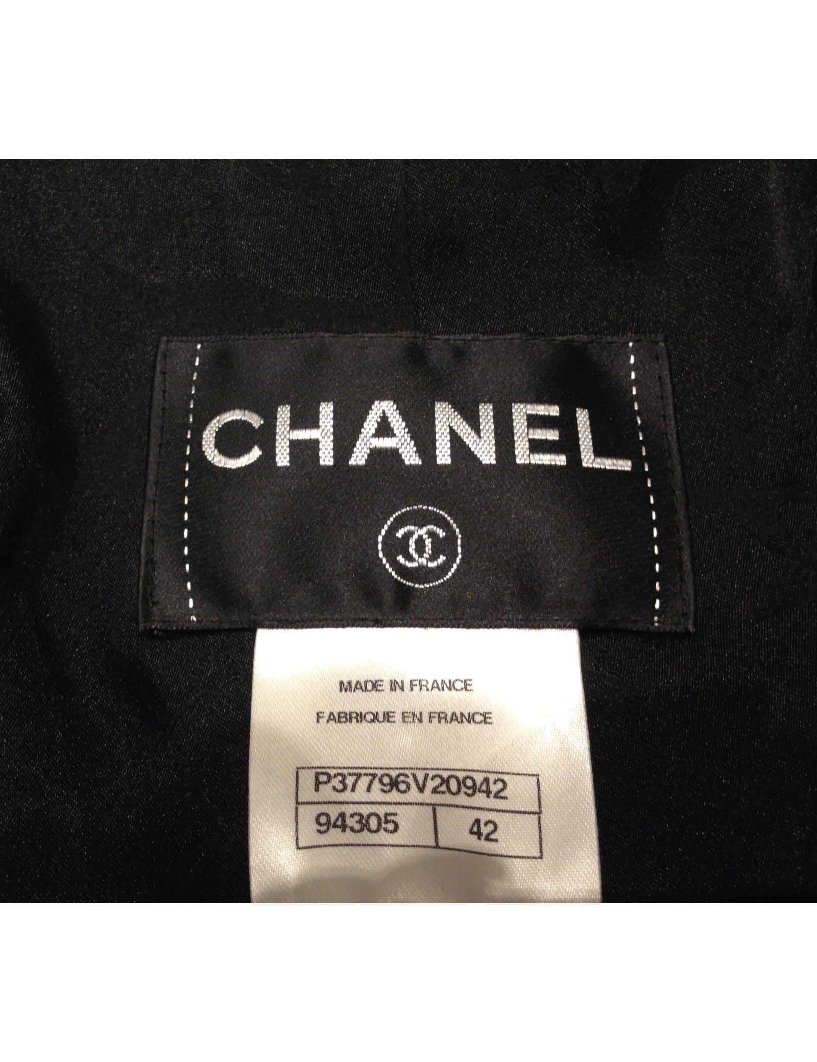 Black CHANEL dress-coat, waist 42, 100% silk. Collection Paris-Versailles 2013. Small short balloon sleeves measure 21 cm. Five beautiful buttons in silver and mother-of-Pearl black are abbreviations CC and agrementes of the mythical chain interwoven with black leather. The dress has two vertical pockets invisible to the hips. At the back of the dress, two slots provide volume and fluidity in this sumptuous room. This sublime dress is sold in a beautiful fabric cover Chanel. Retail price: € 4000.