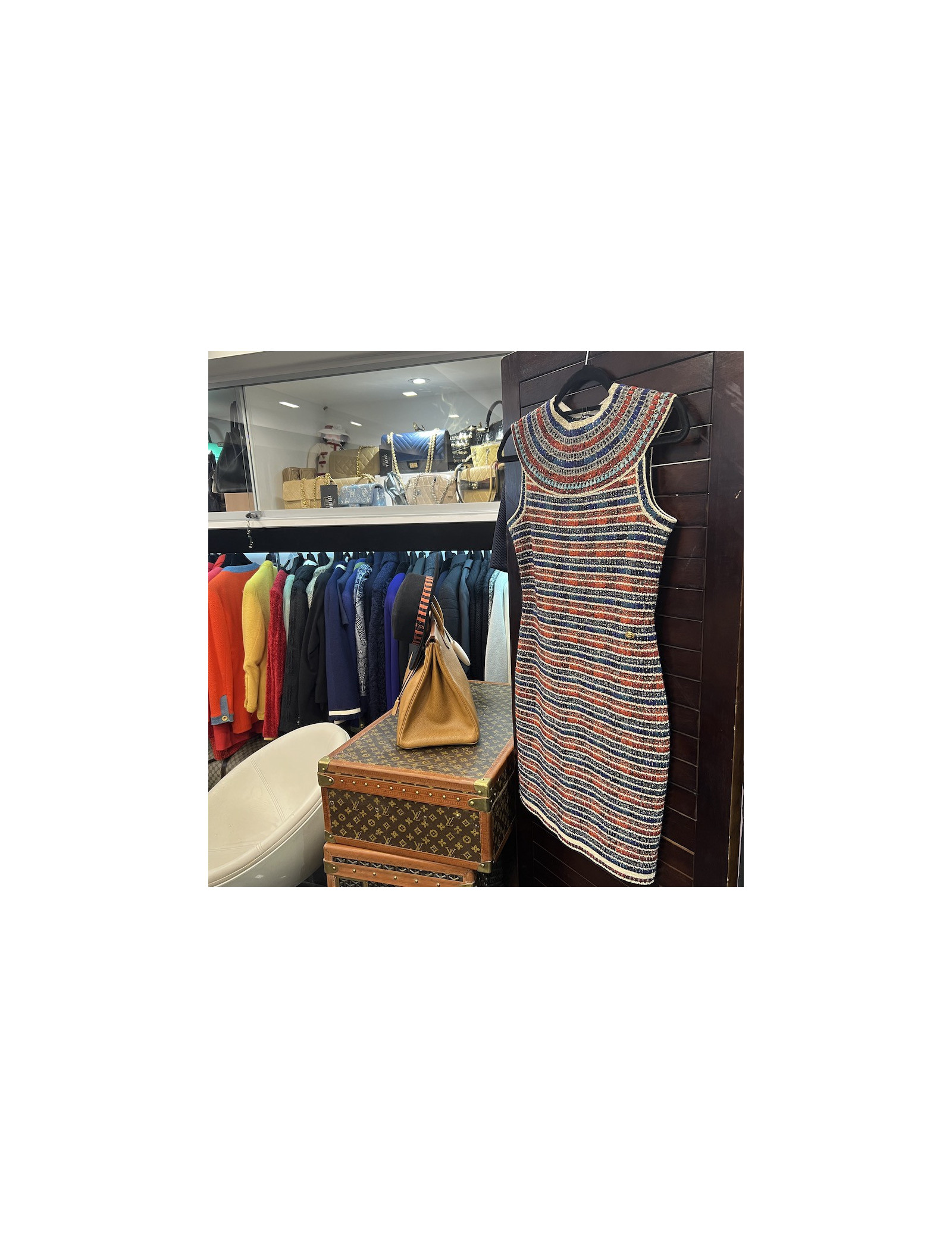 Last items in stock DRESSES CHANEL black and white dress with geometric pattern CHANEL 25132 2,300.00 € Chanel sweater dress with geometric pattern Condition: very good Made in France Model: sweater dress Size: 38FR Materials: wool, angora, mohair Colors: black, white Measurements: total length 94cm, shoulders 42cm, bustline 46cm, sleeves length 58cm, wrist circumference 45cm, bottom width 94cm Details: Chanel sweater dress size 38FR, in wool, mohair and... Add to cart