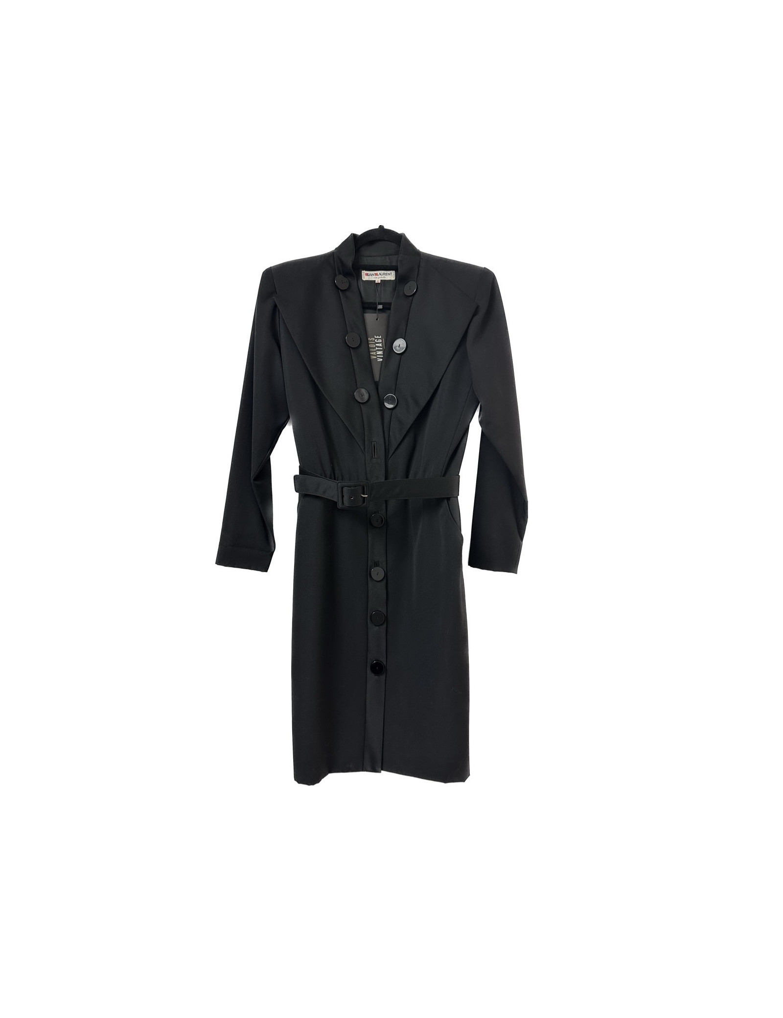 Details: One button missing. Magnificent black belted dress buttoned from top to bottom. Collar with wide satin lapels and decorative buttons. Two large pockets. Can be worn as a dress or an overcoat.