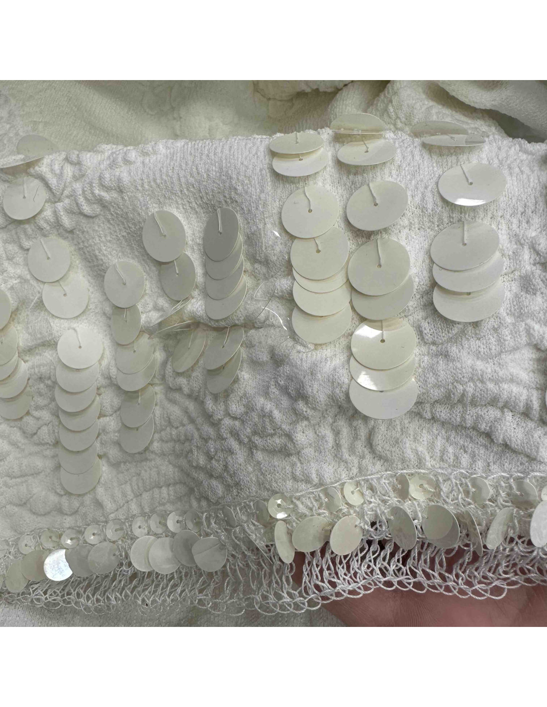 Details: Sleeveless summer dress with a white on white embossed floral pattern. The bottom hem is decorated with white sequins.