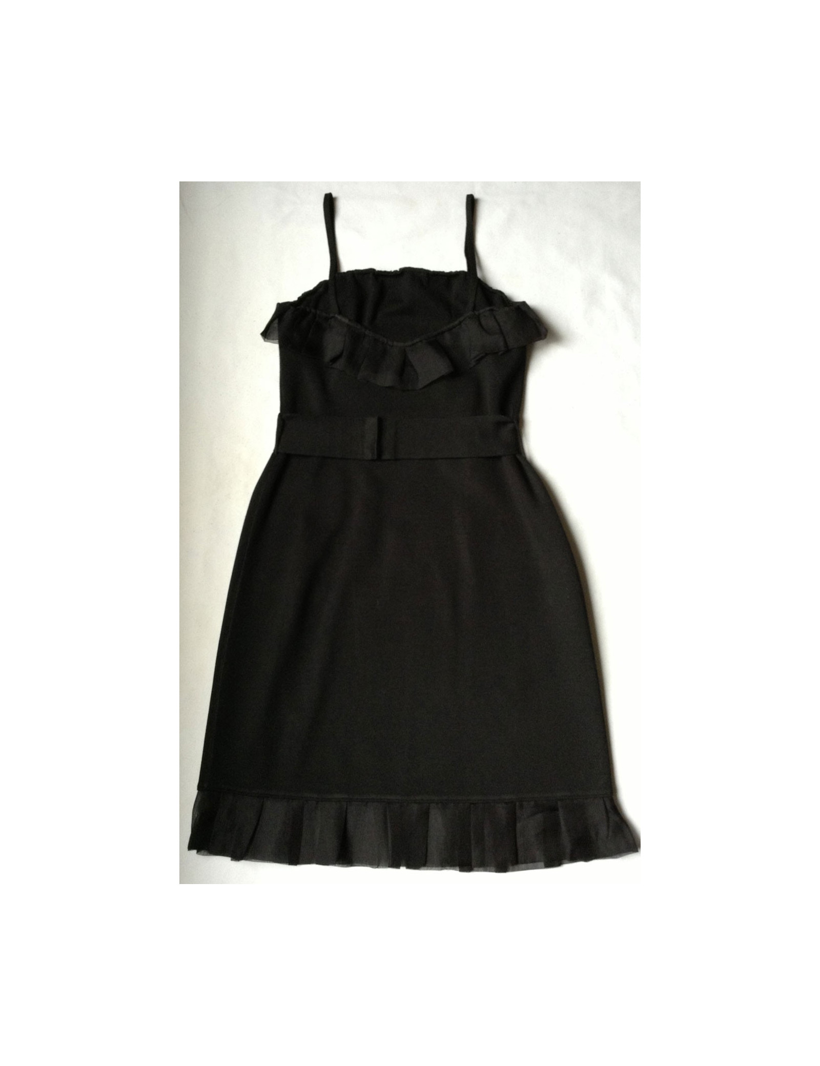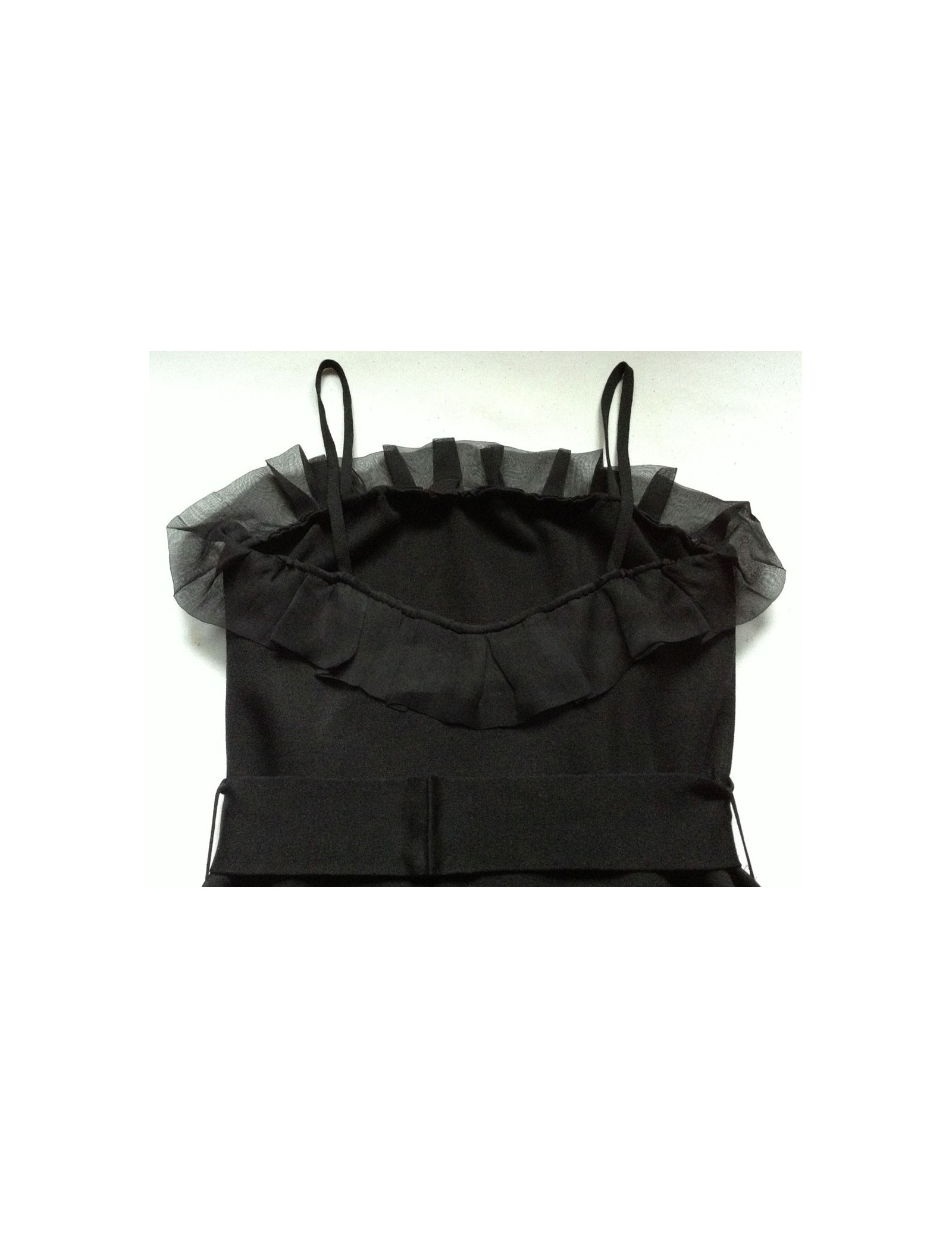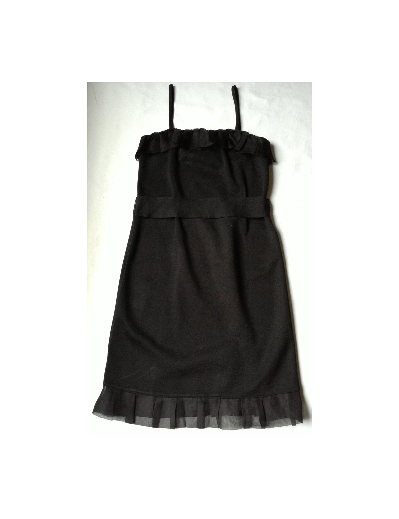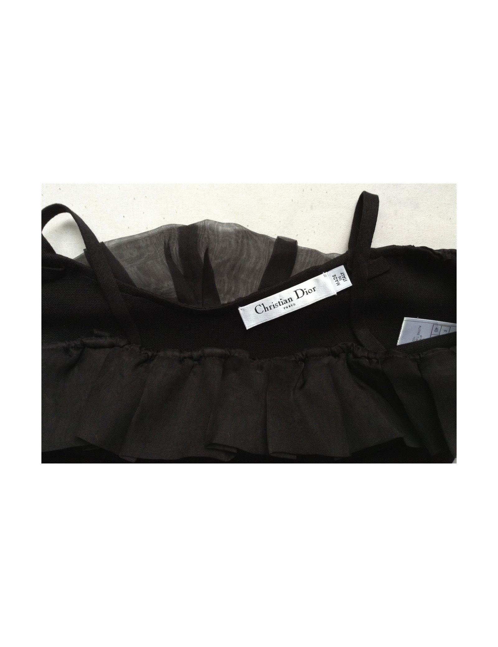 Robe Christian DIOR à fines bretelles noire T40FR, agrémenté d'un large volant en soie noir tout autour du décolleté ainsi qu'à l'ourlet . Découpe soulignante, cintrée par une jolie ceinture assortie au tissu de la robe. Taille 40FR. Composition: 59% soie et 41% coton. Un élément essentiel de votre garde robe!