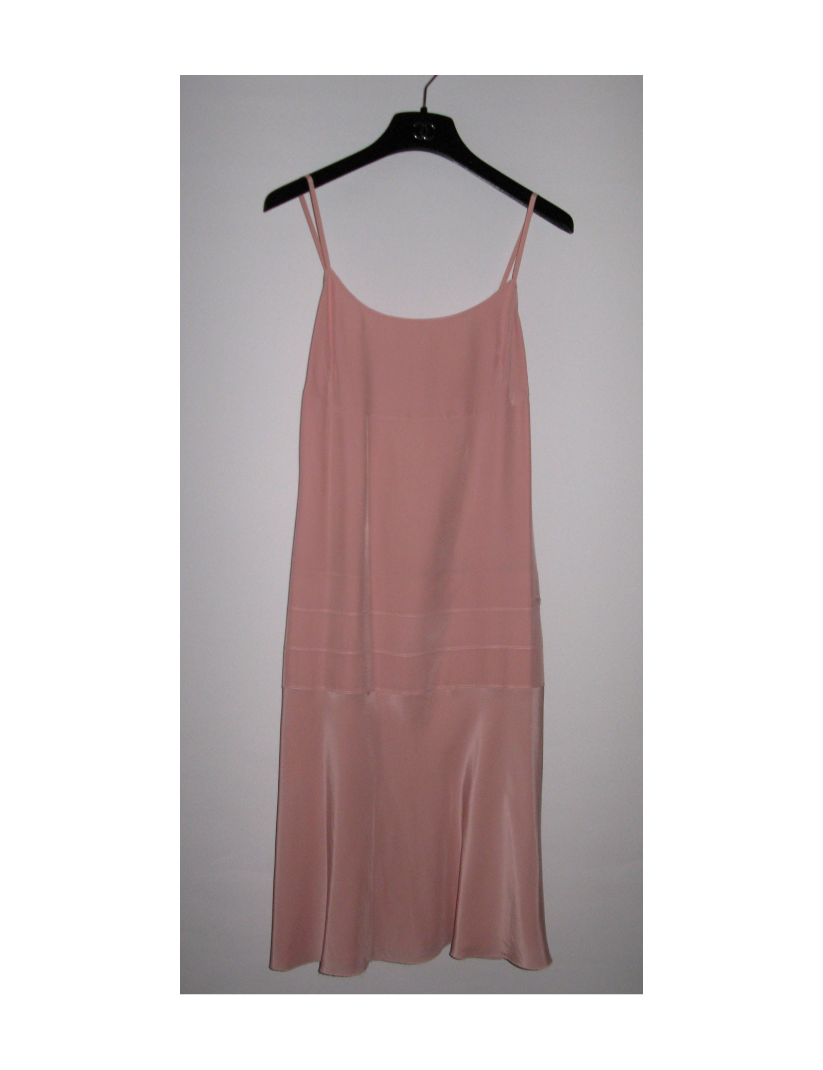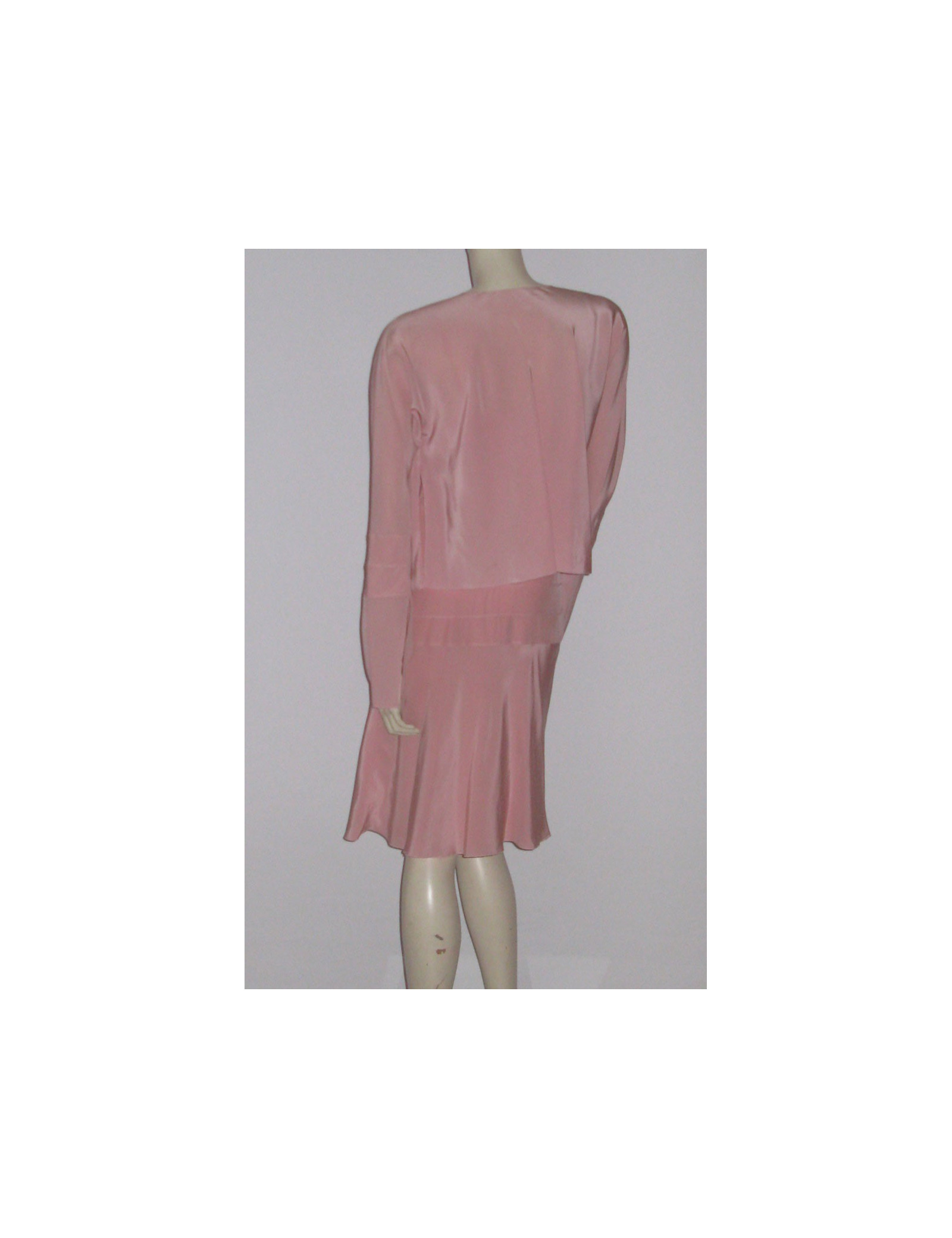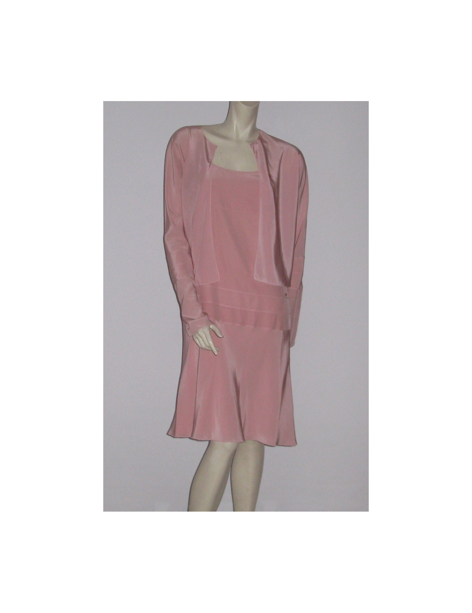 Set consists of a dress and a jacket, Chanel in crepe powder pink silk. Camisole, straight neckline dress adjusted line effect 'size' low wide band topstitched tone on your pink bypassing size decorated with a small inscribed pink plate "Chanel" on the right hip and flared at the bottom. Invisible back zipper. Slotted short jacket on the sides, sleeves also split and flared at the bottom of the wrists, pink stitched band on each wrist. JACKET: Length: 50 cm, Chest width: 54 cm Length of sleeves: 65 cm, Build: 38 cm DRESS: Length: 87 cm, Bustier: 41 cm Waist (flat): 42 cm, Hip: 46 cm