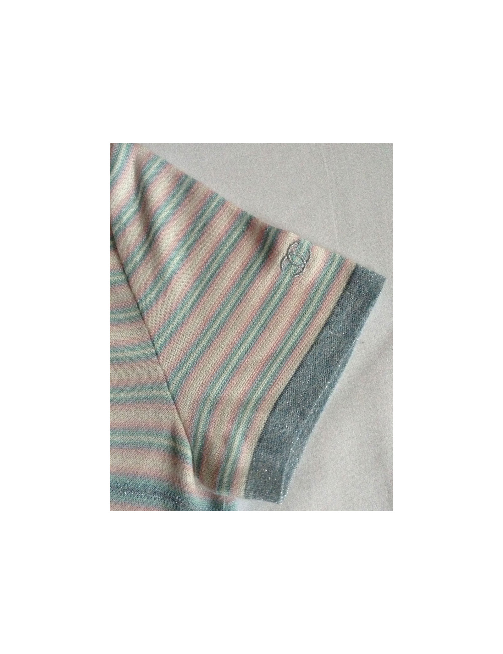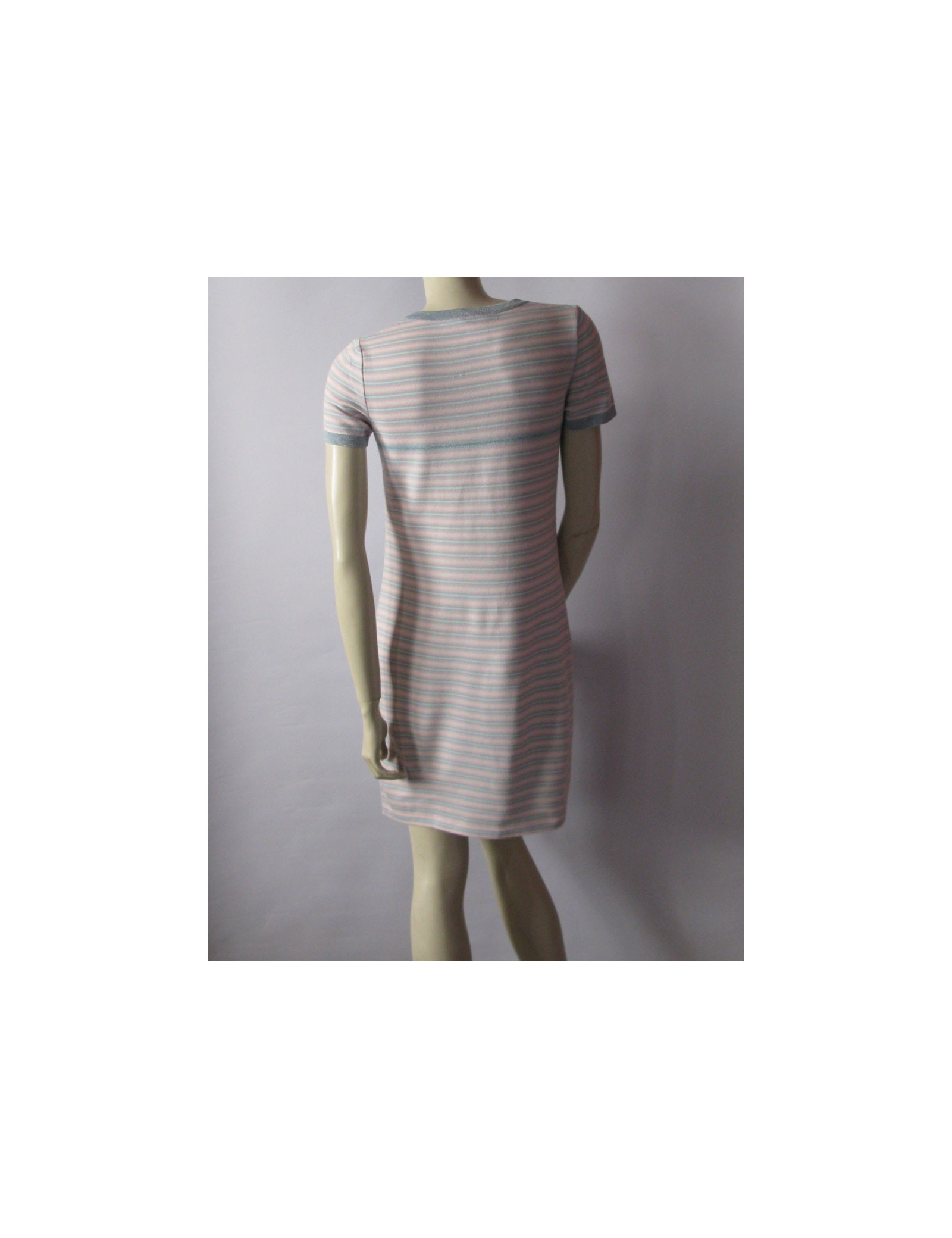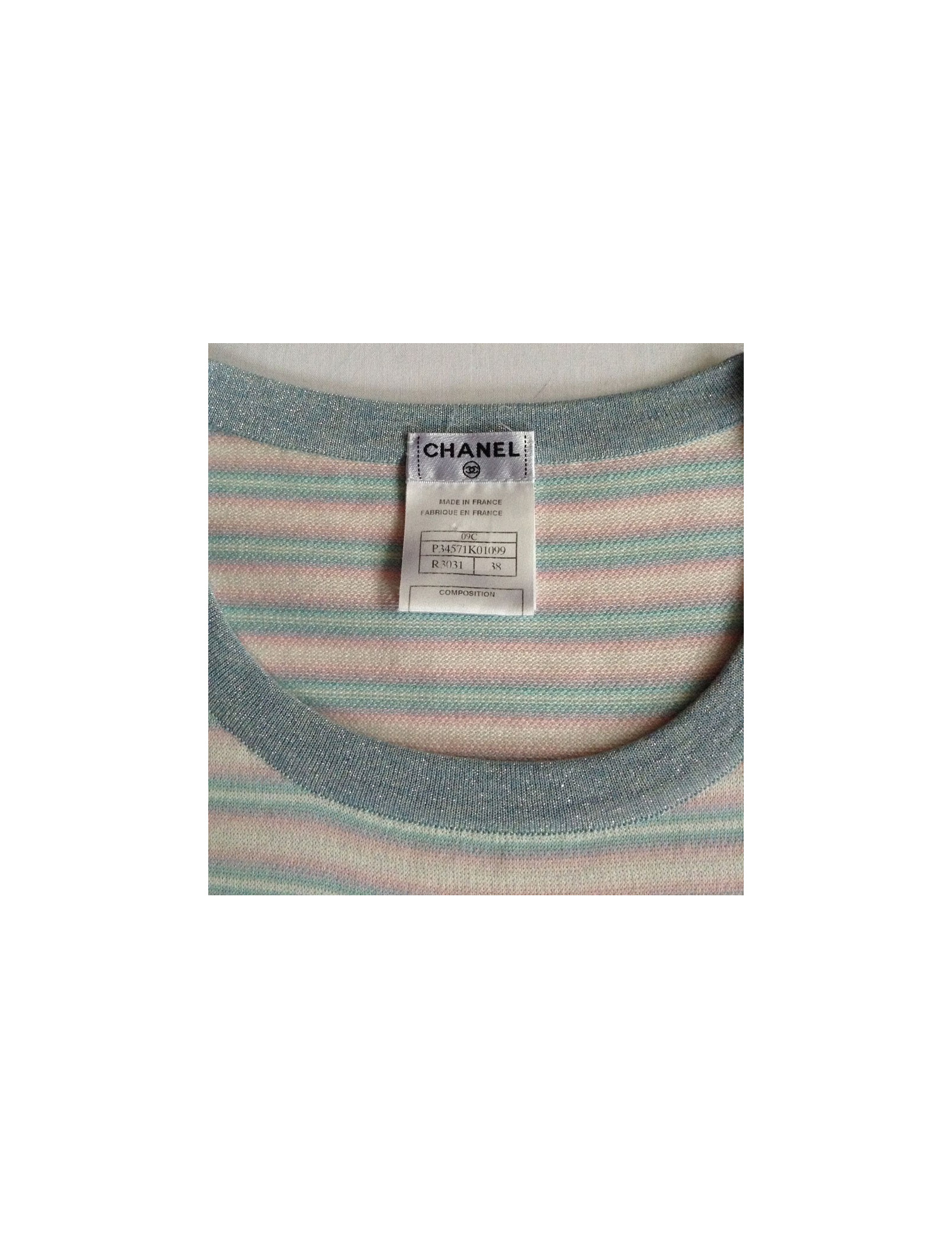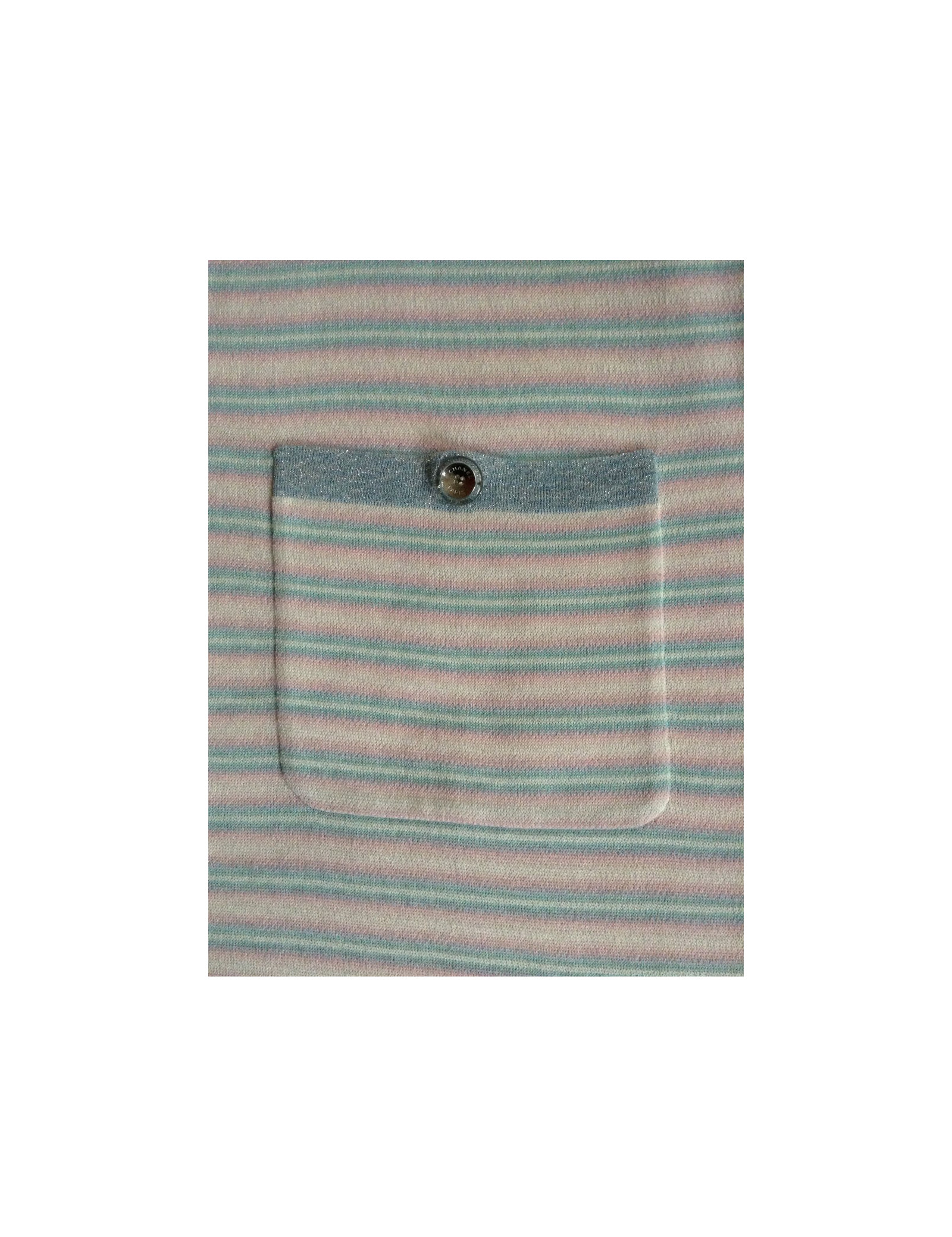 A fresh look for this summer! Dress CHANEL short T38Fr, with horizontal stripes in pastels. Short sleeves with CC embroidered on the left sleeve, collar round lurex grey/bluish as well as on the edge of the 2 front patch pockets, decorated with beautiful buttons transparent acronyms "Chanel Paris". 88% cotton, 9% cashmere.