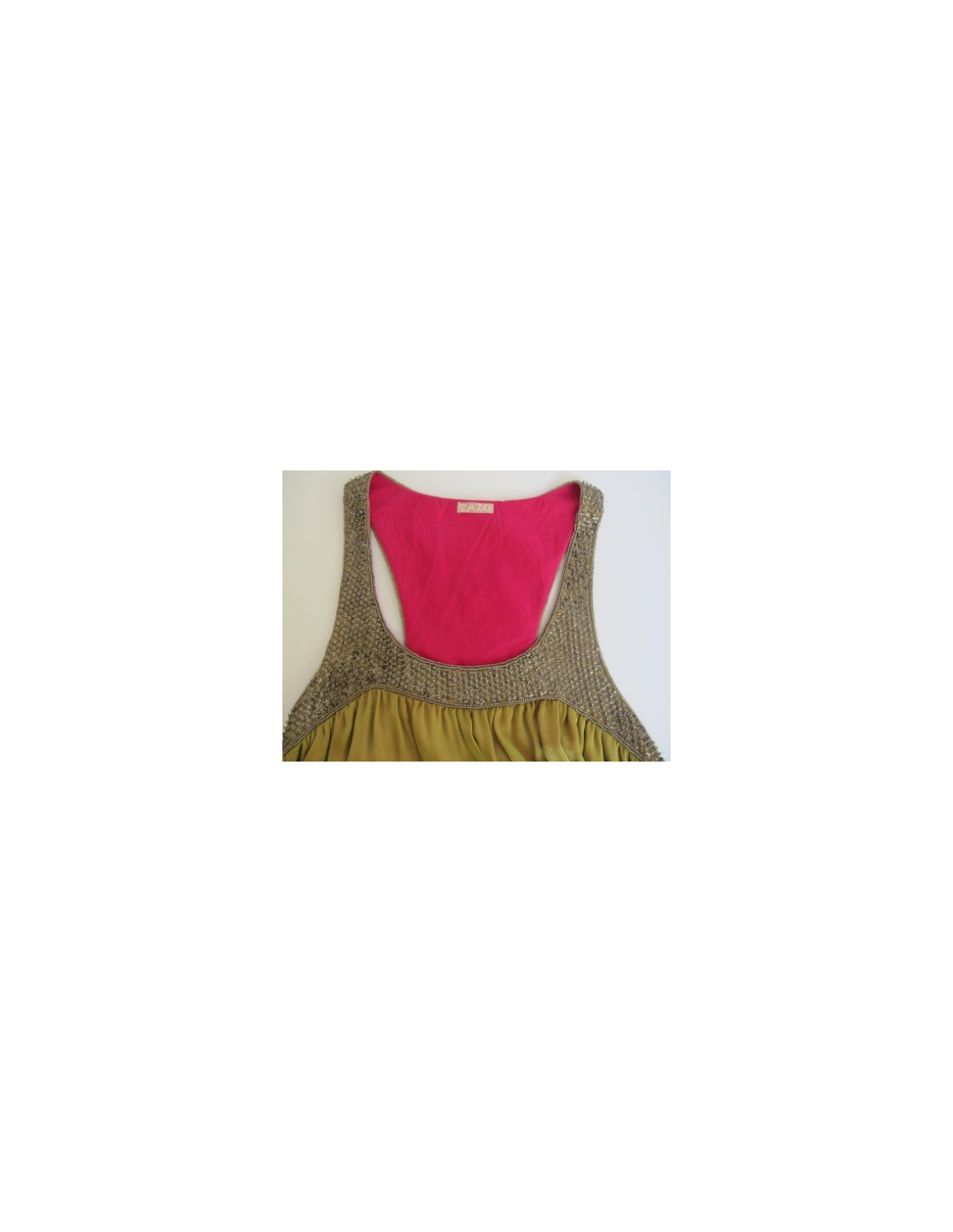 Ravishing! Dress bicolor Zakir sleeveless, rounded front neckline, back swimmer. The knees, fluid, line trapeze dress. Her top is embroidered with sequins adorned with bronze-colored beads and her bottom is in green silk. Lining fushia. Size 38. 100% silk.
