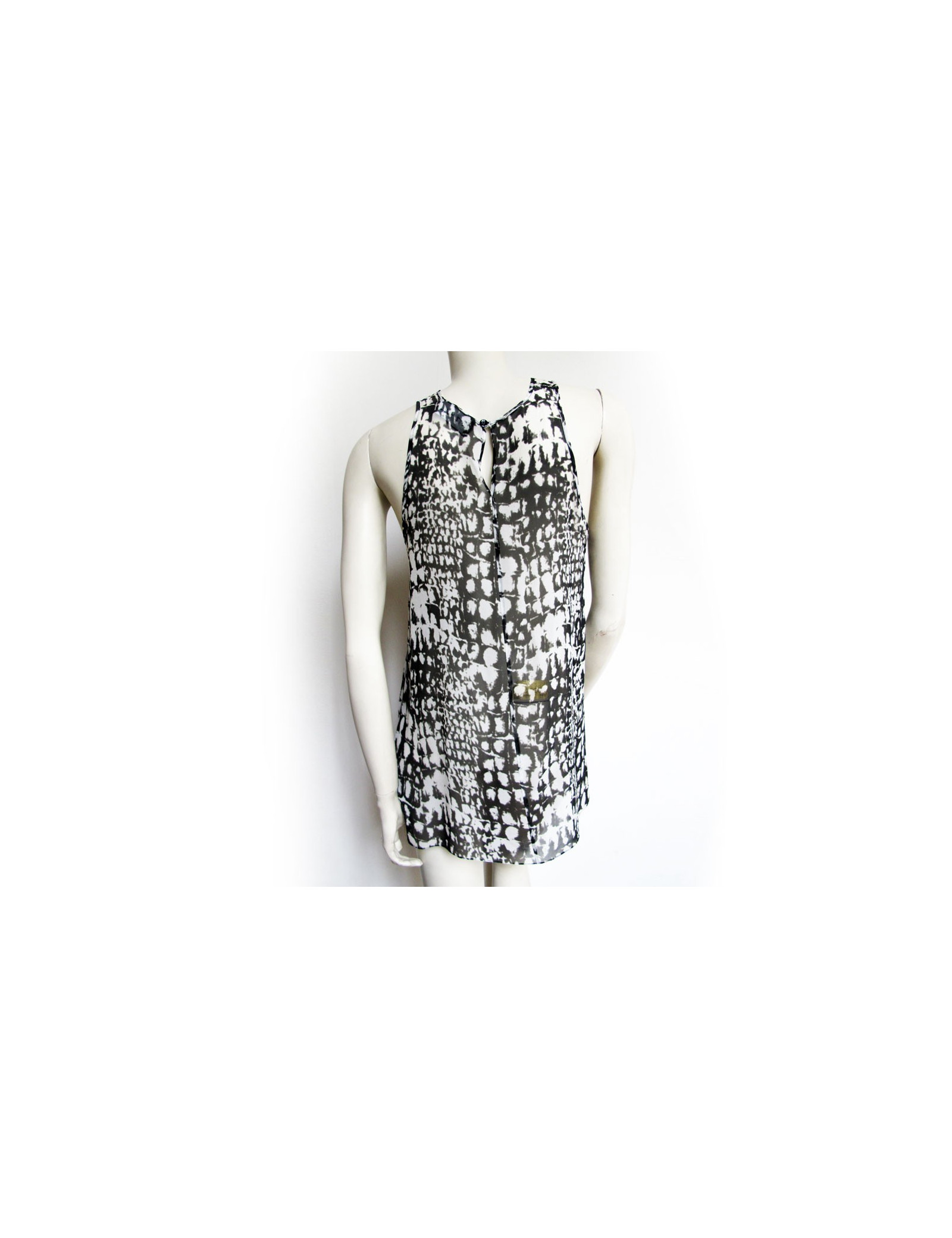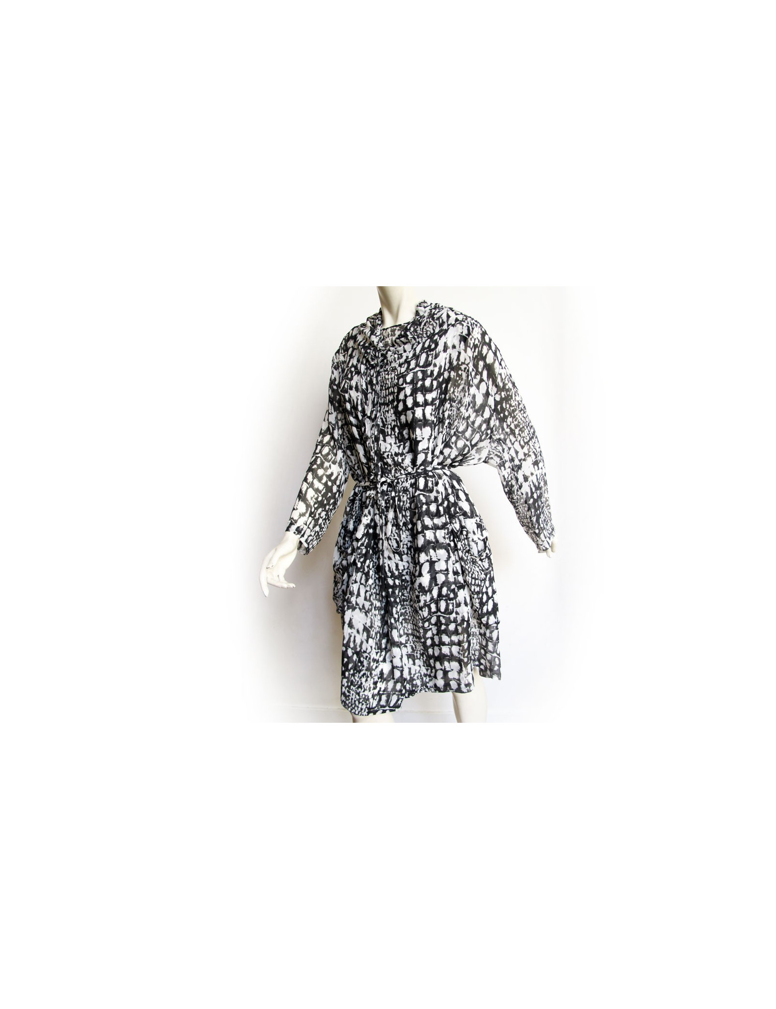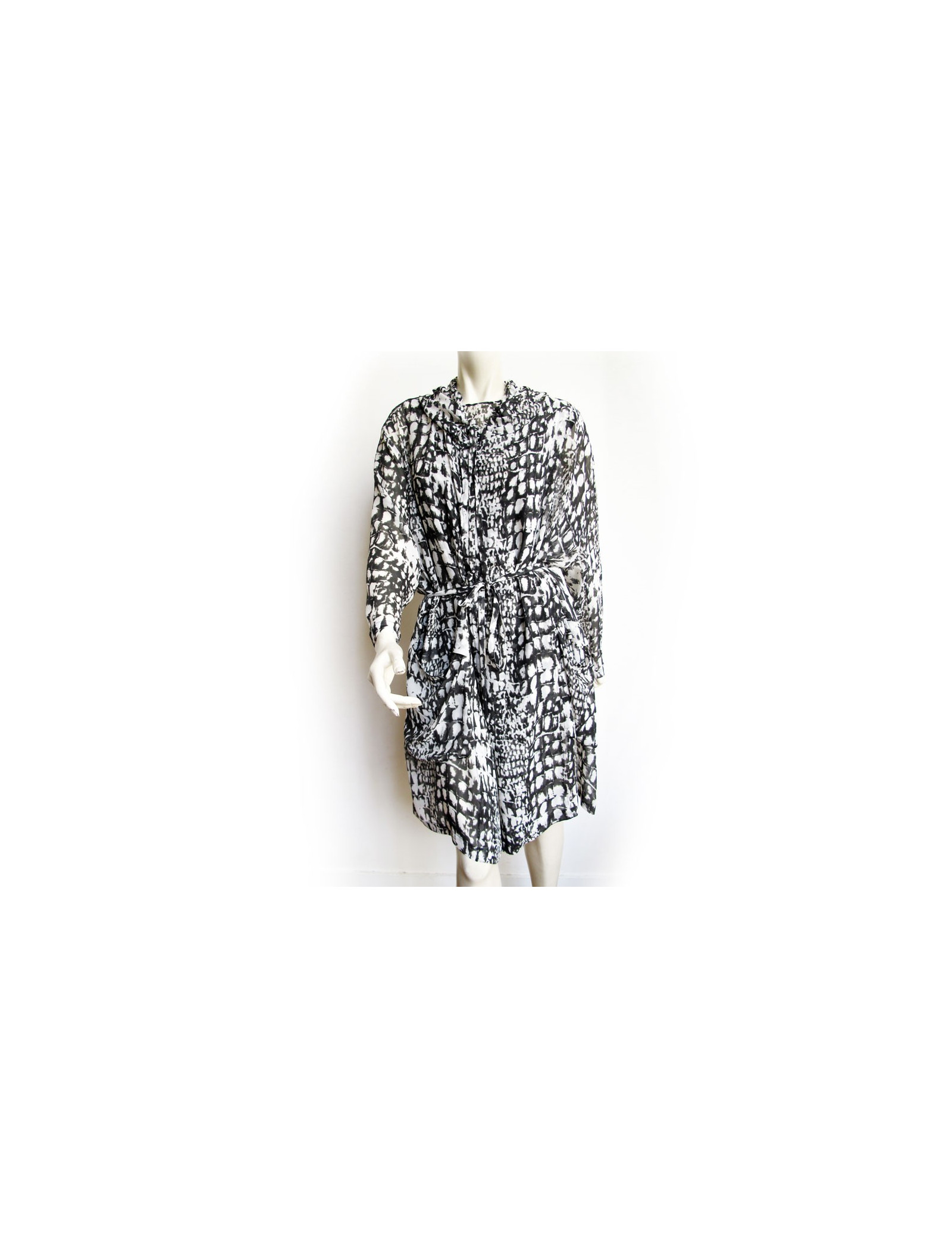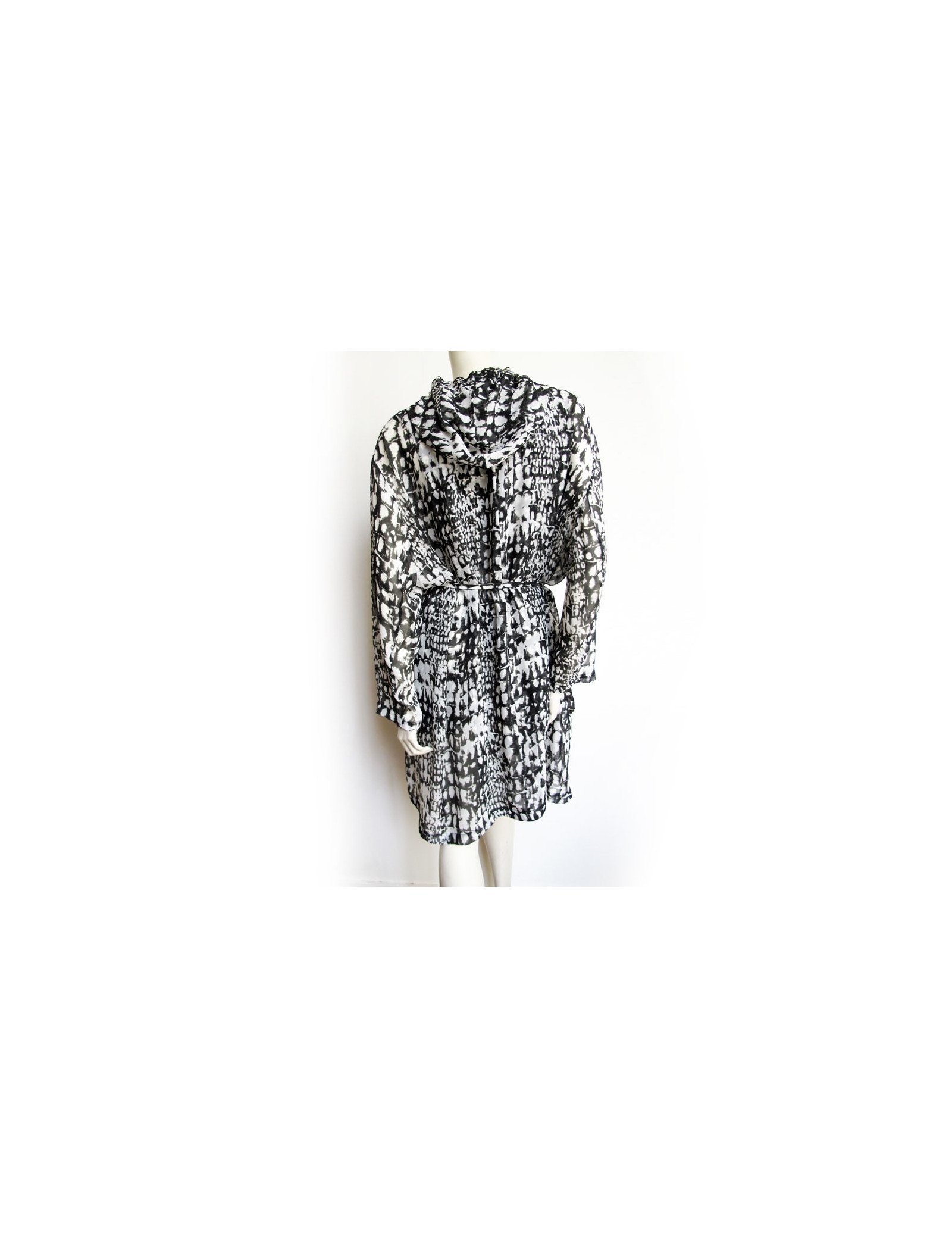 All dress and silk LUTZ HUELLE T36 top, printed black and white. Top/tank top in transparent silk with a very fluid and loose-fitting dress. It has a hood and a belt in the same material and size quits using pressure. It also has a large pocket of each side. In very good condition. TOP: Height: 67 cm, Width: at the level of the chest: 45 cm,At the bottom of the top width: 61 cm, Shoulder width: 3.5 cm dress: Height: 95 cm, Sleeve length: 54 cm,Shoulder width: 7 cm, Width at the level of the chest: 71 cm,Width at the waist: 74 cm, Knees width: 78 cm