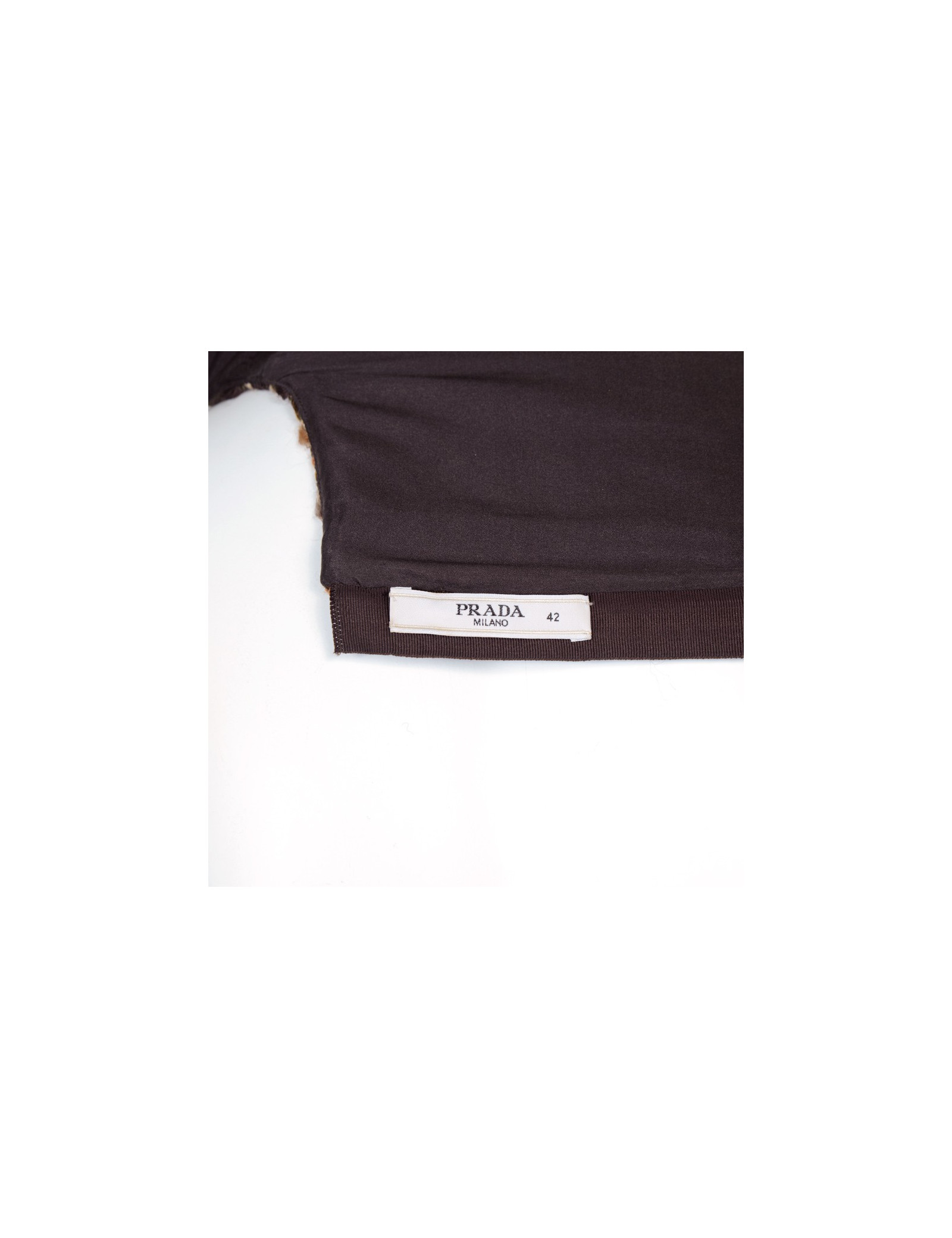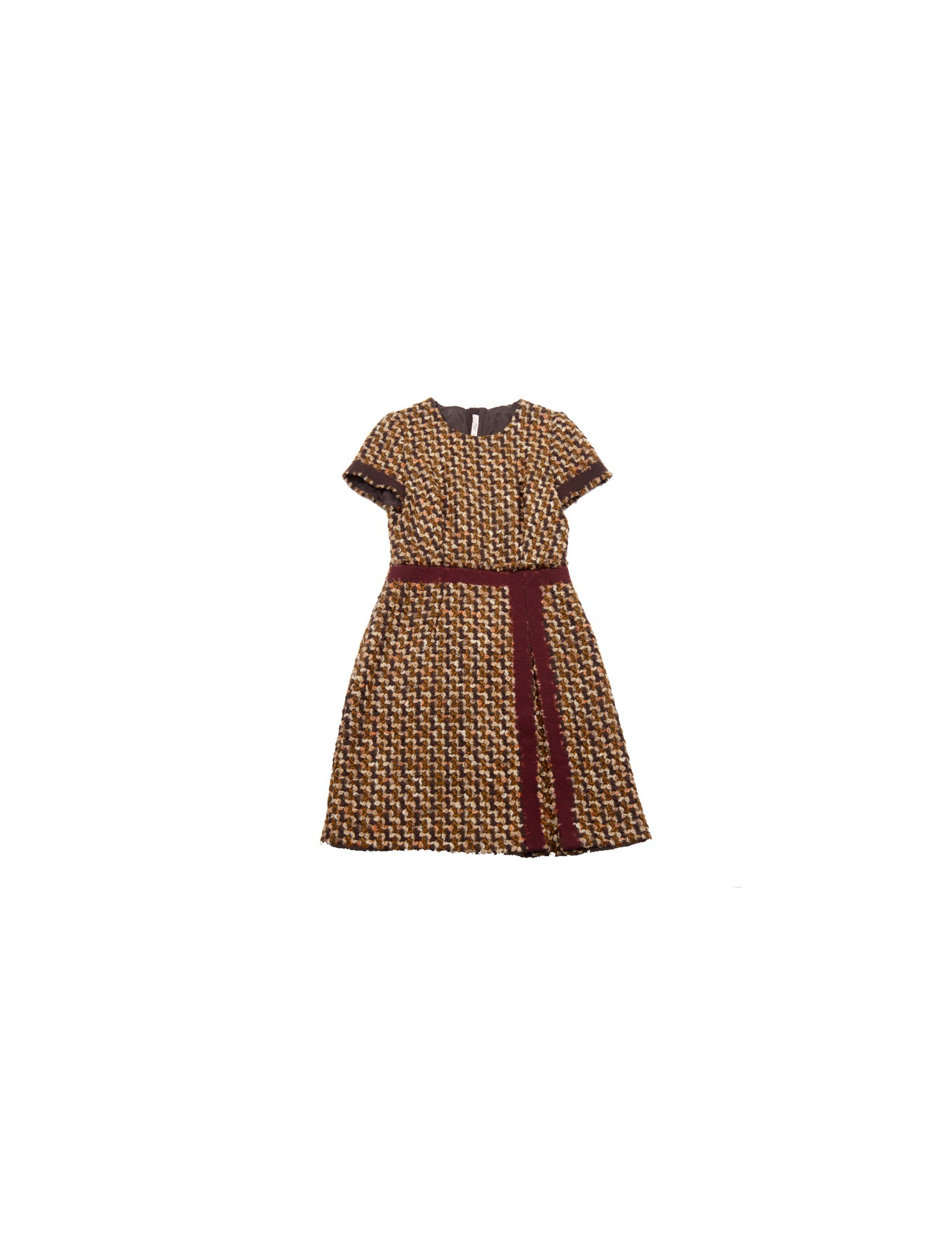 Dress Prada knee wool in shades of Brown. Size 42 Italian, is equivalent to a 38 french. Wool Brown tweed with a plum pattern dress. Short sleeves. Zip at the back of the dress. Silk lining. The dress form flared as well as a slot on the front fold.