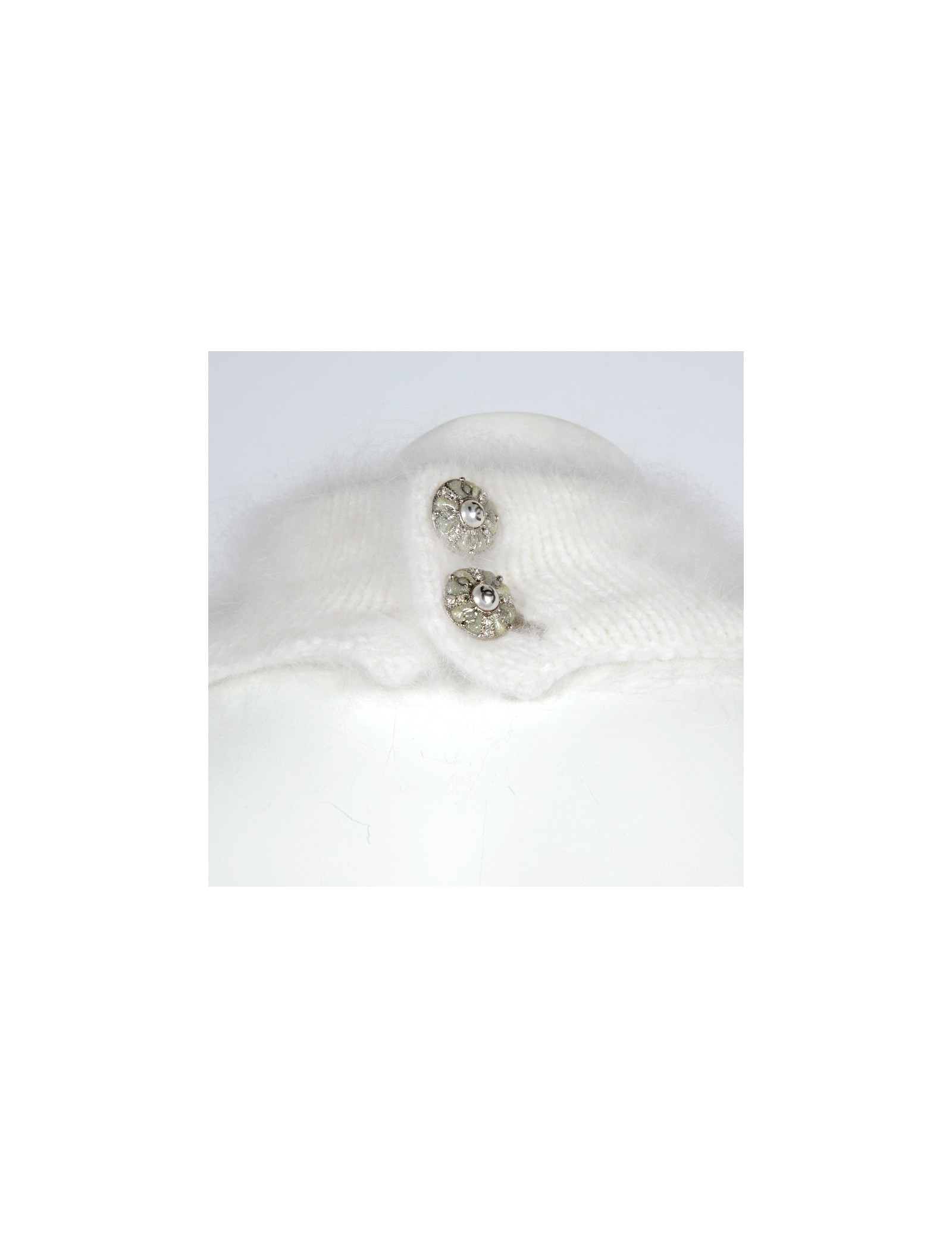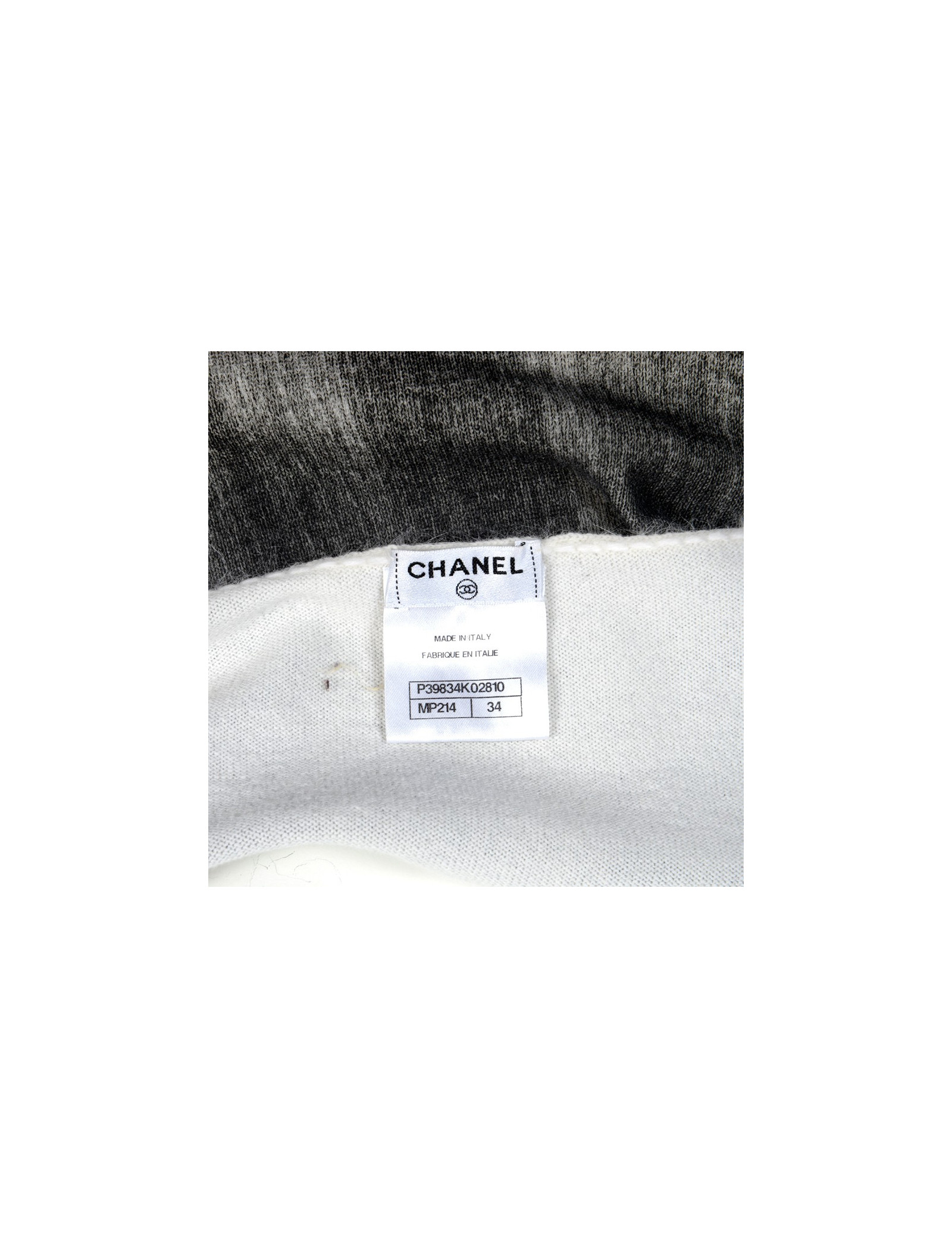 Sublime robe blanche et grise de la maison Chanel taille 34 en cachemire et angora issue du prêt-à-porter hiver 2010. C'est une robe dos nue, elle se ferme au col par deux sublimes boutons argentés incrustés de pierres et brillants. Elle est en très bon état.