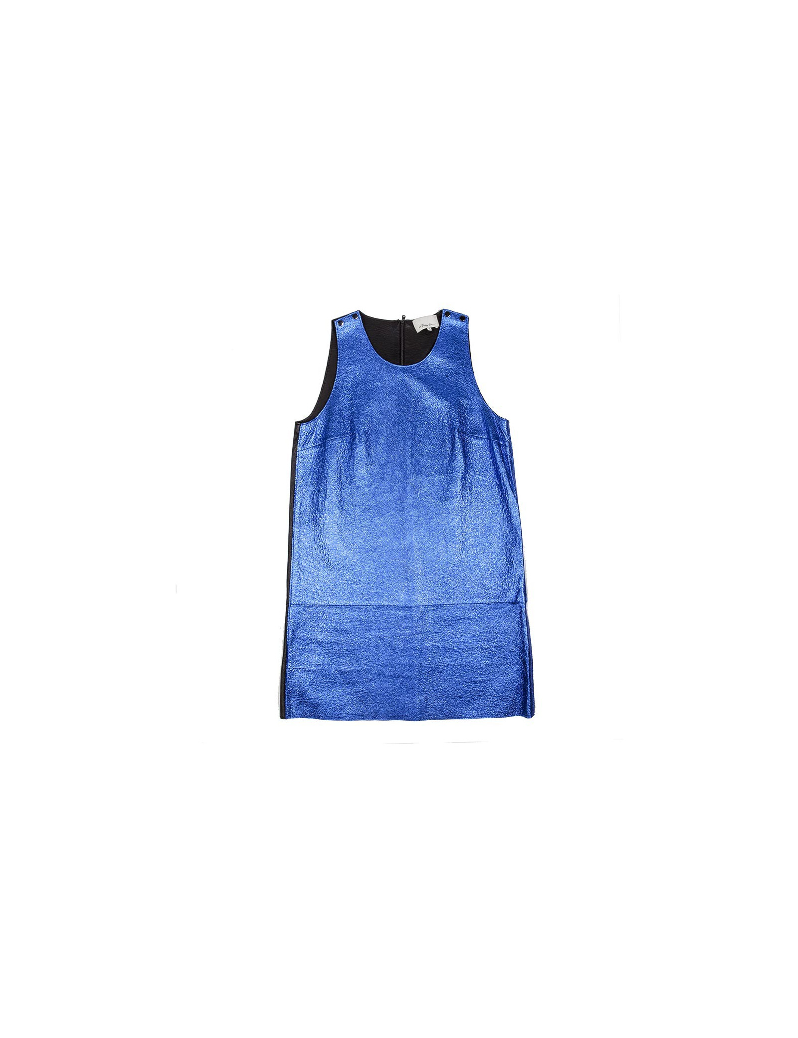 Dress size 8 US / 40 FR, sleeveless full grain soft leather. Electric blue metallic dorsal closure zippered, adorned with a pair of metal studs on each shoulder. The back is black soft leather. In very good condition.