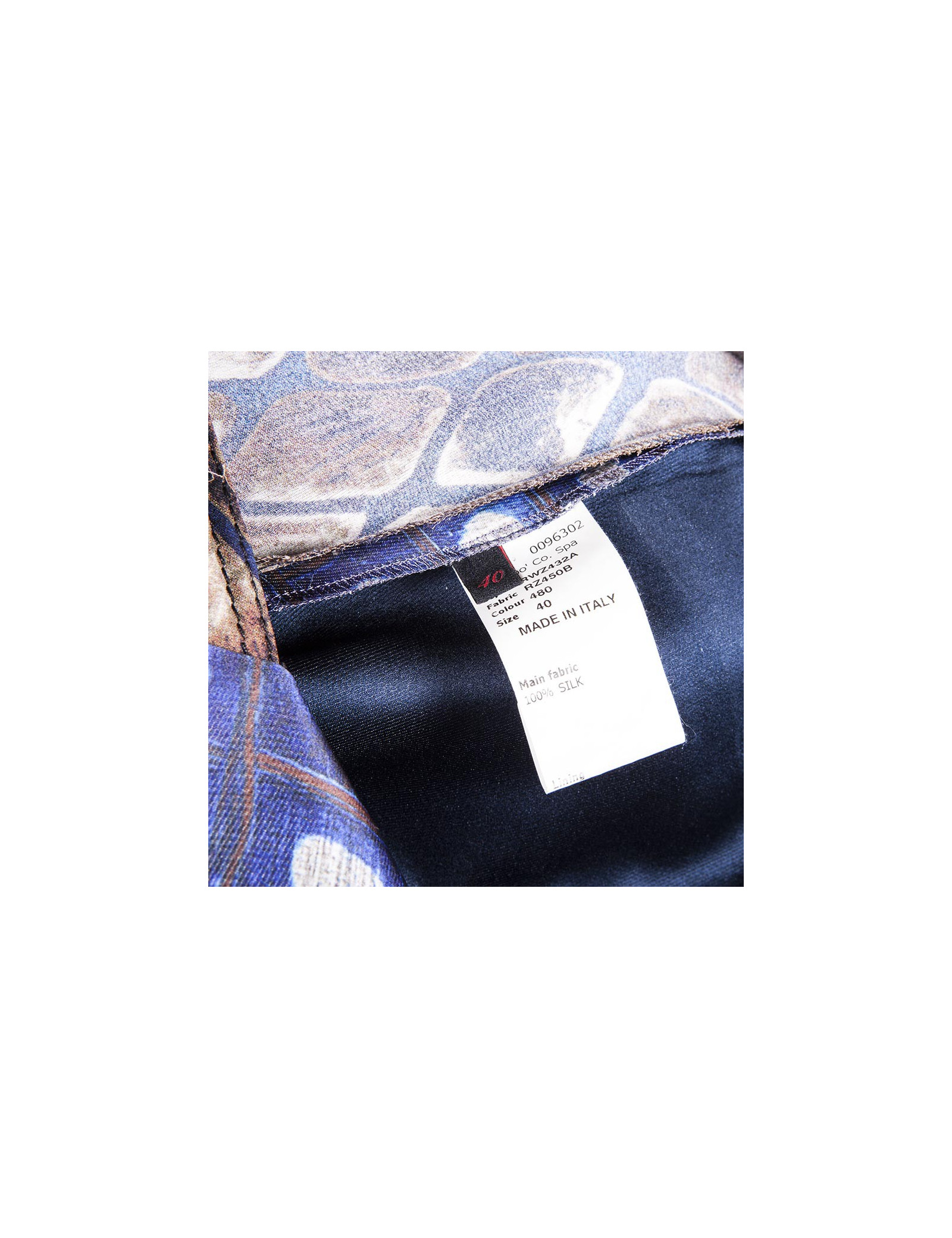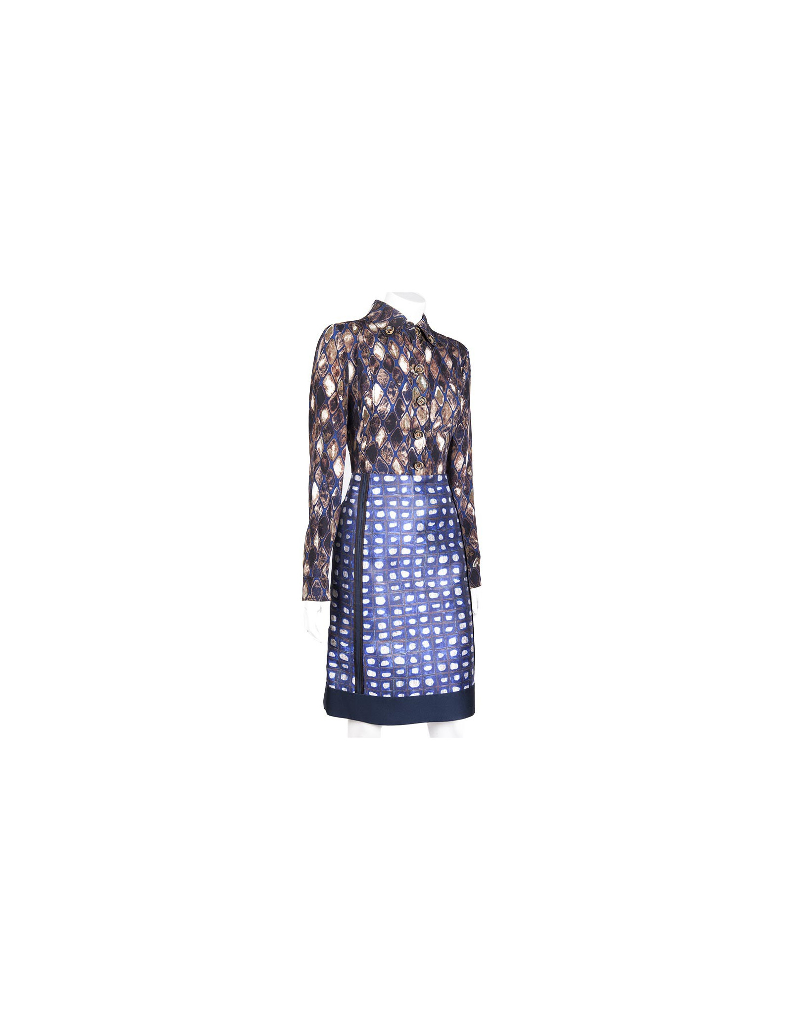 The top of the dress is in a different fabric in silk, giving the illusion of a blouse. Horn buttons. Colors: blue, Brown, beige, gray.