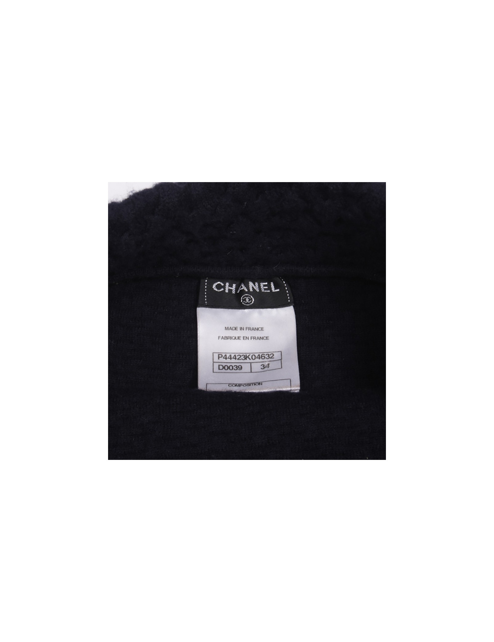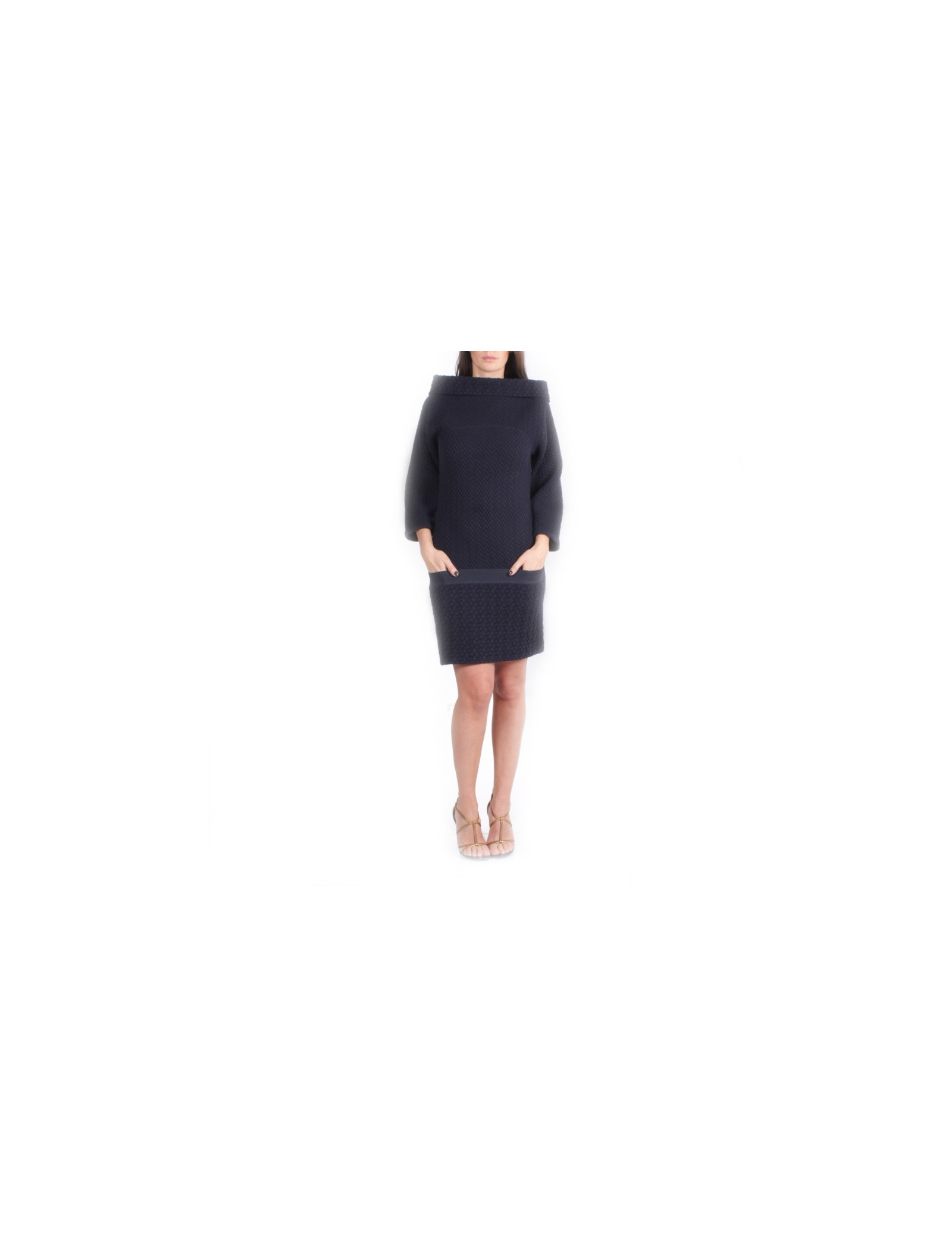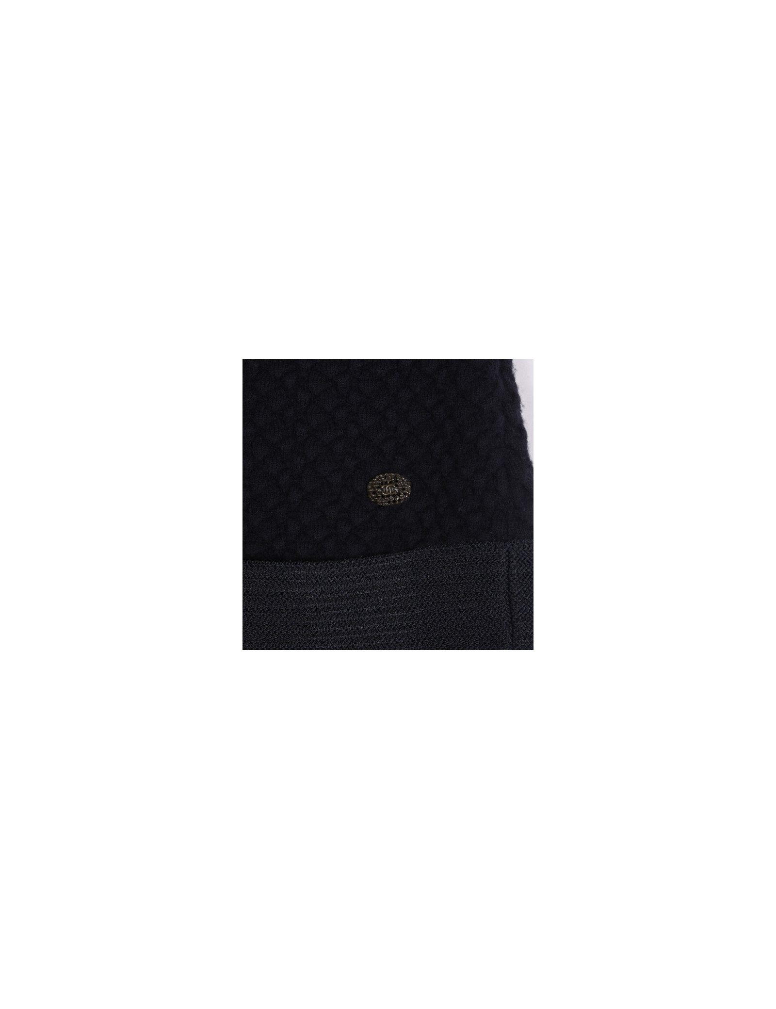 Robe Chanel bleu marine en laine stretch, col bateau à manche 3/4,