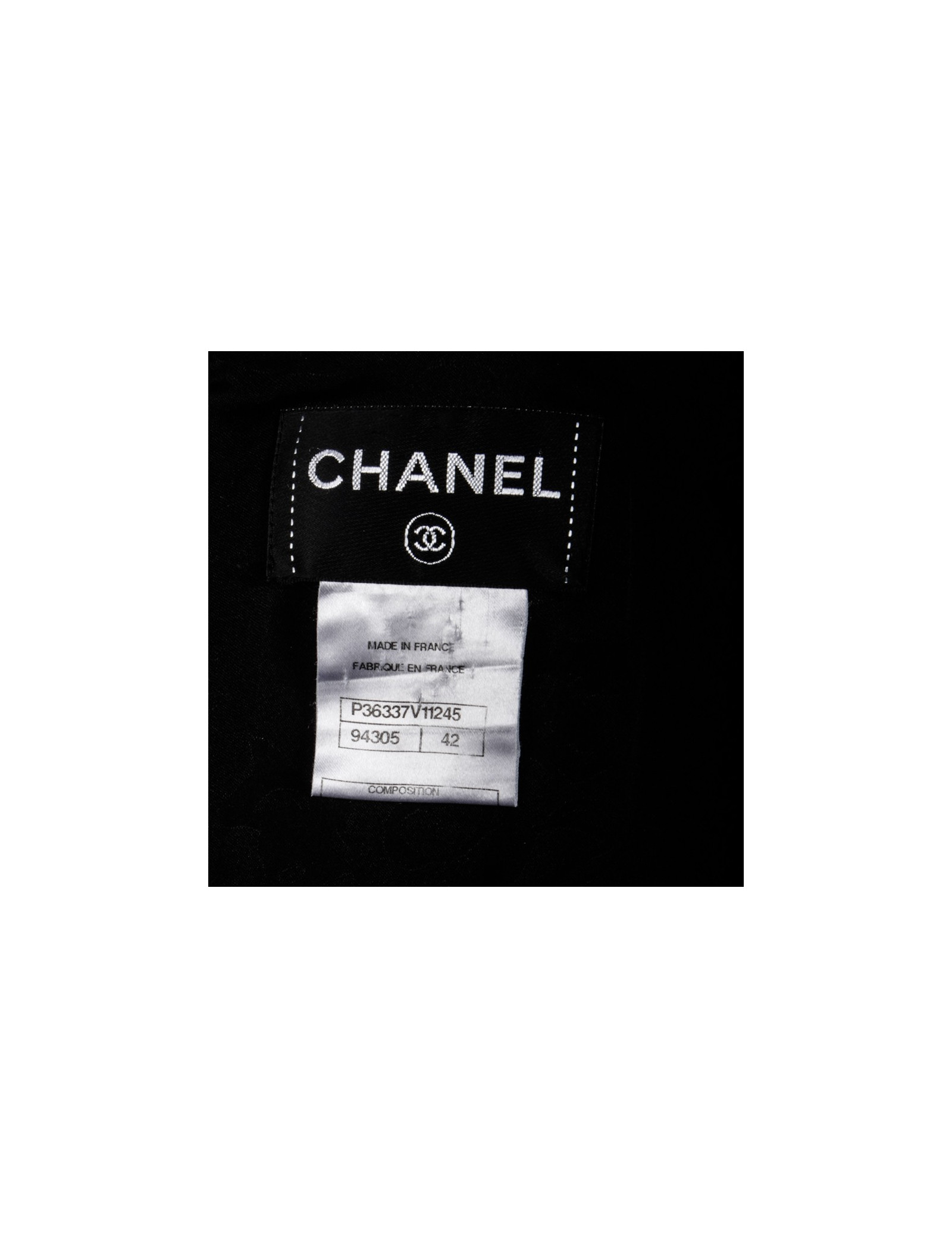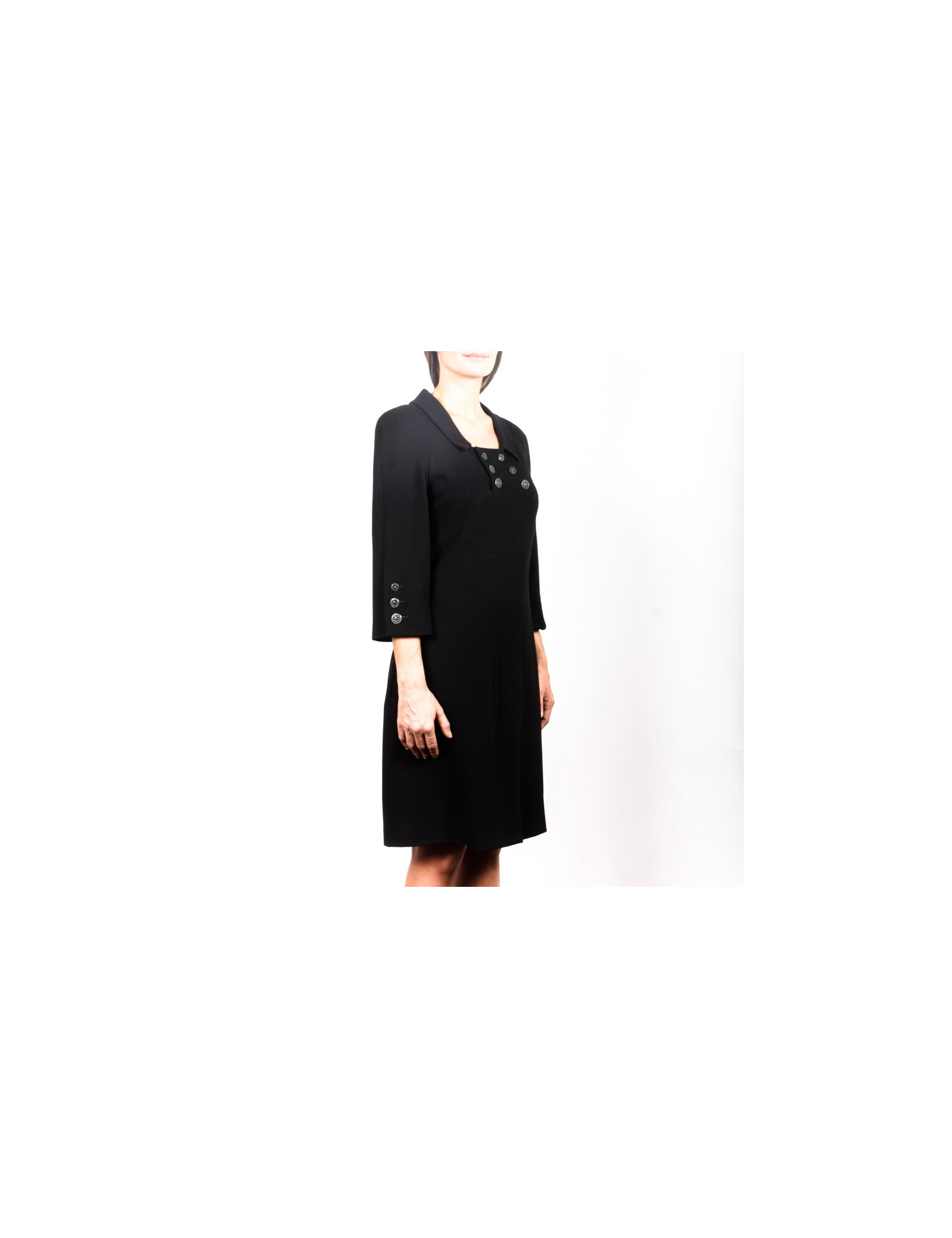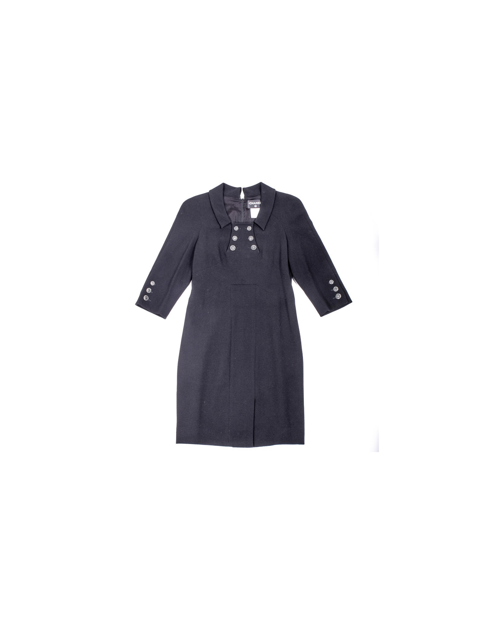 Dress Chanel Black wool with cuts and 2 vertical pockets on the sides. < br / >It is decorated with 6 buttons at the neck in front of black metal < br />It closes with a zipper in the back. The sleeves are 3/4. < br / >The lining is black silk with Camelia, CC and Chanel signature patterns. In very good condition. < br />Flat dimensions: width shoulders 44 cm. chest 47 cm. Size 42 cm. hips 52 cm. < /p >
