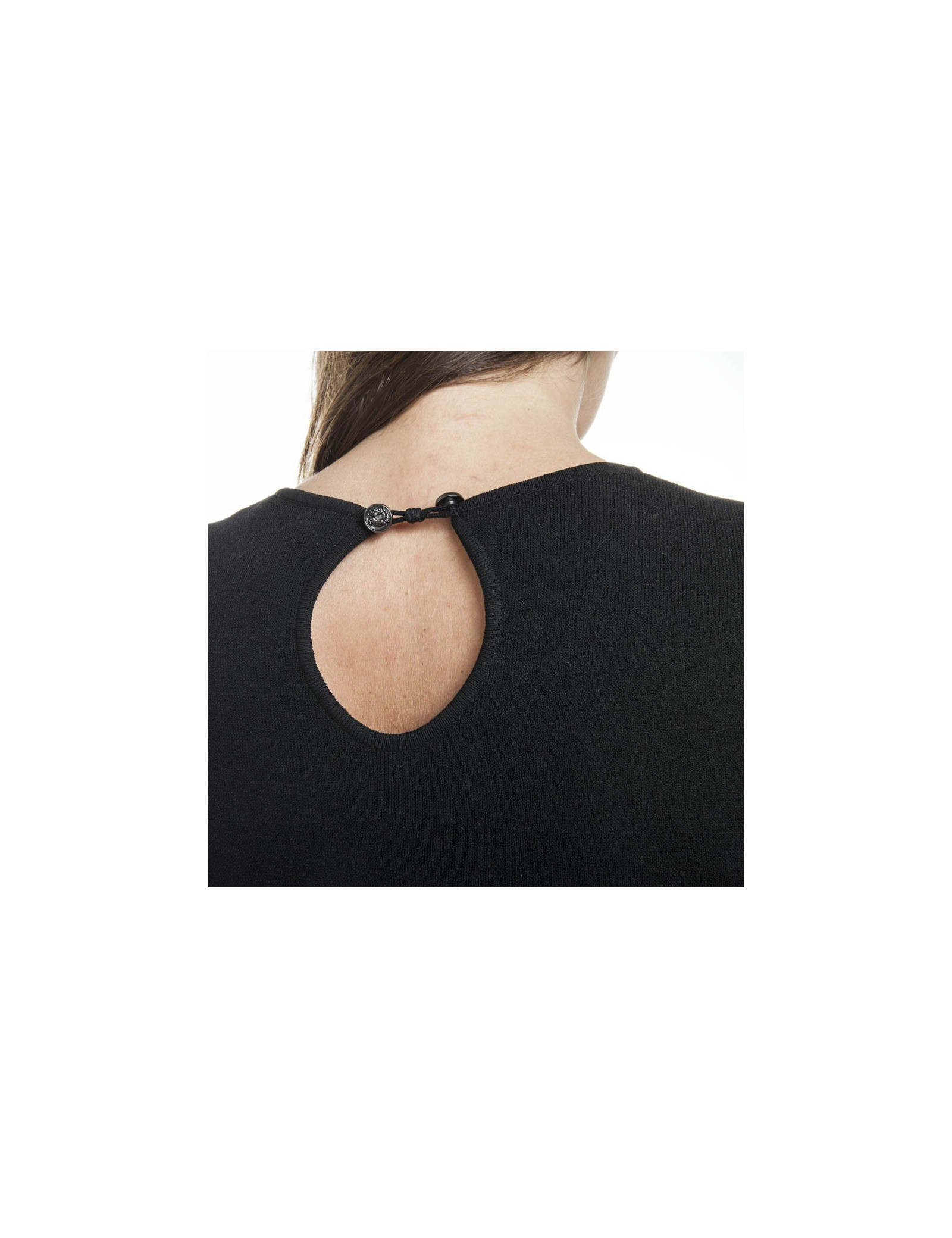 Closing using two buttons in the back. Round neck. Stretch material. < /p >