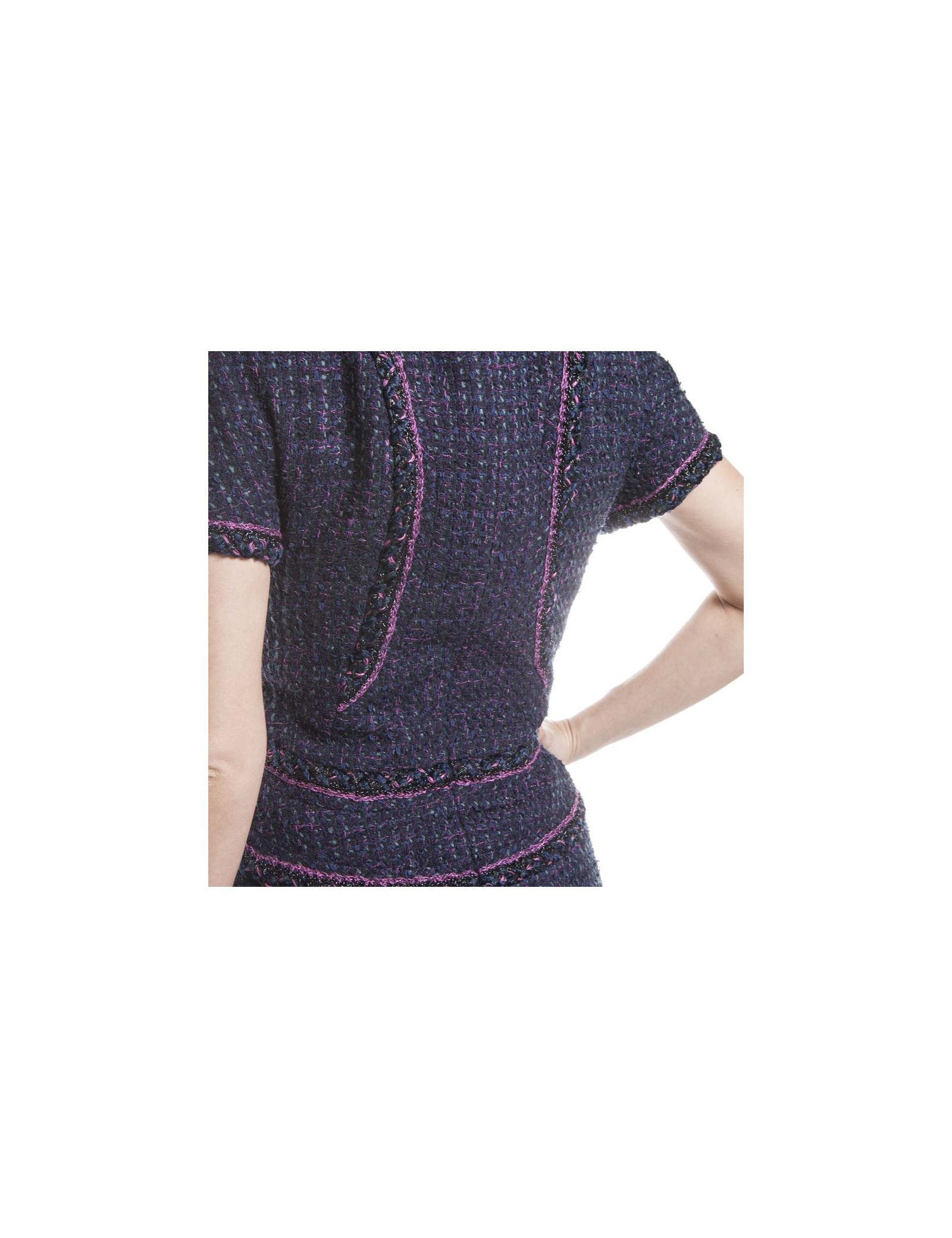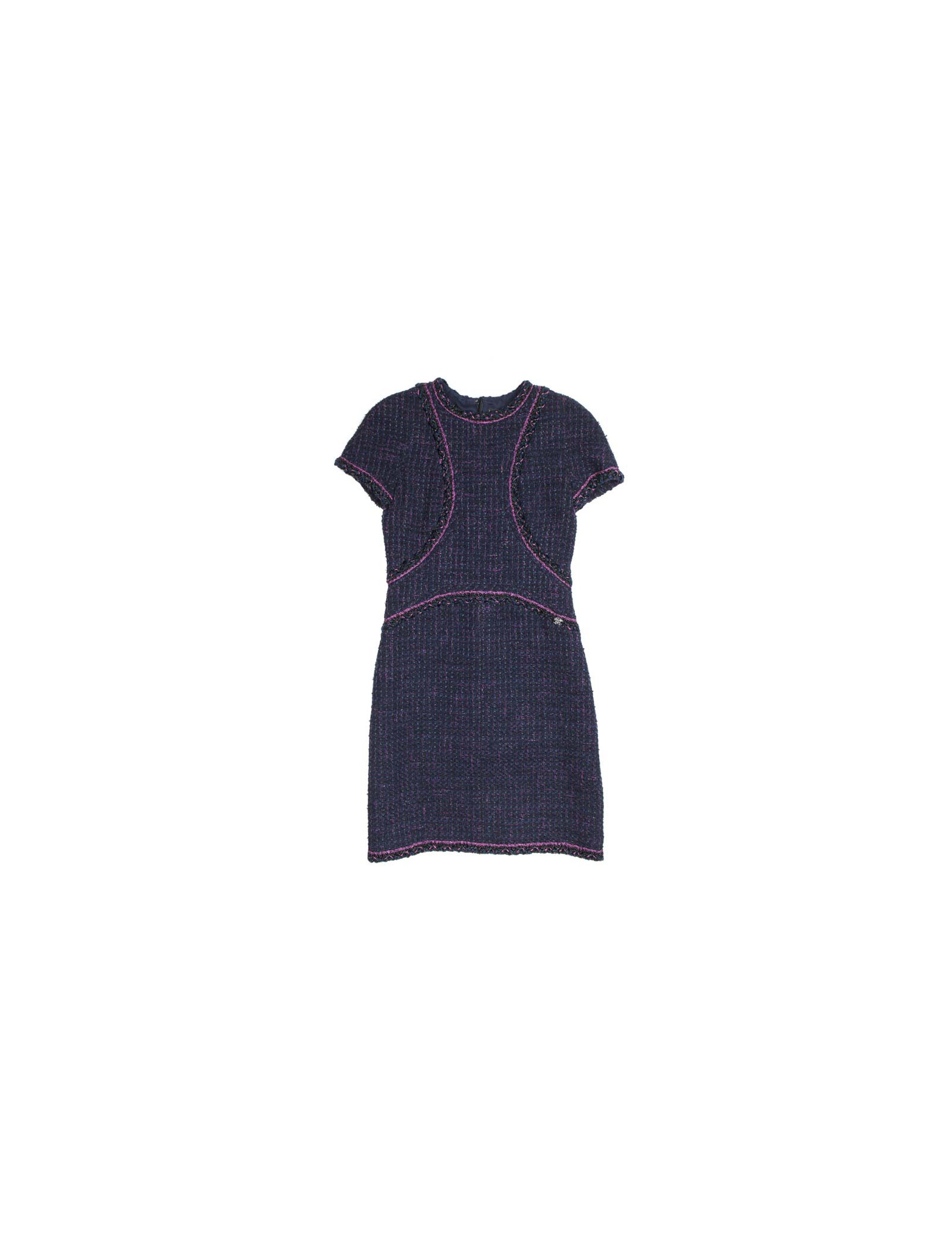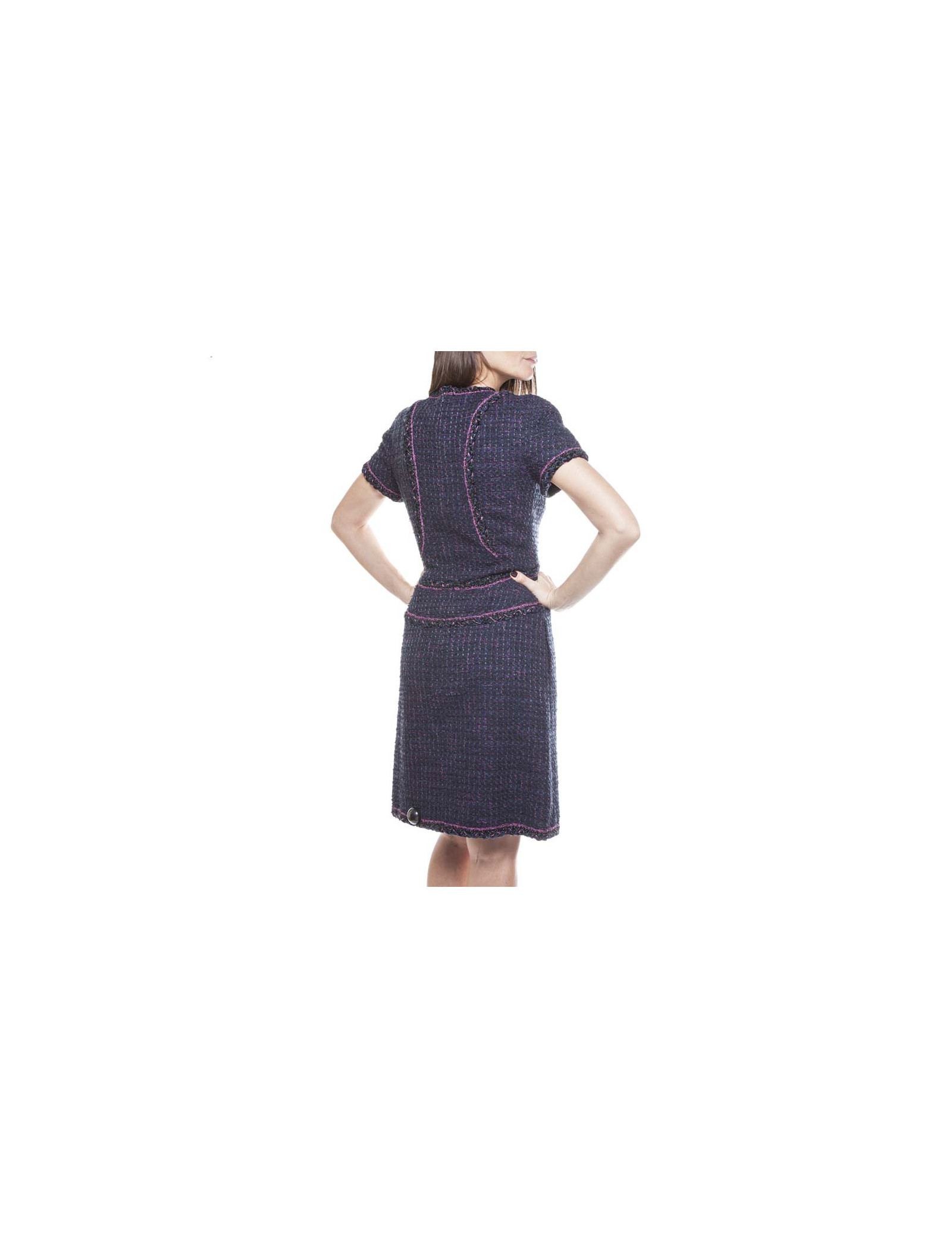 Robe Chanel en tweed bleue, laine et coton, gansée de fushia et fils noirs brillants, T 38.