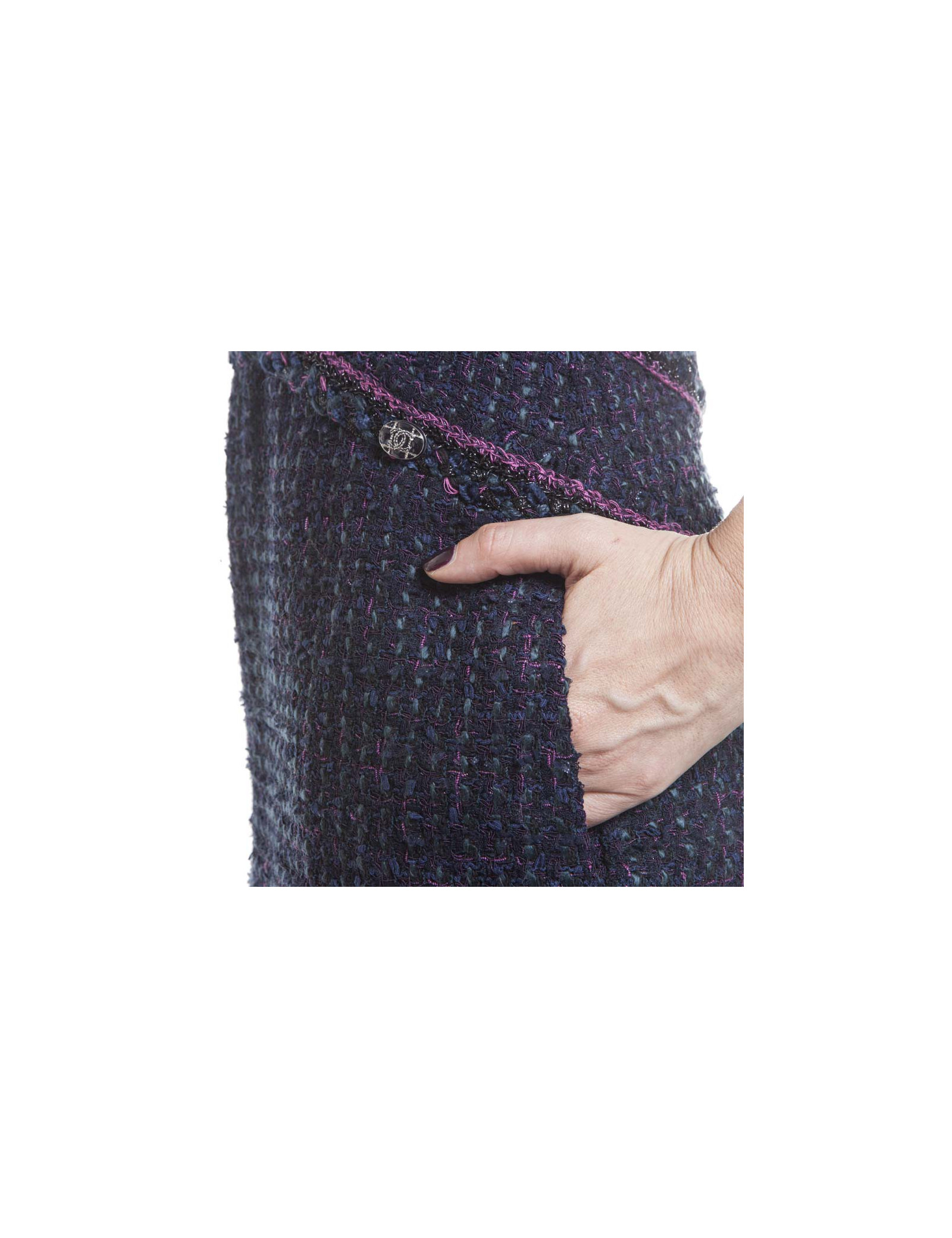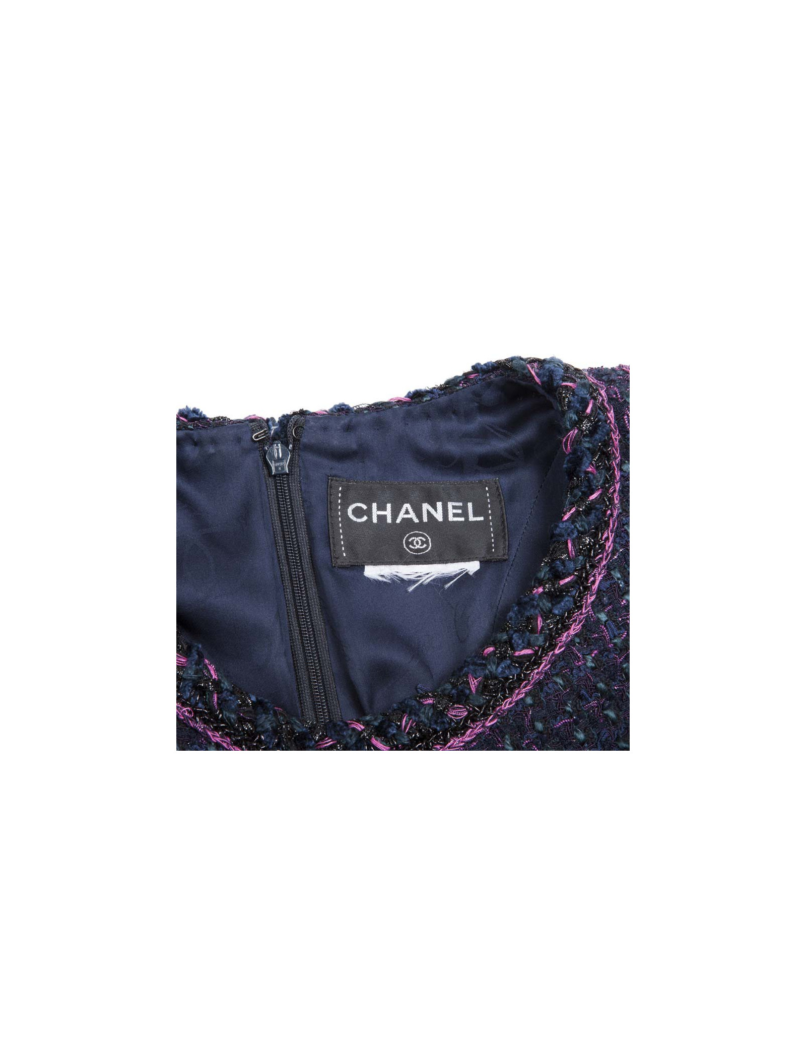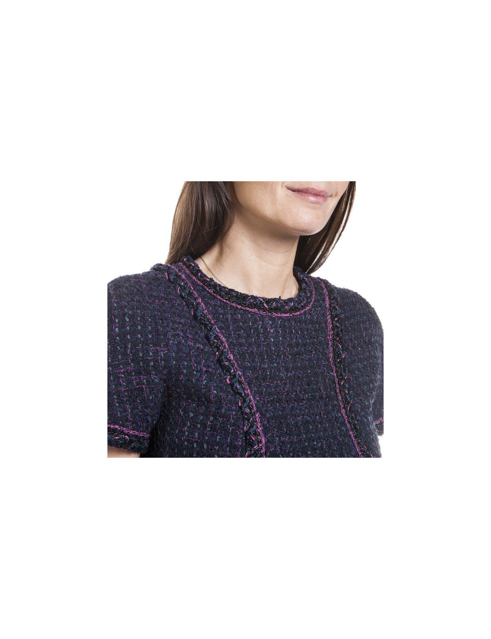 Robe Chanel en tweed bleue, laine et coton, gansée de fushia et fils noirs brillants, T 38.