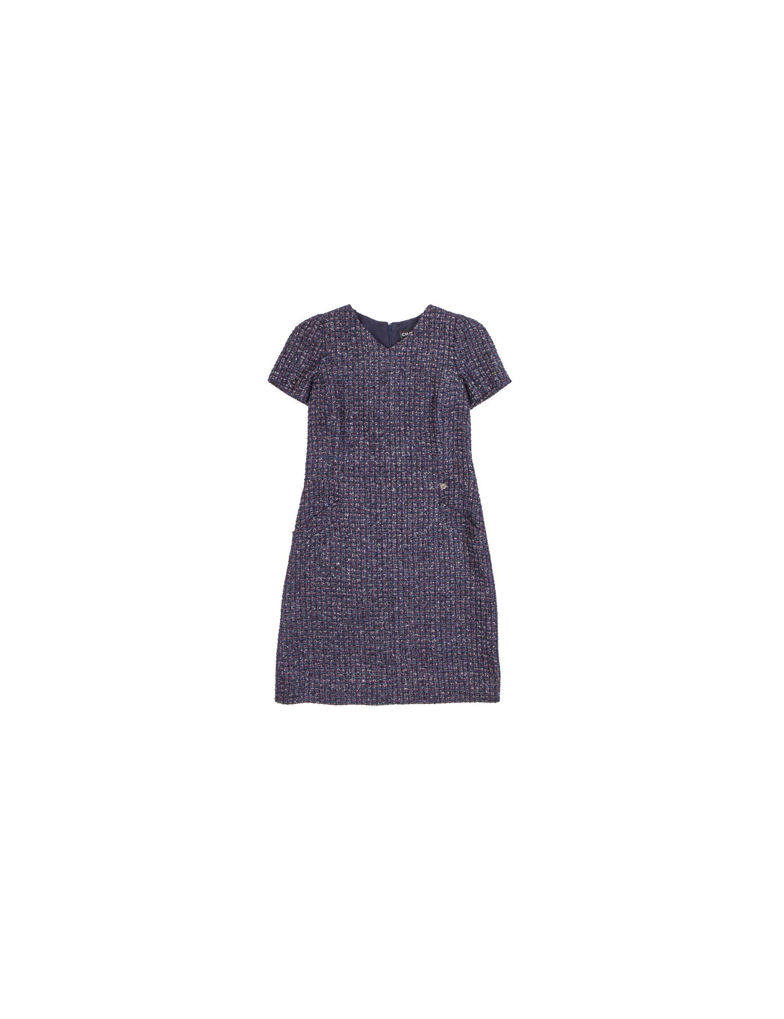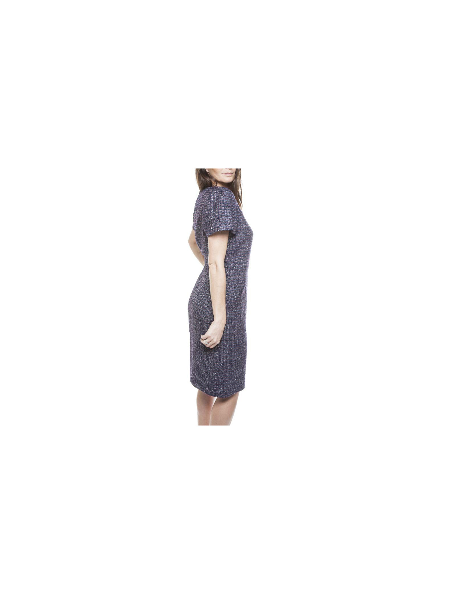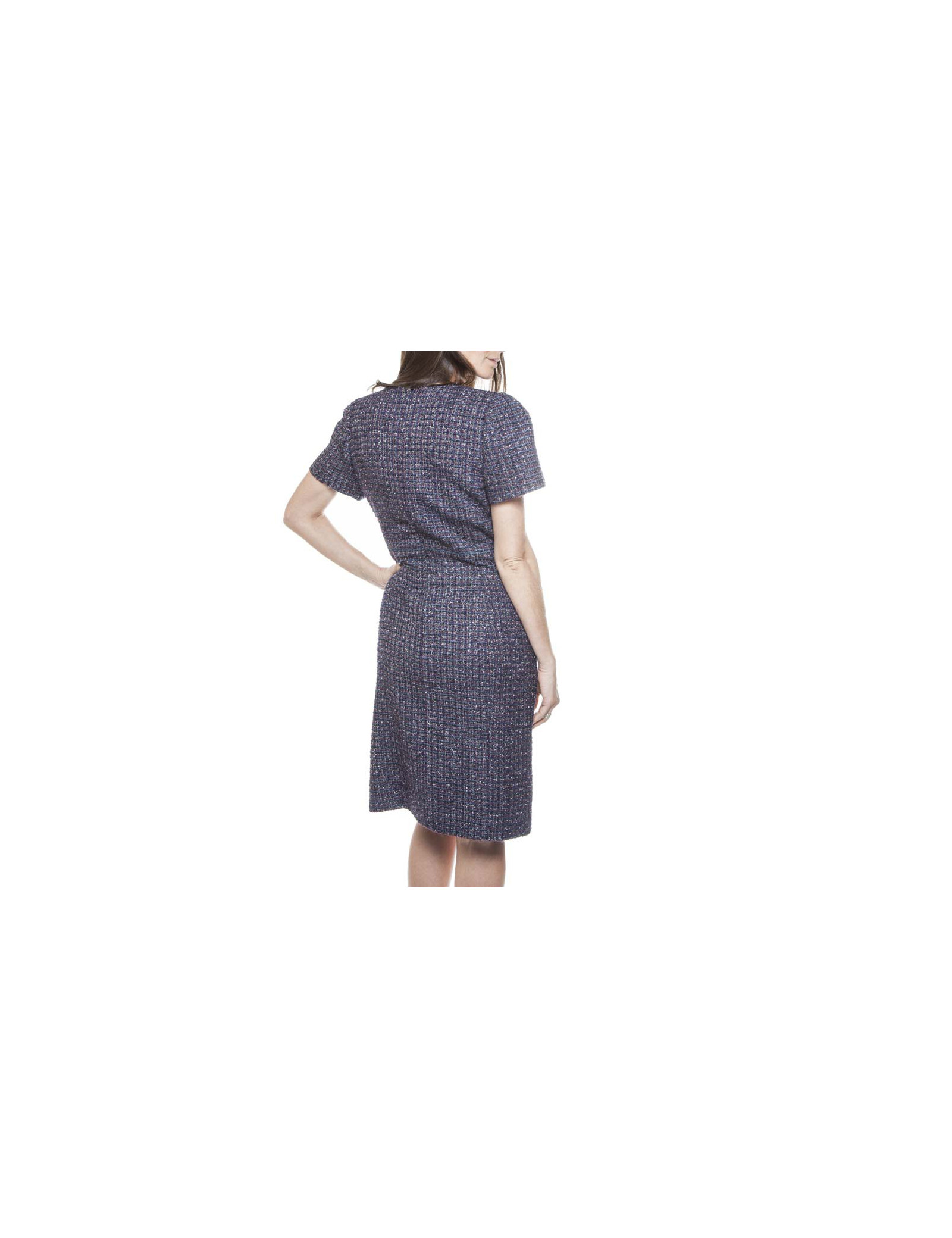 Dress Chanel Tweed purple, green, Navy Blue and silver T 42 short sleeve polyester lined silk monogram with two pockets on the front in very good condition. the size is marked by a band of tissue.