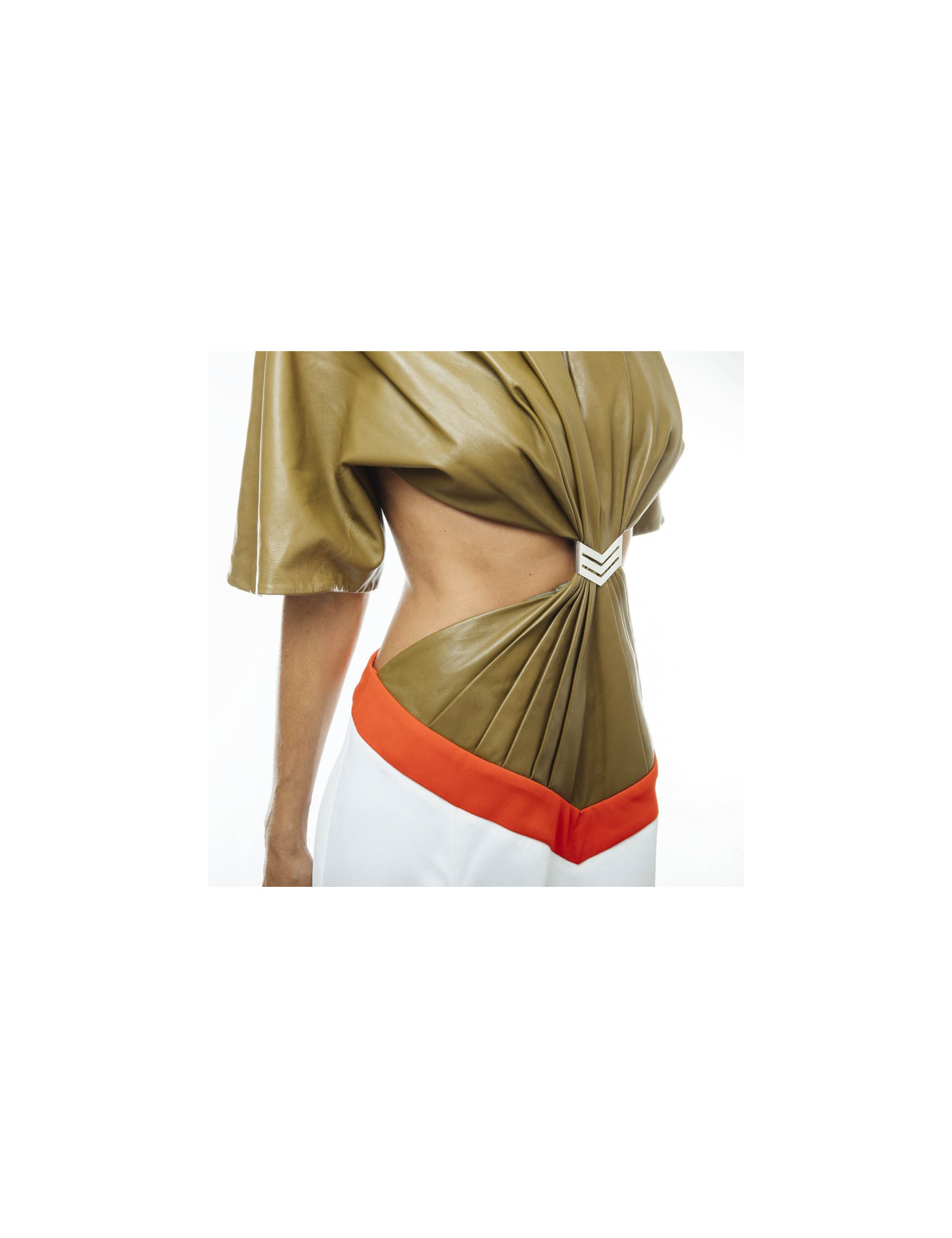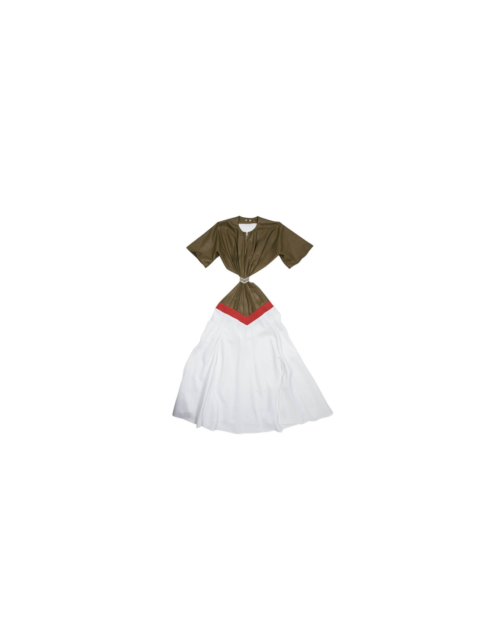 Zipped at the back, the semi-circular cut of the white skirt gives to the dress the flexibility and lightness of an elegant summer outfit. The bust is in smooth smooth lambskin khaki. There is a silver zipper and closes at the back by two pressures. it has a V belt stitched bright red.